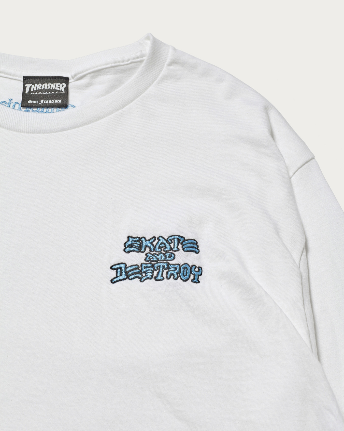 A custom T-shirt from Thrasher featuring a smaller embroidered Destroy logo on the left chest. The coloring is original to California General Store, and the back of the neck features the brand's logo. The design captures the essence of skate culture while ensuring it's suitable for adults to wear comfortably.