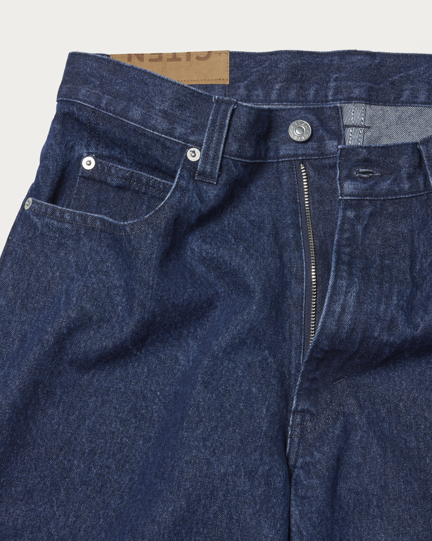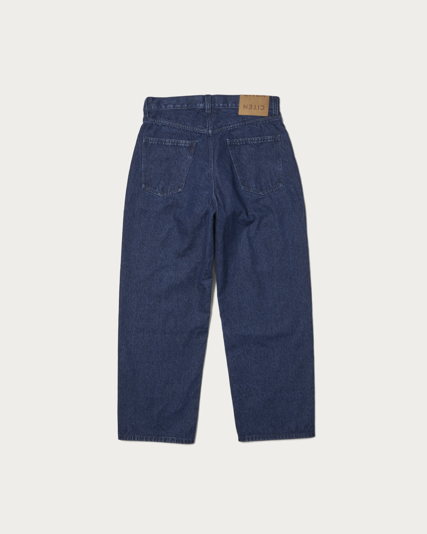 Baggy silhouette denim pants made from distinctive 12-ounce denim fabric with a textured feel. The waist area is designed to be slightly tight, and the inseam is crafted to form a clean cocoon silhouette. The CITEN patch above the back pocket has also been updated. You can wear it as a set with a matching jacket made from the same material.
