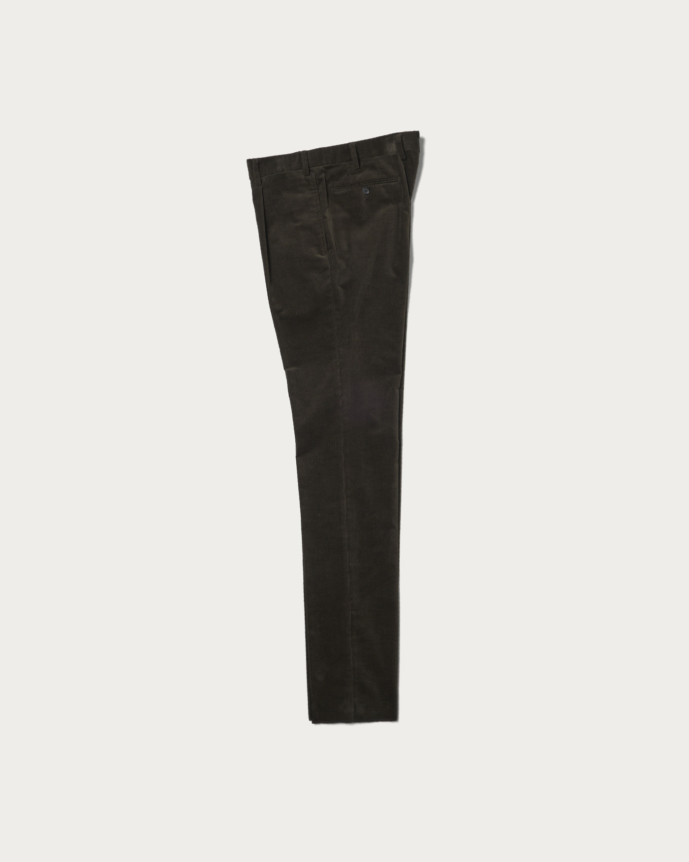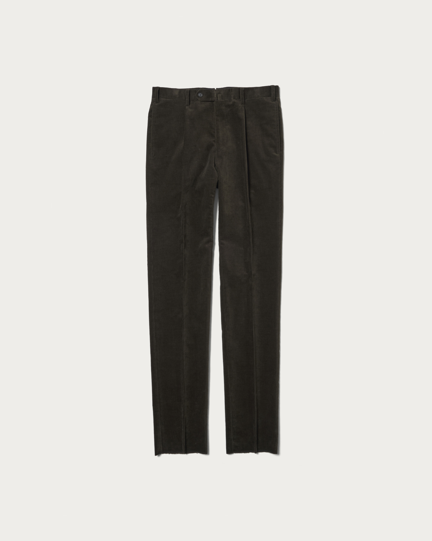 A well-balanced pair of pants with a single-pleat design that provides just the right amount of room, while keeping the hips and thighs neatly fitted. The gentle tapered line creates a modern straight nuance, maintaining a polished look while exuding a relaxed mood. The material used is fine-wale corduroy from the prestigious "VISCONTI" company. It boasts an elegant sheen and smooth touch, thanks to Italy's top-notch pile-cutting technology. A matching jacket made from the same fabric is also available, making it ideal for wearing as a set.