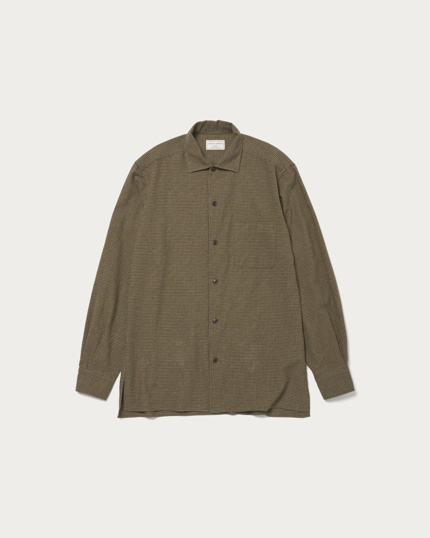 A standout feature of this over-shirt is its soft dress collar and the slightly deeper slit in the square hem. The dress collar creates a three-dimensional volume around the neck, offering a relaxed and effortless look. The fabric used is a block check material from the renowned Italian shirt maker "ALBIATE." The intricately overlapping colors create a rich and deep appearance. It is not too thick, has a slightly brushed soft texture, and offers a comfortable wearing experience.