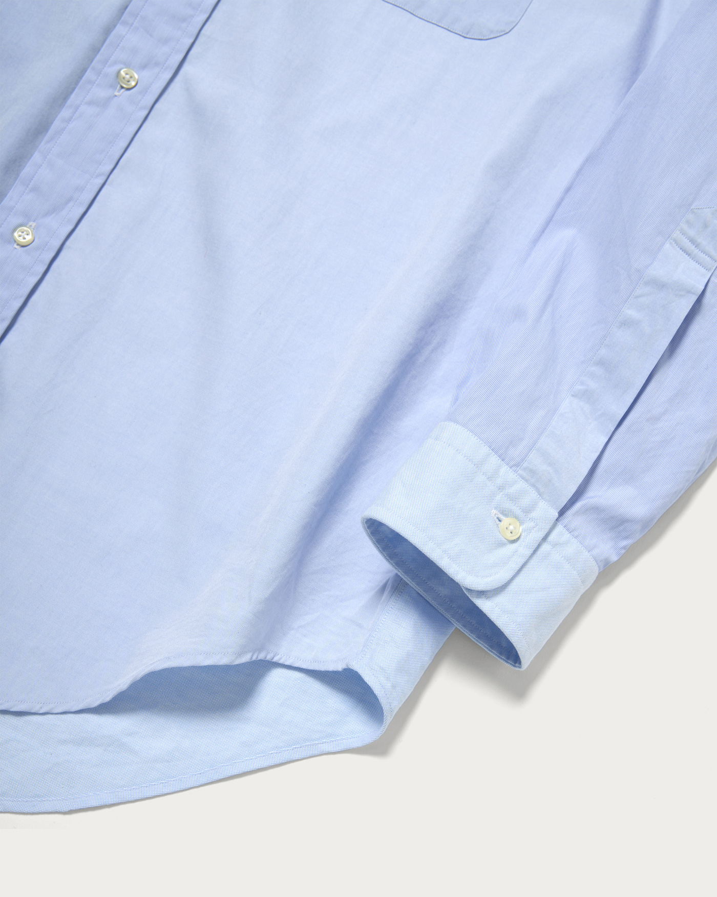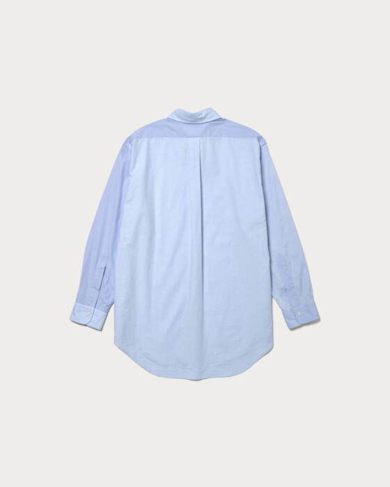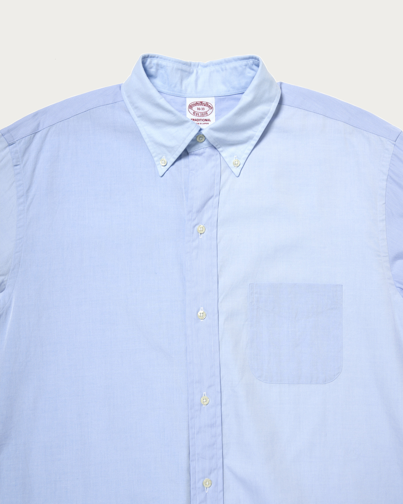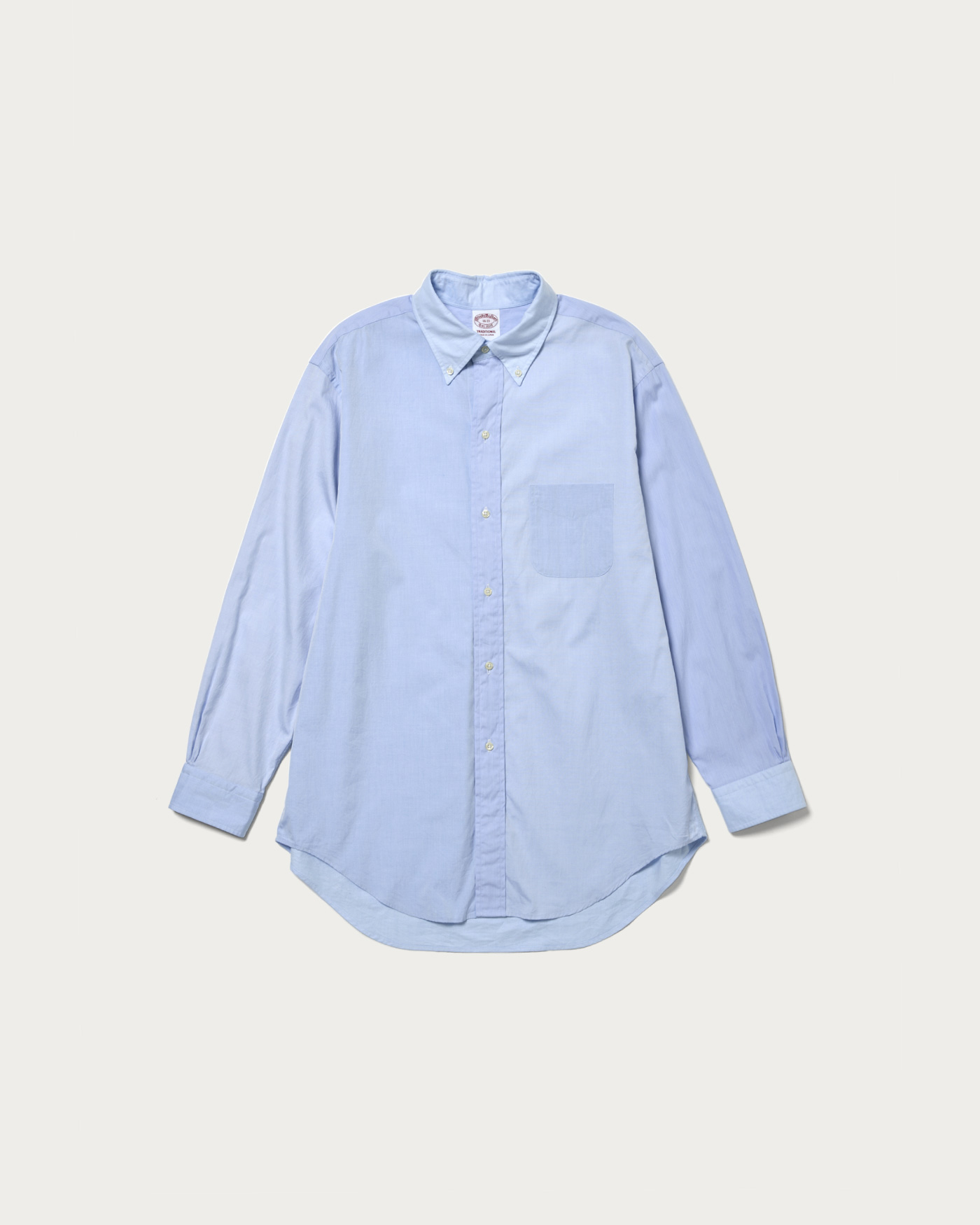 The "Fun Shirt" from Brooks Brothers is known for its unique construction, combining multiple different fabrics. The eagerly awaited third installment of this item, previously released as a special order, is now available. This season, it features a combination of four types of fabrics: refreshing blue-toned Oxford, pinpoint Oxford, broadcloth, and hairline broadcloth. Despite its crazy pattern, the shirt is cohesively designed, resulting in a piece that tickles the playful spirit of adults.