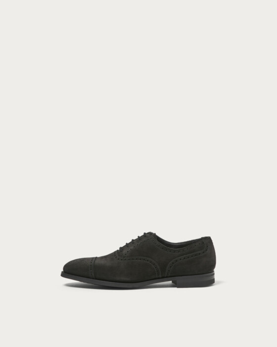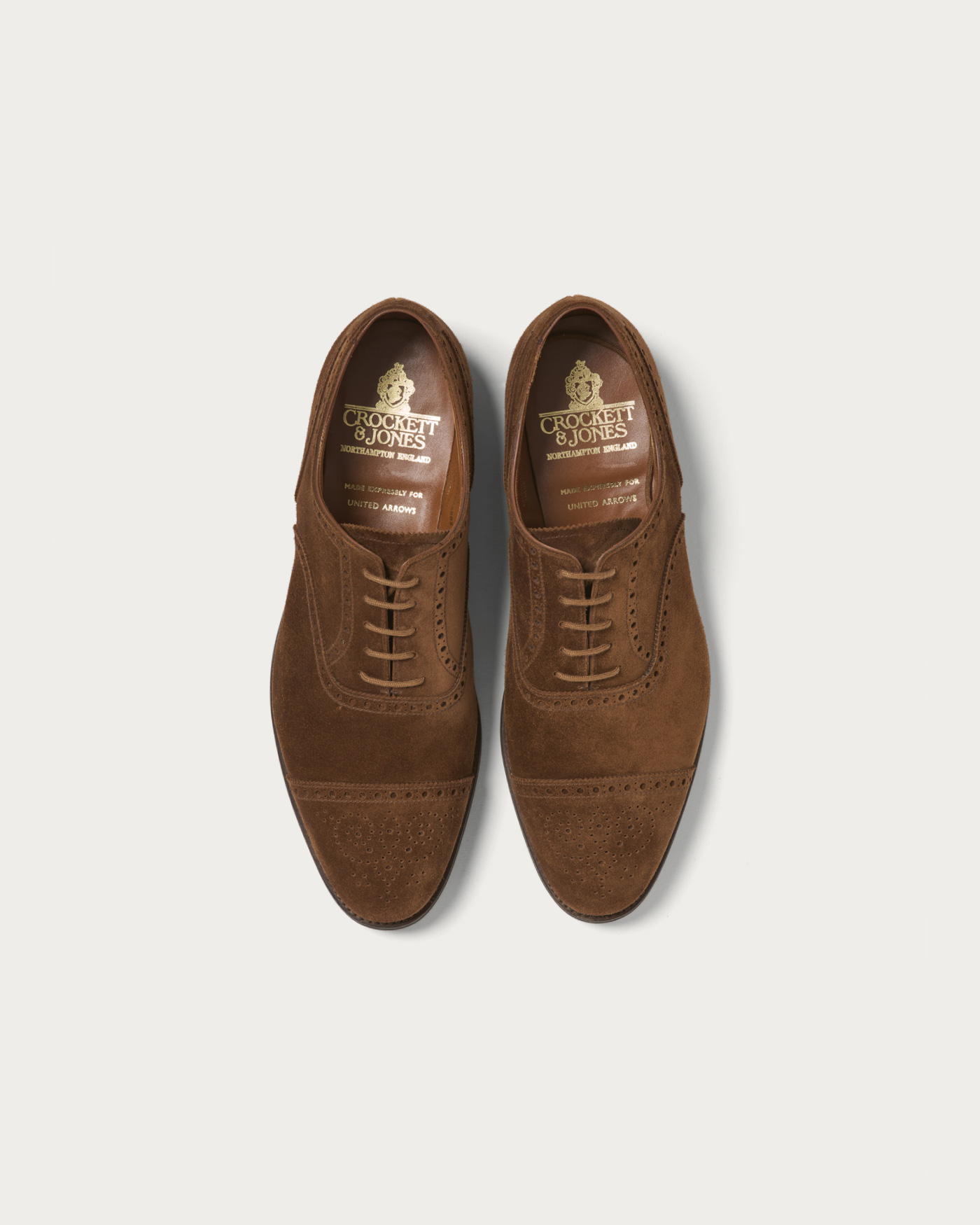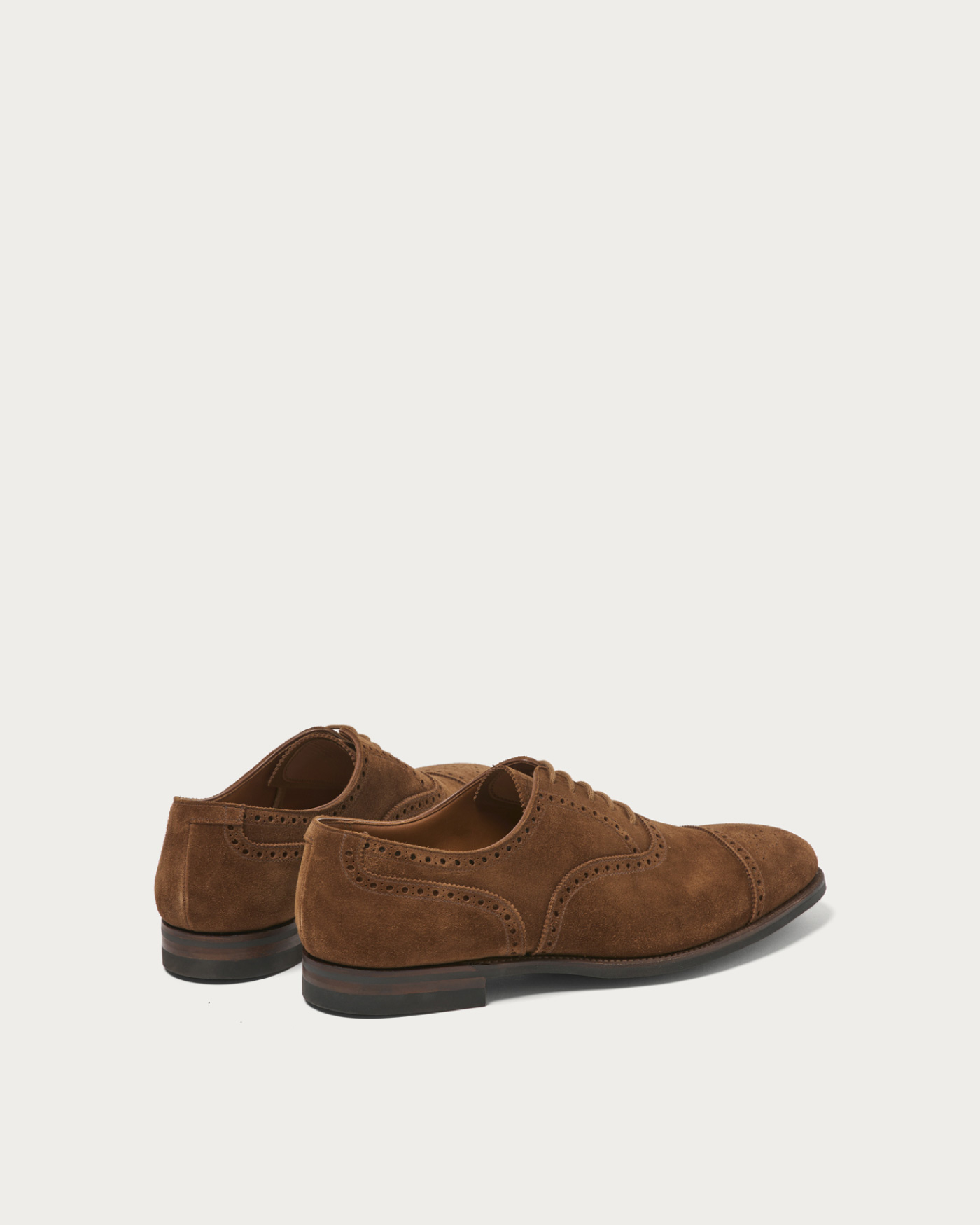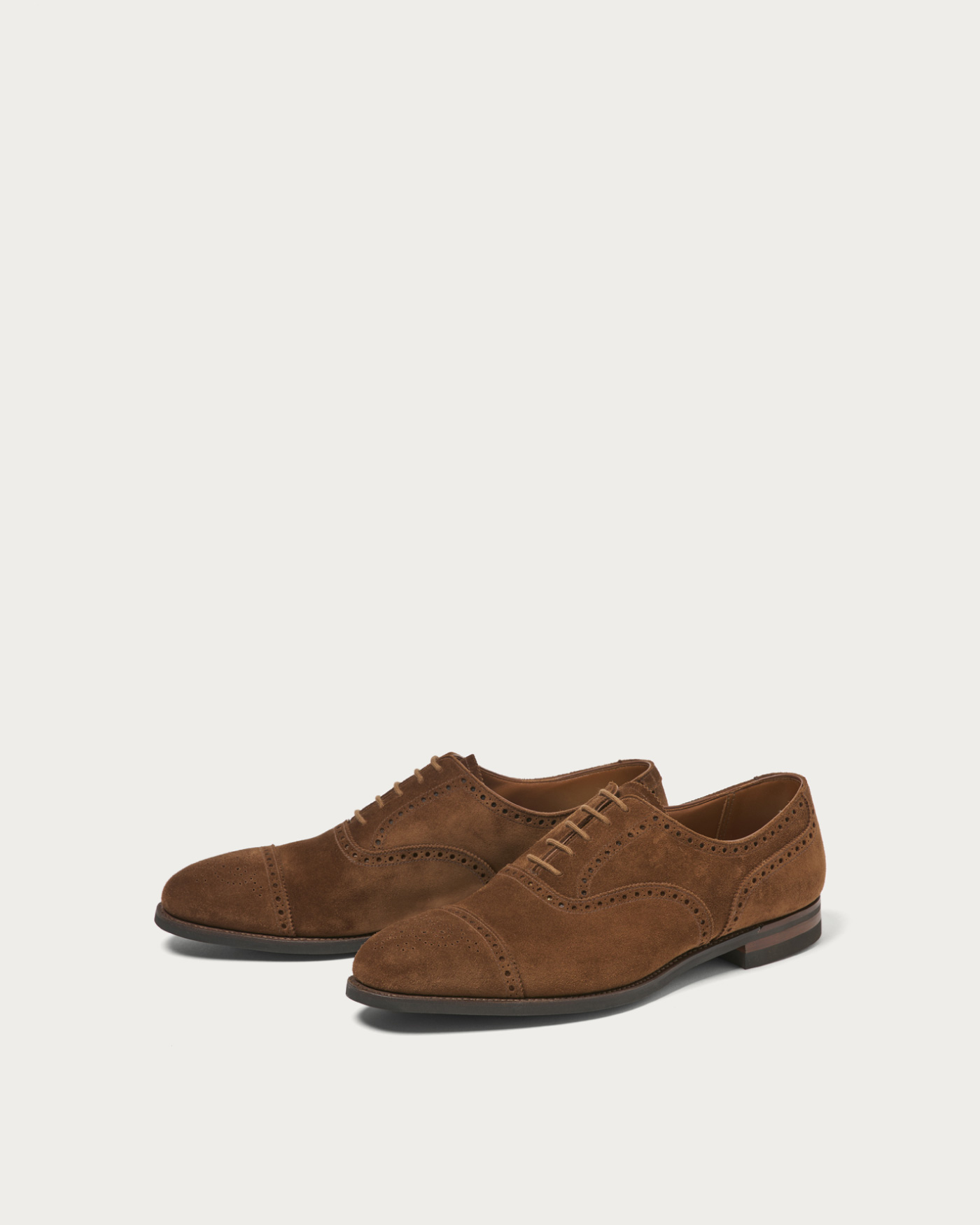 The "Westfield" is a semi-brogue shoe with a classic British style. It features the "Last 379," which has a tapered waist and a smaller heel cup. This design balances a classic mood with a modern fit. The upper is made from high-quality, supple calf suede.