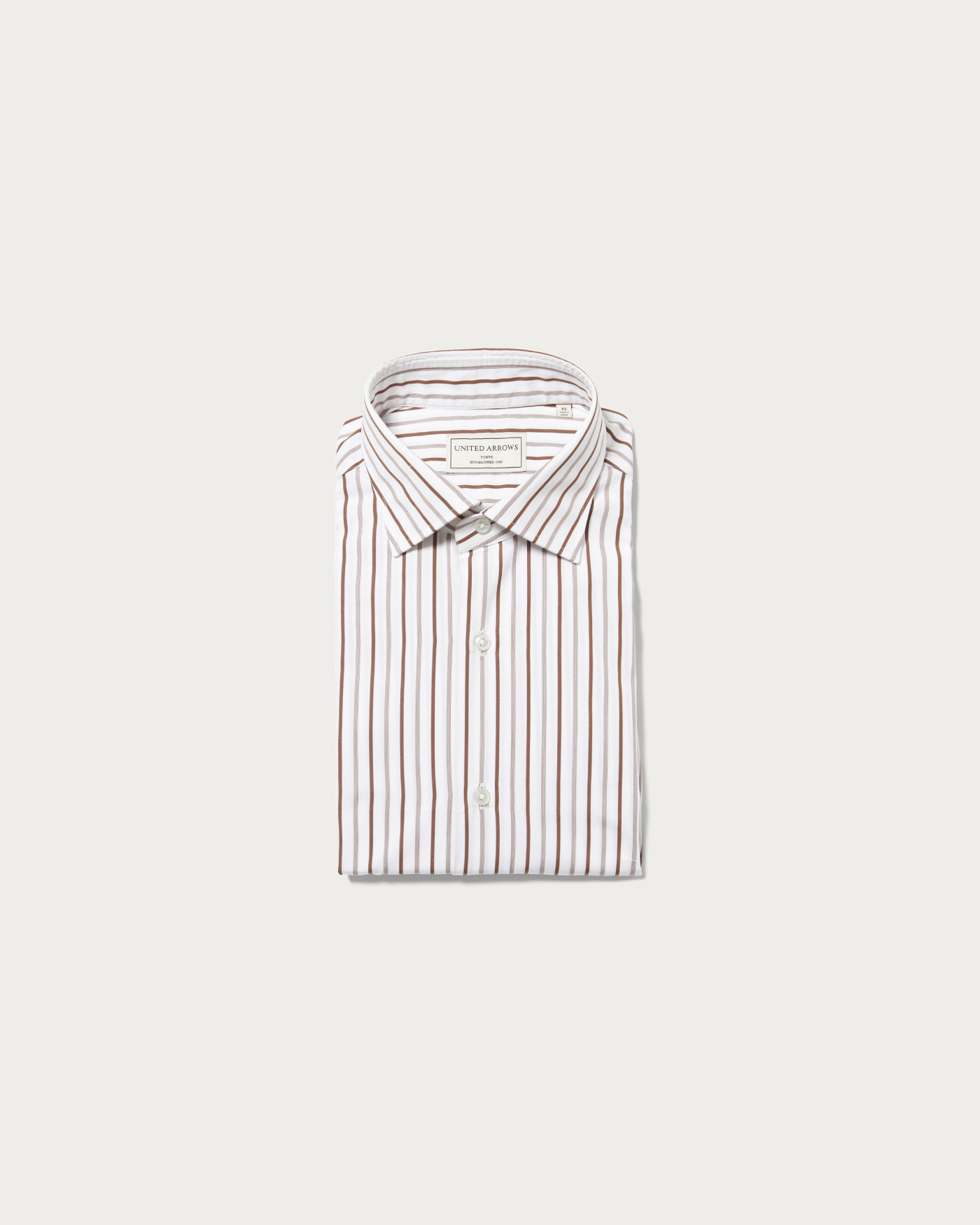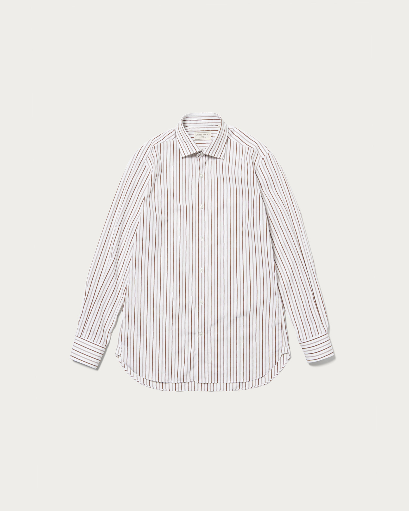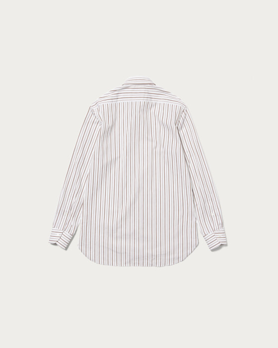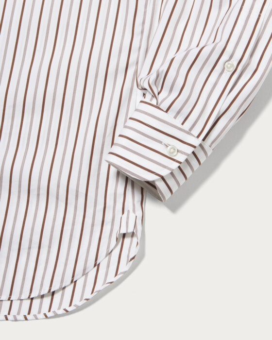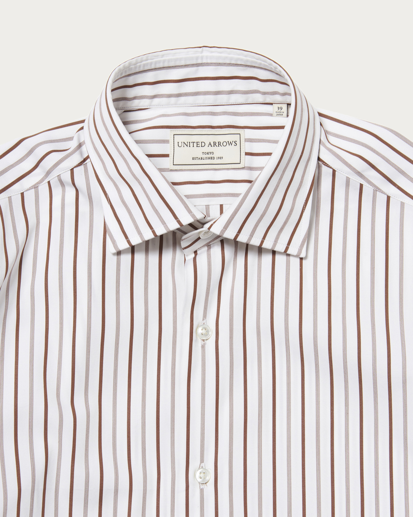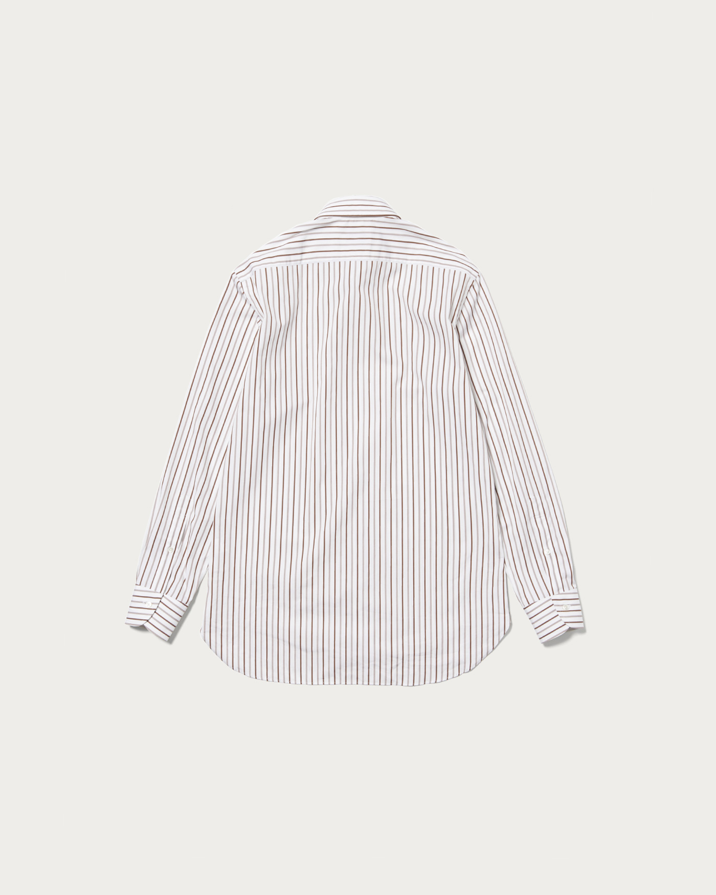 A basic semi-wide spread collar shirt. It features a no-tuck back style with a gently tapered silhouette from the chest to the waist for a clean look. The material is an alternate stripe in brown tones using "THOMAS MASON," giving it a distinct British-inspired appearance.