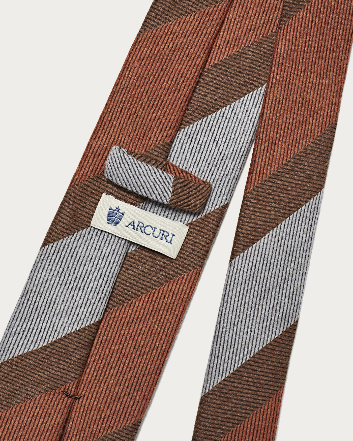 A refined and elegant attire is complemented by an 〈ARCURI〉 tie. The unique texture of wool pairs beautifully with fall and winter materials like tweed and flannel jackets, as well as suede shoes. It blends particularly well with brown-toned suits and jacket styles, creating a seasonally appropriate V-zone.