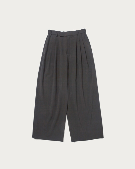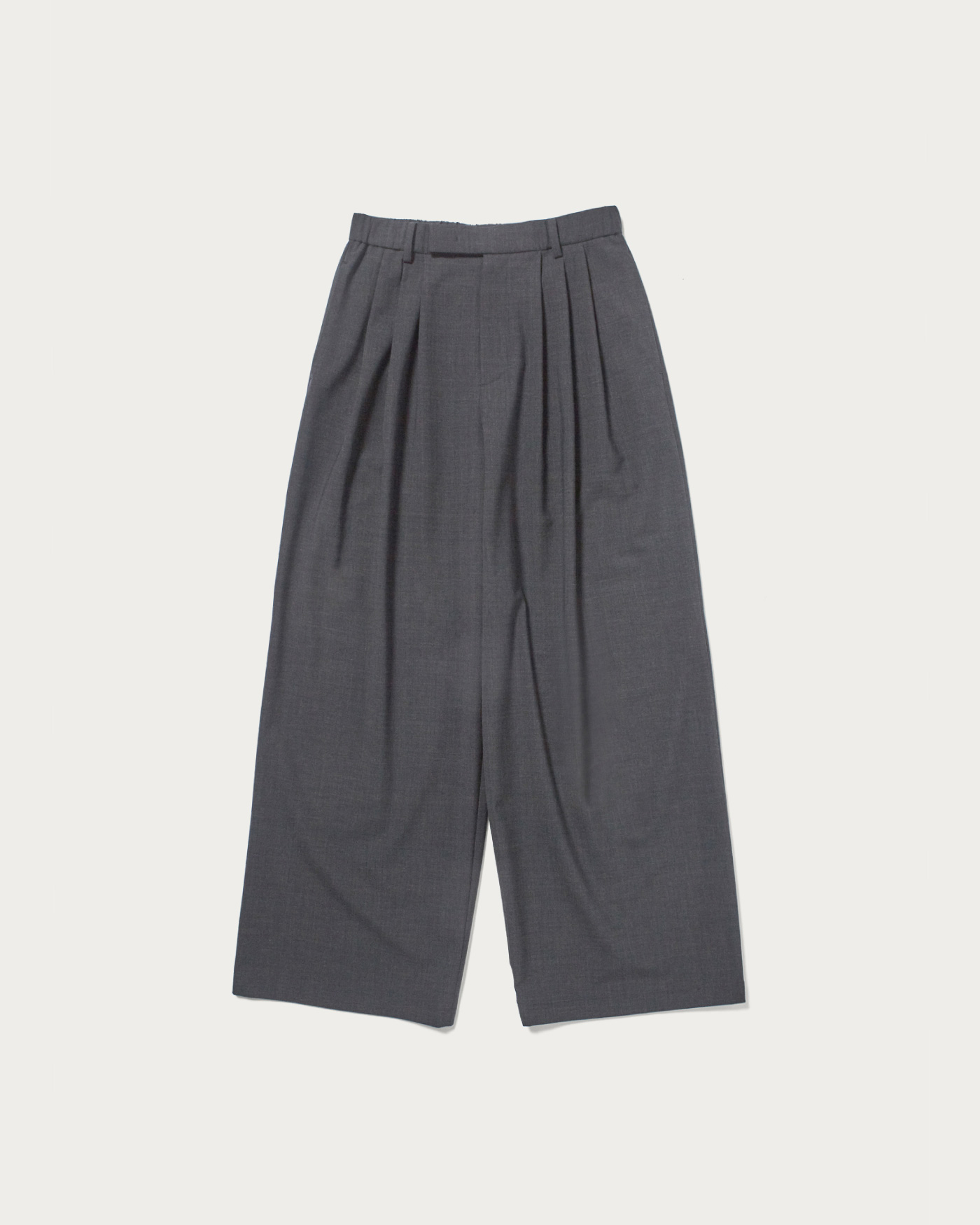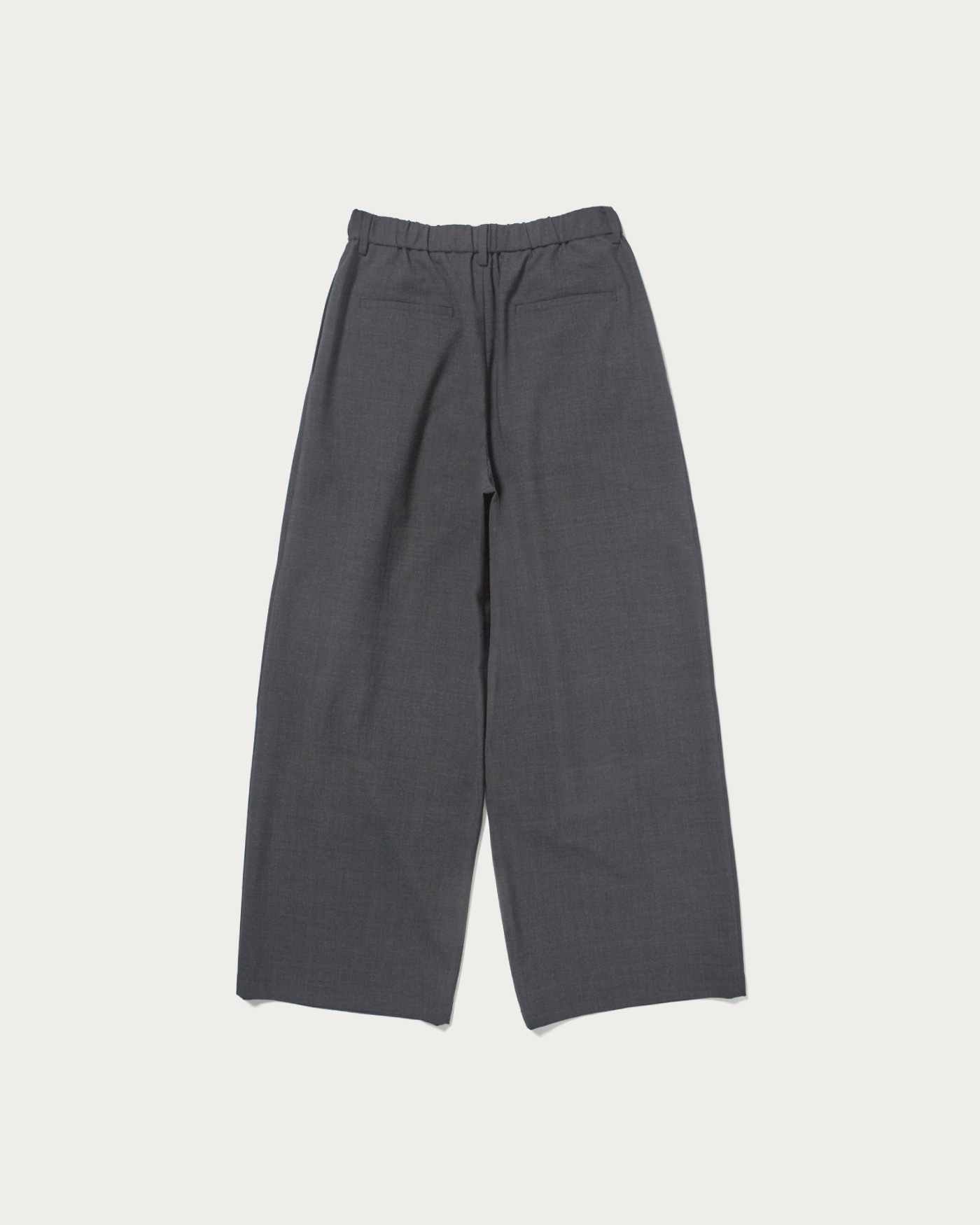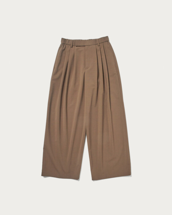 The wide pants that were well-received last season are back in autumn and winter materials. We've crafted a voluminous silhouette with three front tucks using a worsted fabric blend of polyester and wool. The waist features a clean look with an elastic band for a comfortable fit, combining ease of wear with an elegant casual style. We recommend pairing them with cropped lengths or fitted tops for a striking contrast. In winter, they also look great when styled with a fluffy knit.