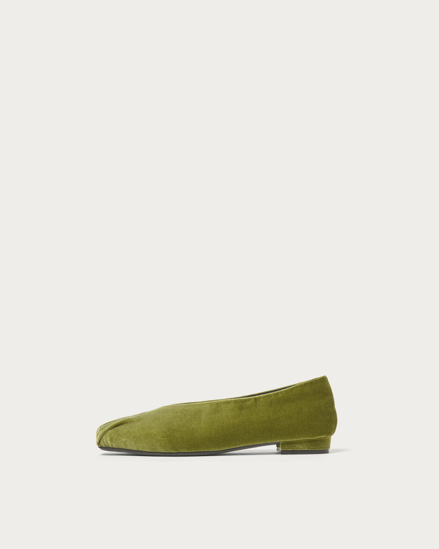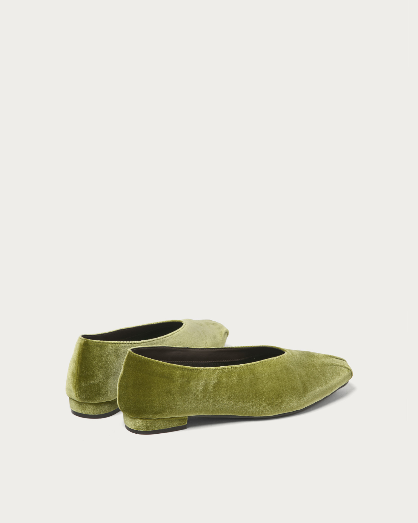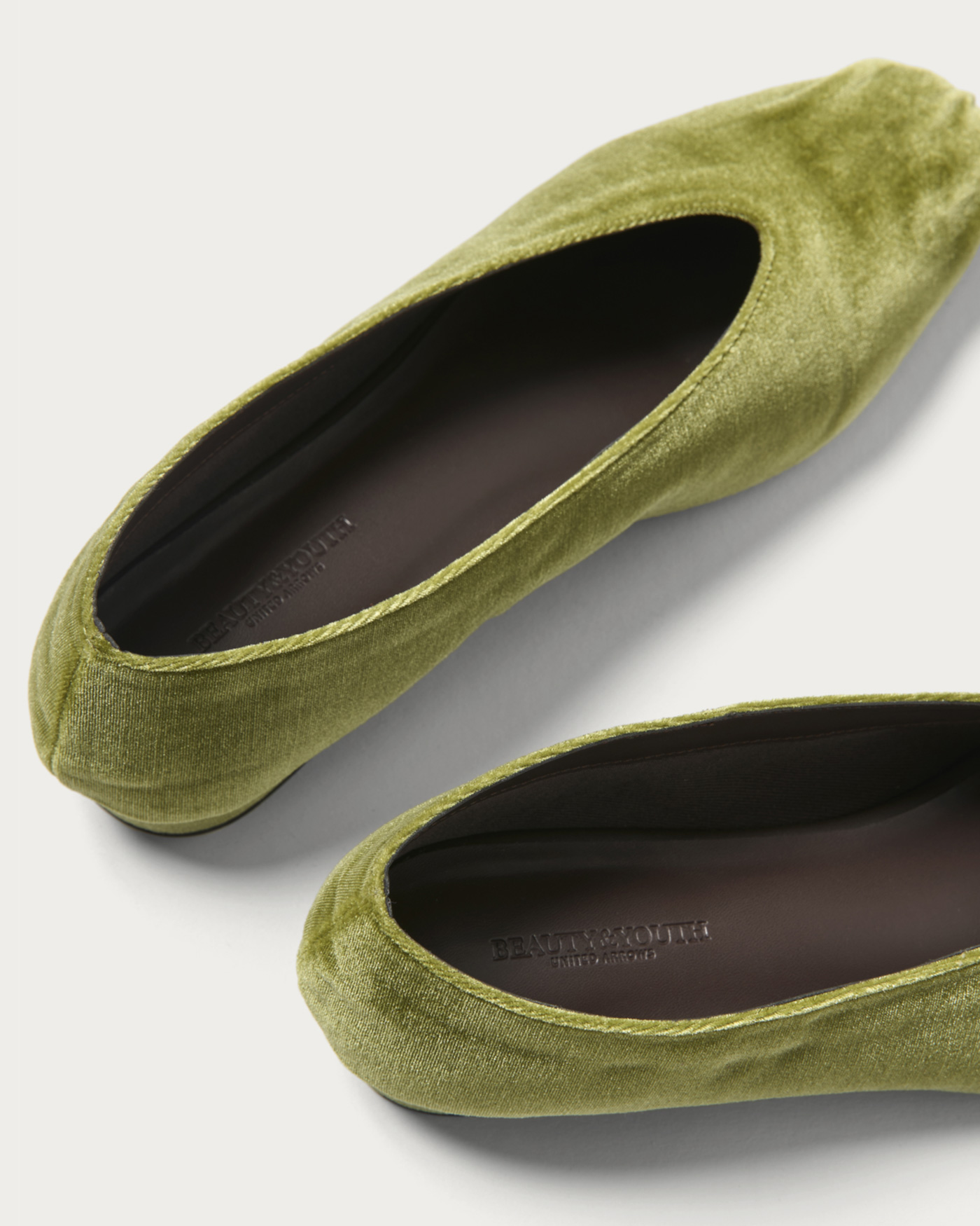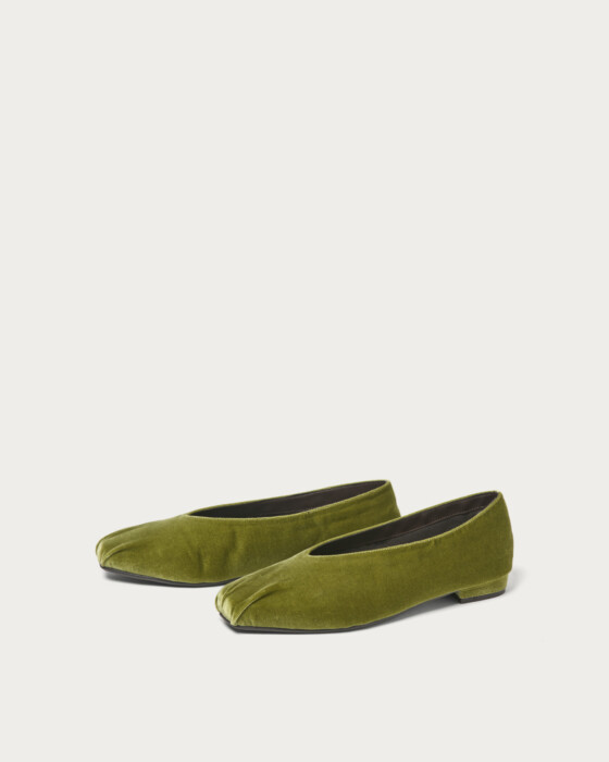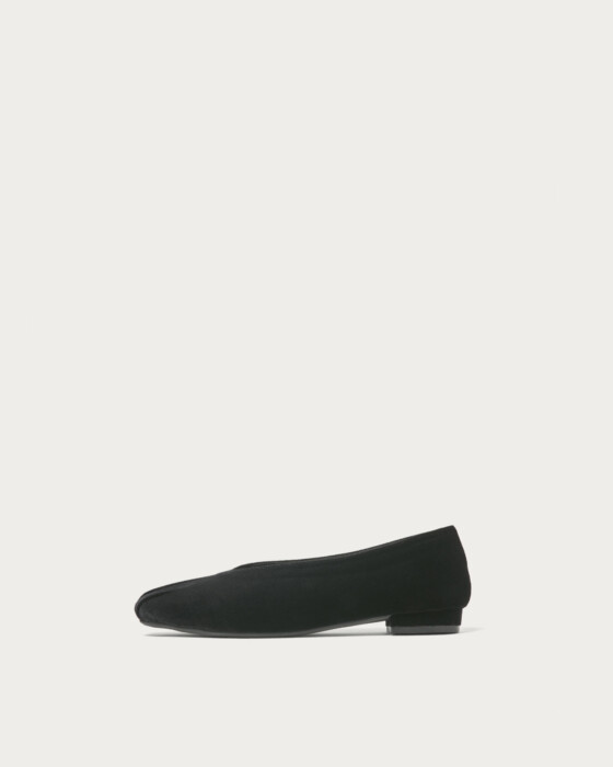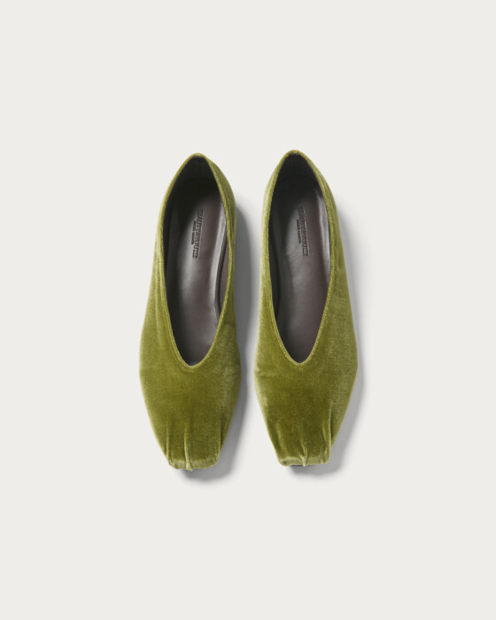 This season's flat shoes feature gathered detailing at the toe and are designed with a deep instep and a gentle V-cut shape that beautifully enhances the appearance of the foot. We have chosen velvet fabric for the material, ensuring that the gathered volume looks elegant and well-defined. These shoes are versatile for both on and off-duty wear, making them a standout choice from early in the season.