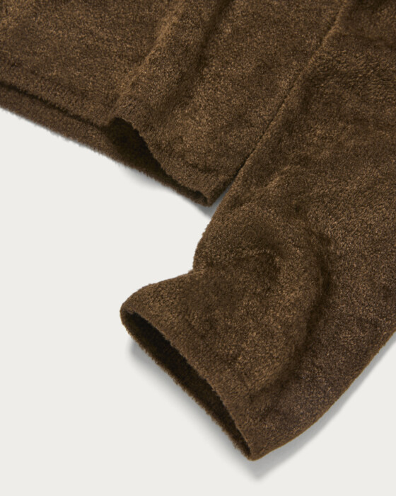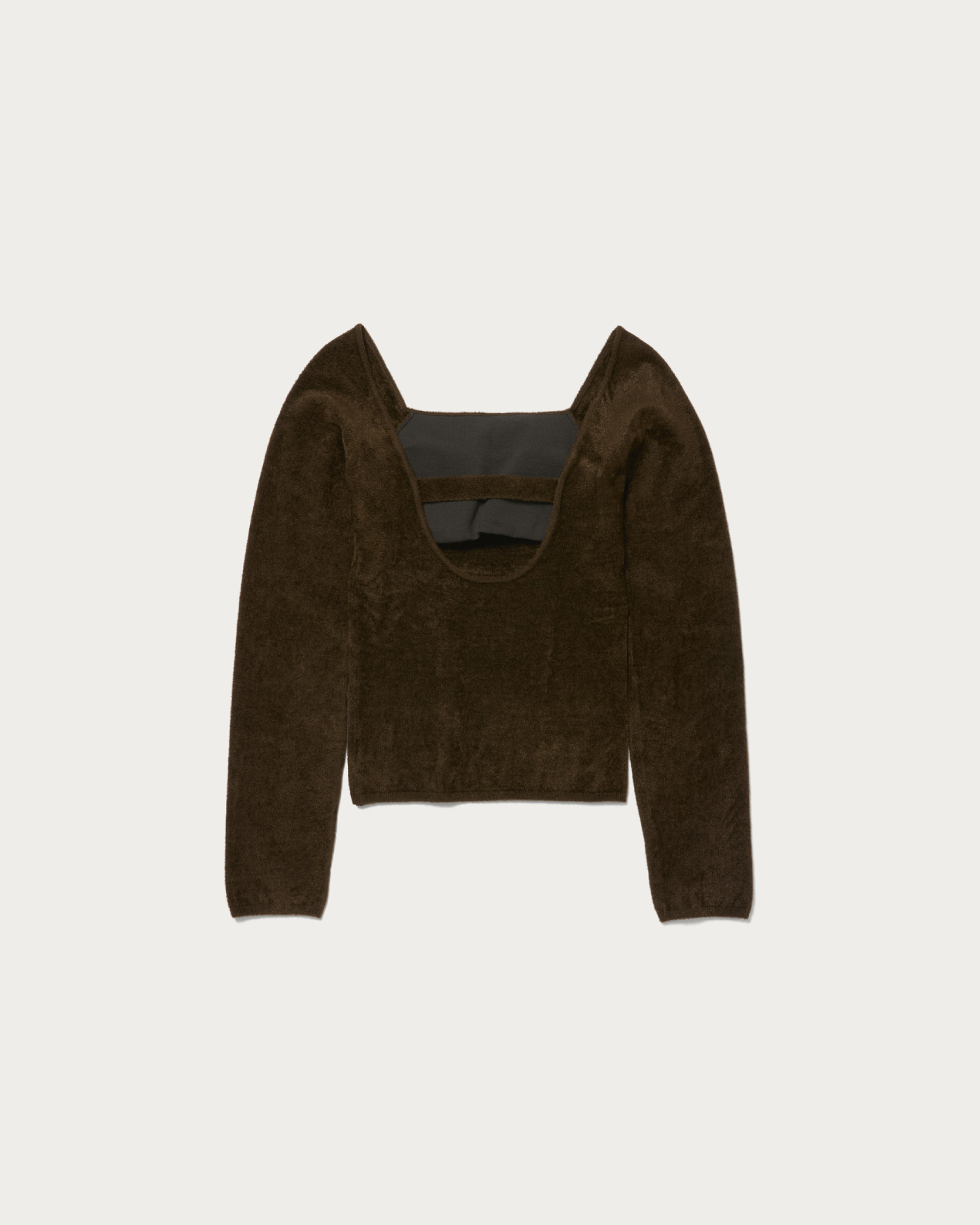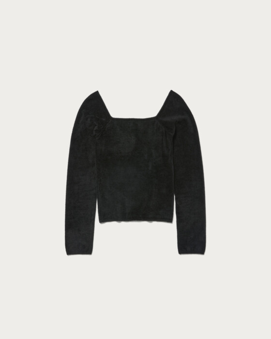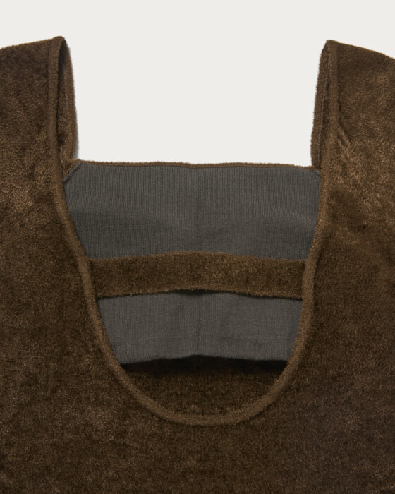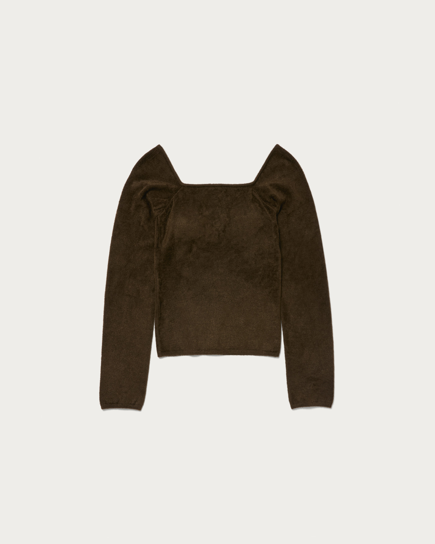 A square-neck mohair knit with an alluring neckline that highlights the décolletage. Made from fine-gauge mohair yarn known for its soft texture and luster, this piece can be worn on its own thanks to its built-in bra top design. It fits the body comfortably and pairs well with voluminous bottoms, making it a recommended choice.