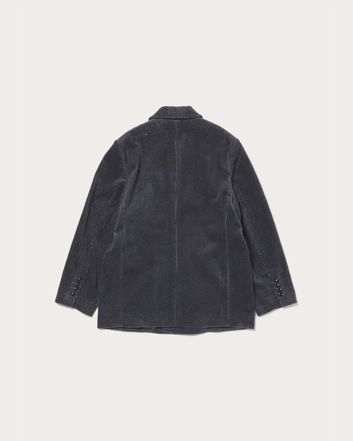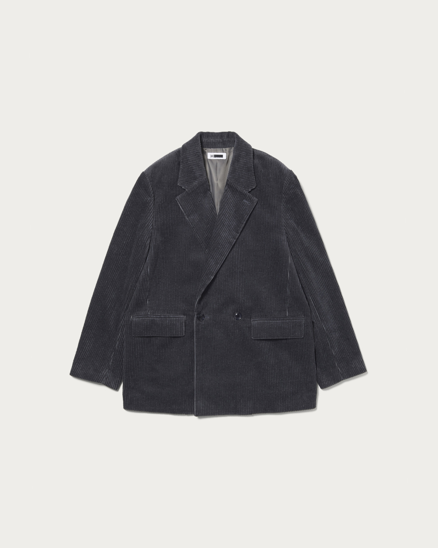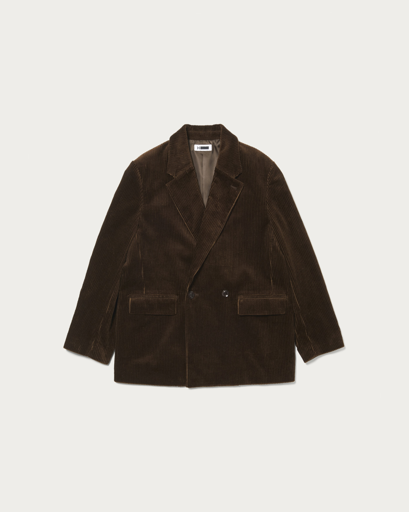 Boxy silhouette double-breasted jacket. This item features a balance of traditional shoulder lines with casual materials. By using elastic threads in the weft and a cotton blend with rayon in the pile section, it achieves a softer texture than it appears. It's recommended to pair it with a mini skirt peeking out from the hem or wear it as a set with pants from the same series.