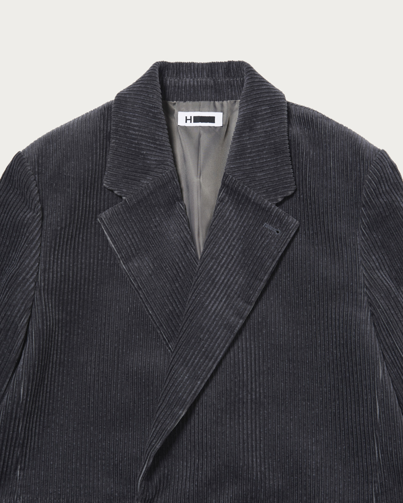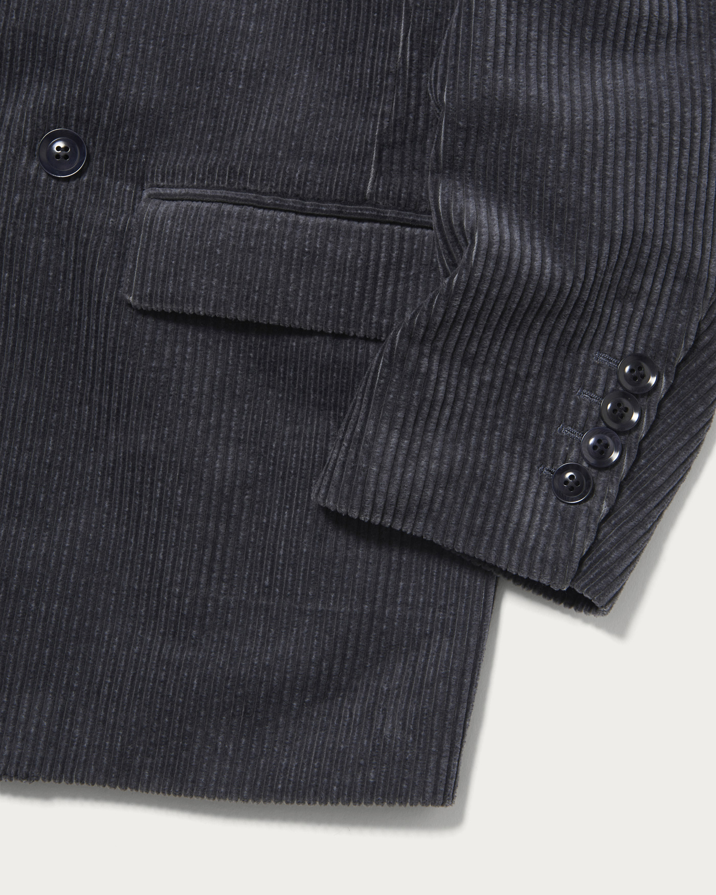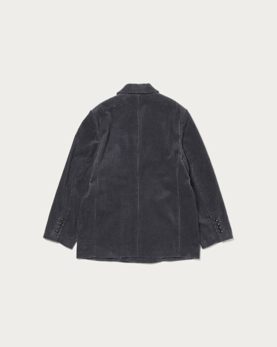 Boxy silhouette double-breasted jacket. This item features a balance of traditional shoulder lines with casual materials. By using elastic threads in the weft and a cotton blend with rayon in the pile section, it achieves a softer texture than it appears. It's recommended to pair it with a mini skirt peeking out from the hem or wear it as a set with pants from the same series.