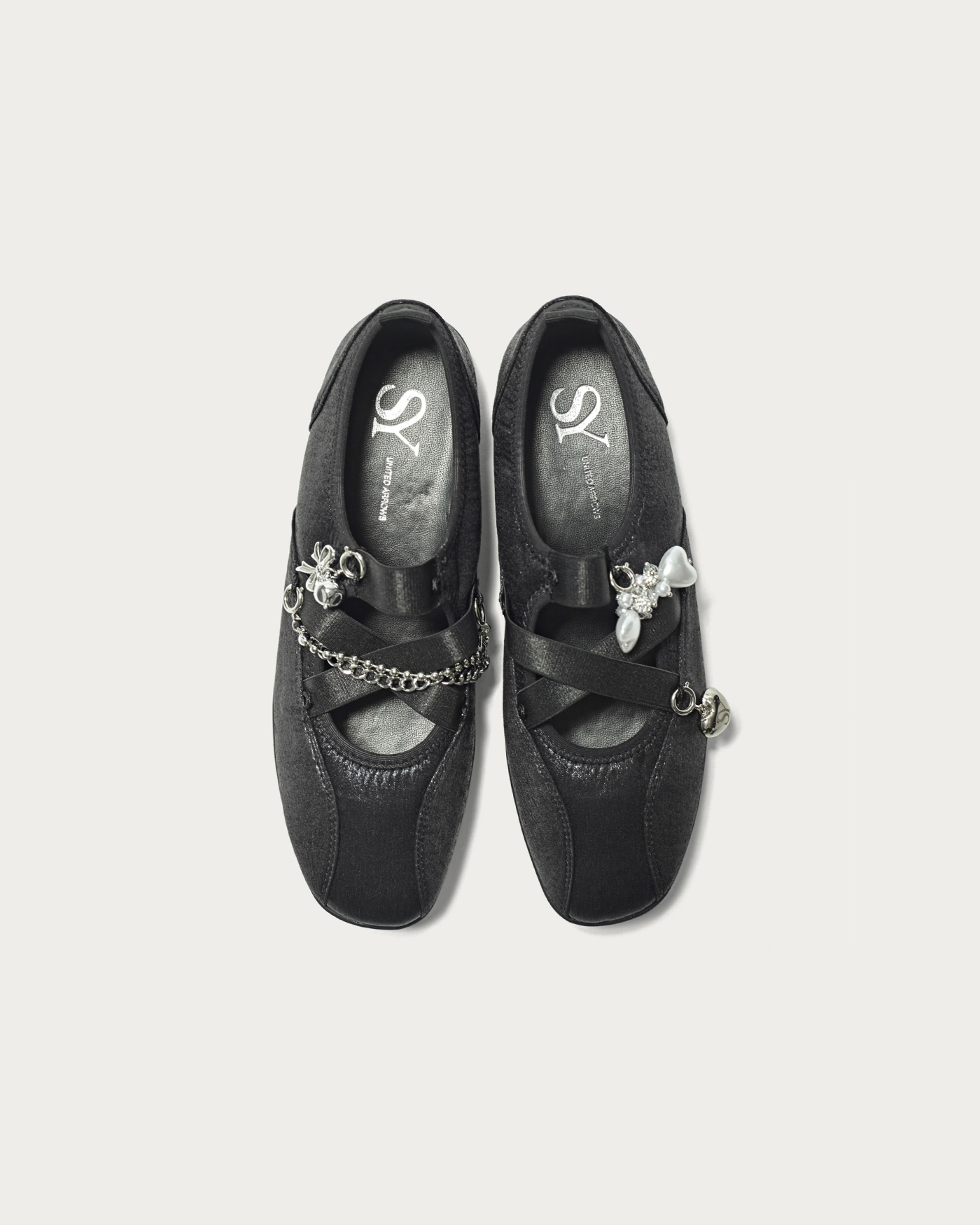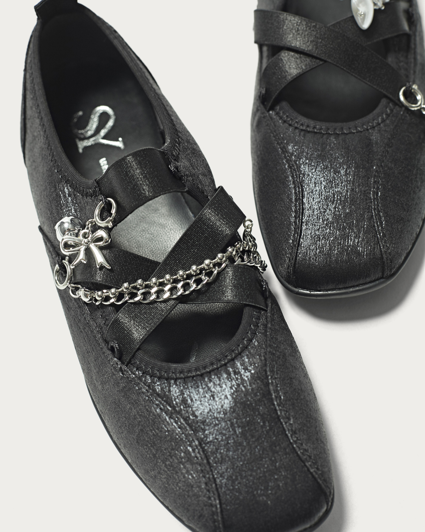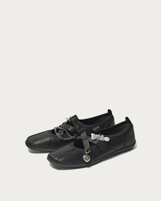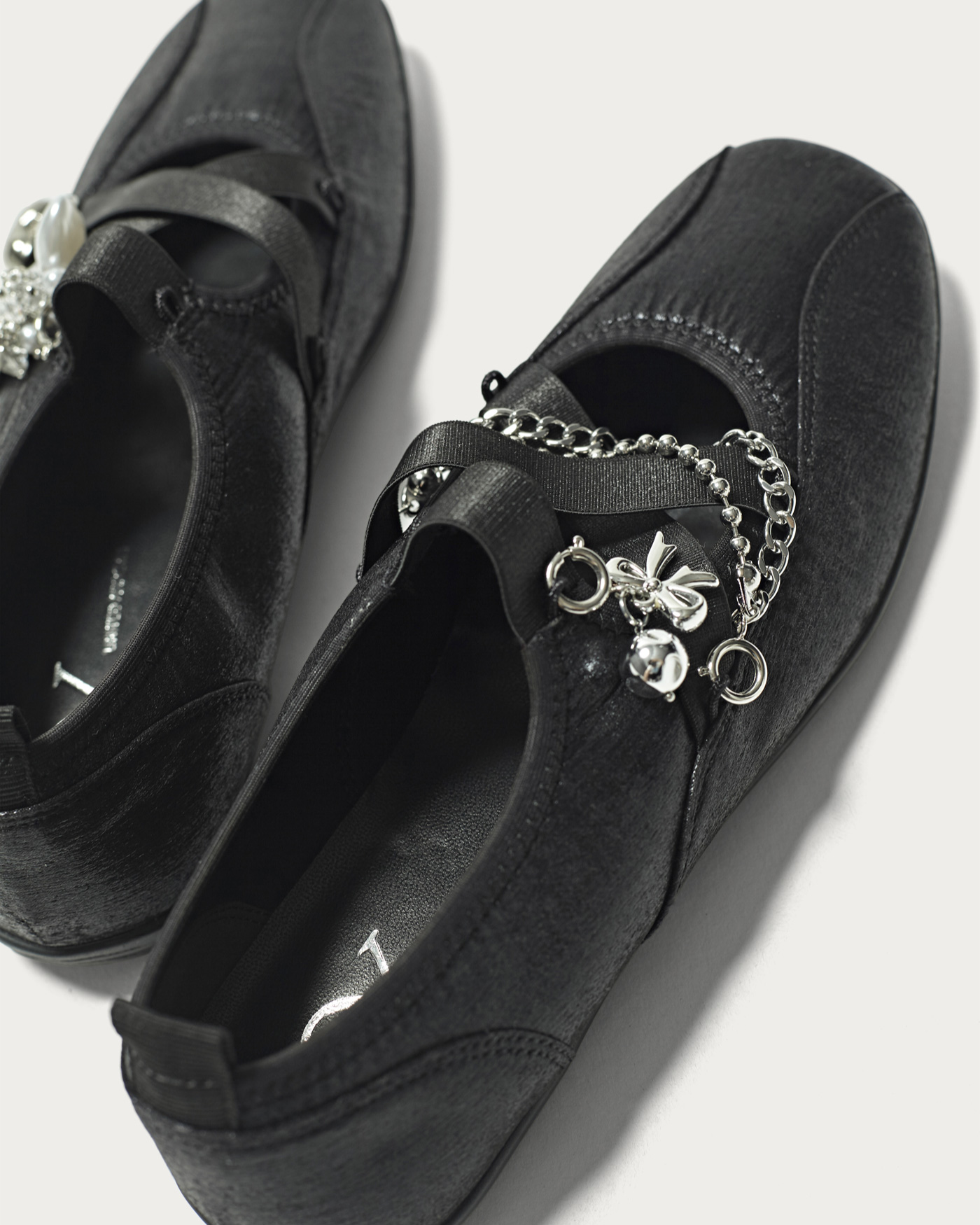 Flat shoes featuring a thick instep band that catches the eye. They have a stylish look on their own, but you can enjoy creating your own unique pair by freely attaching the included charms or your favorite charms to match your style and current mood.