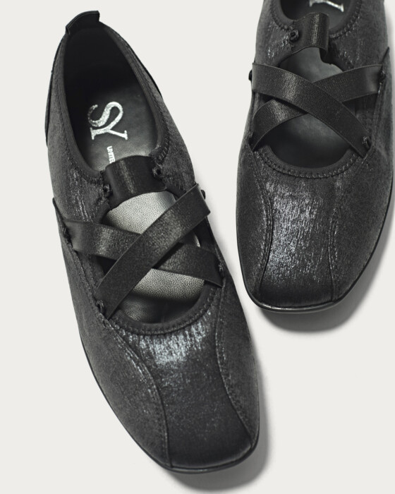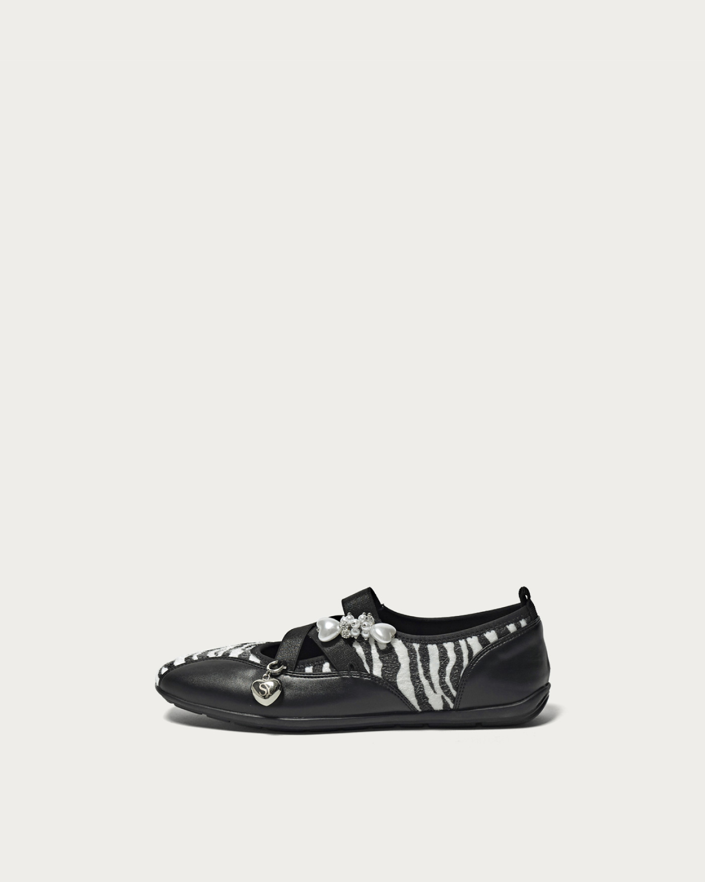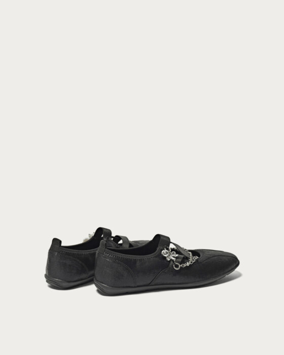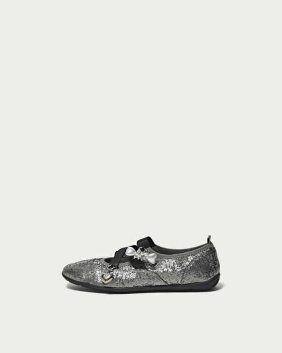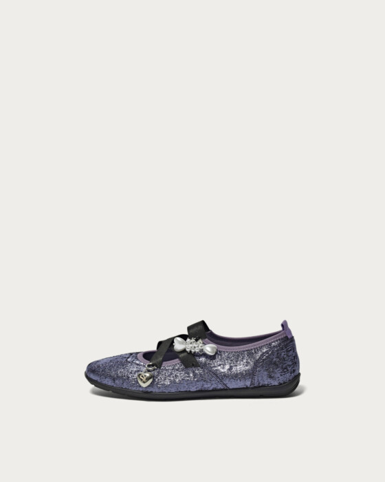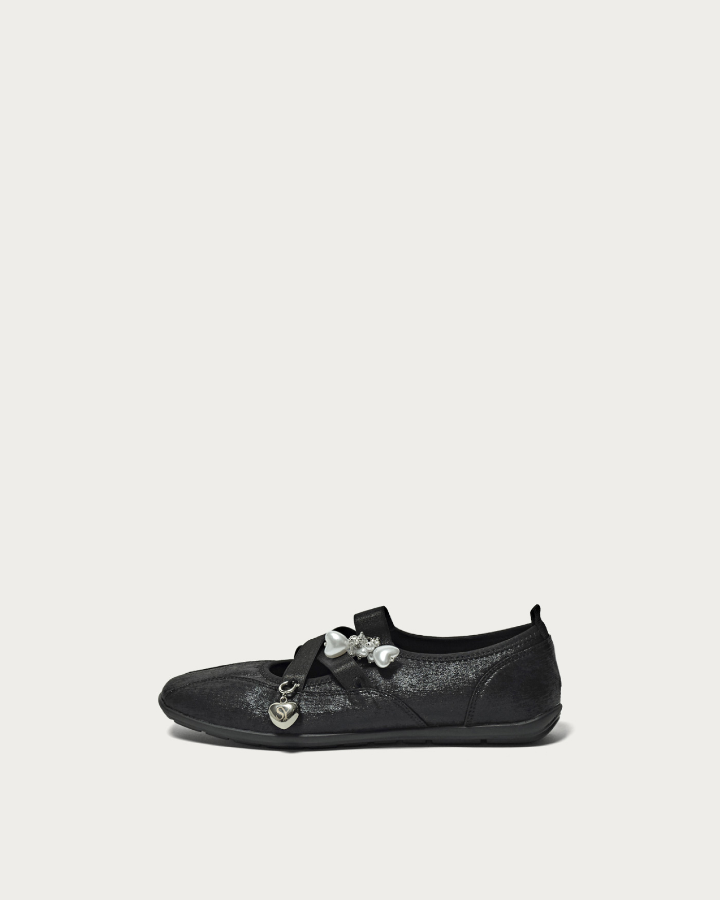 Flat shoes featuring a thick instep band that catches the eye. They have a stylish look on their own, but you can enjoy creating your own unique pair by freely attaching the included charms or your favorite charms to match your style and current mood.