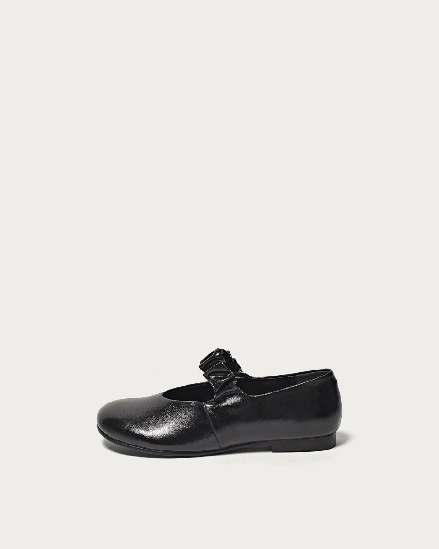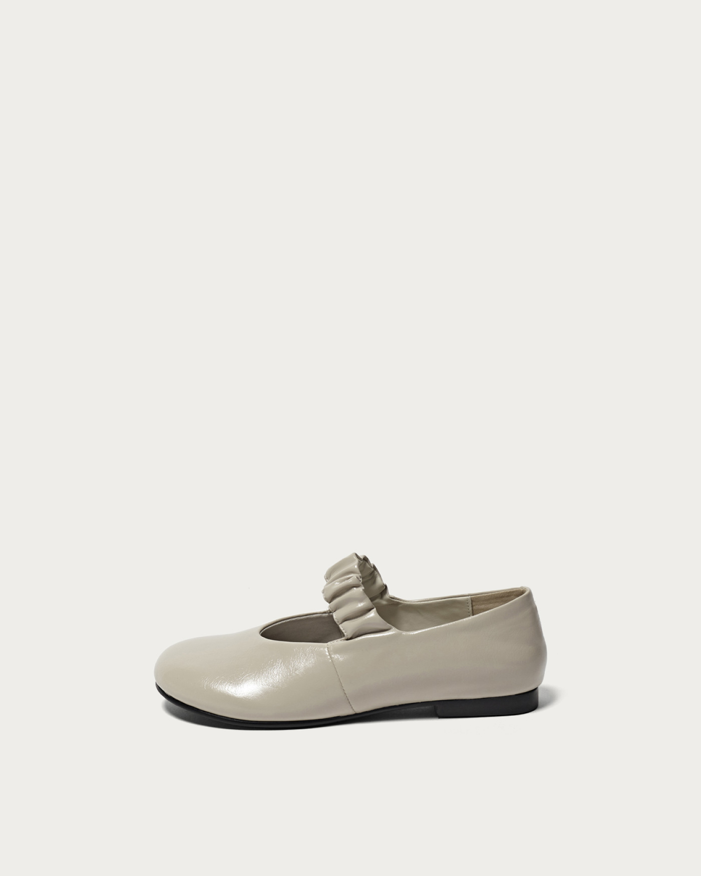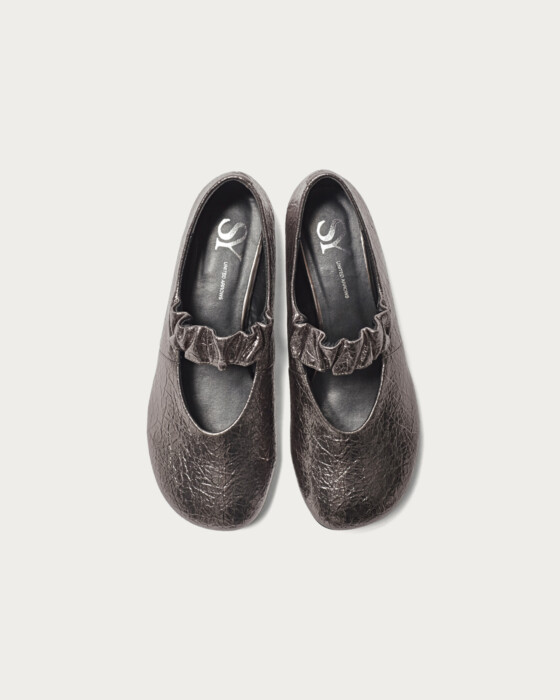 Flat shoes featuring an oblique toe and a band with a generously set shirring design. With a soft core only in the lower part of the heel, they offer a comfortable and relaxed fit. Simply incorporating them into your outfit can expand your styling options from modern to feminine.