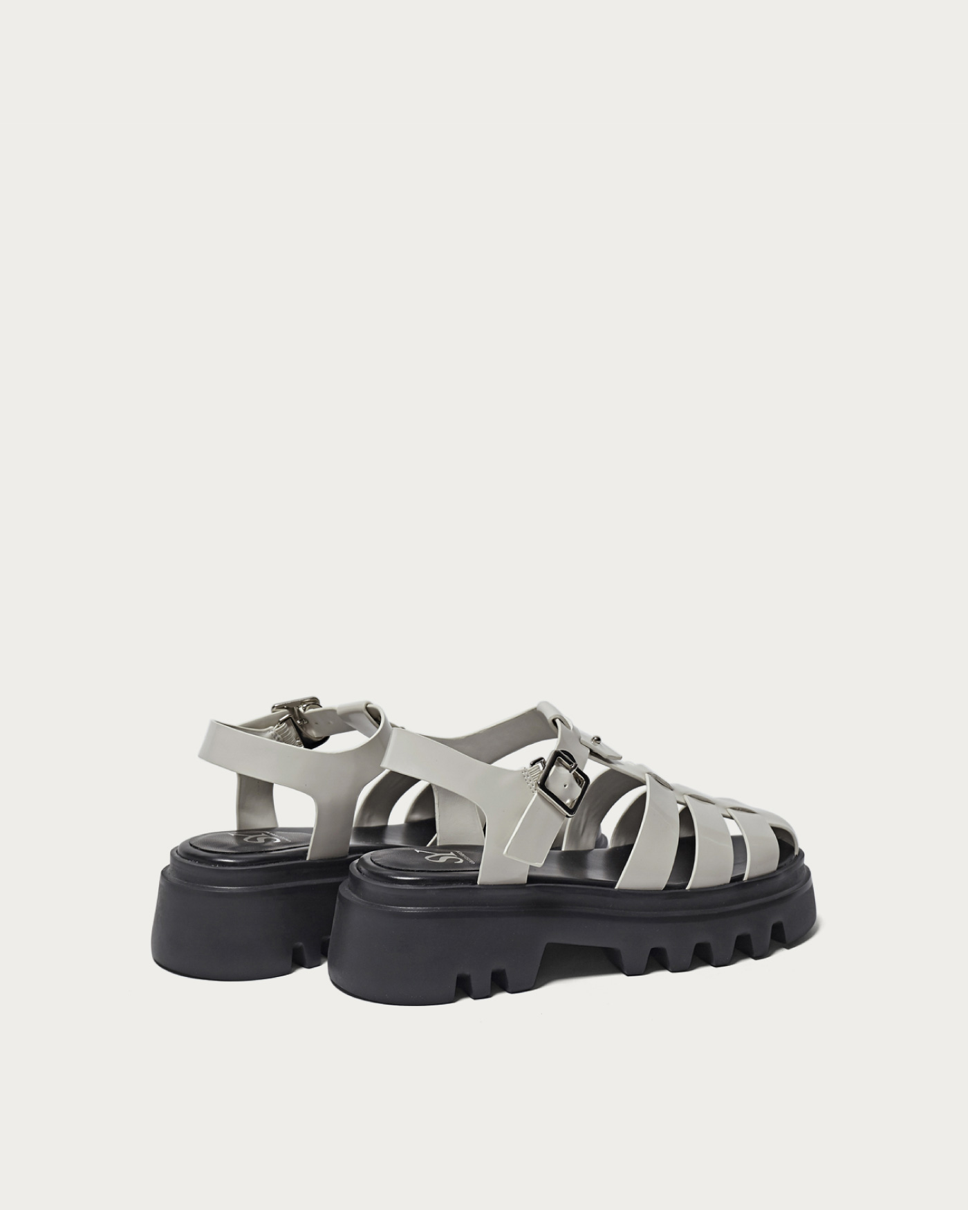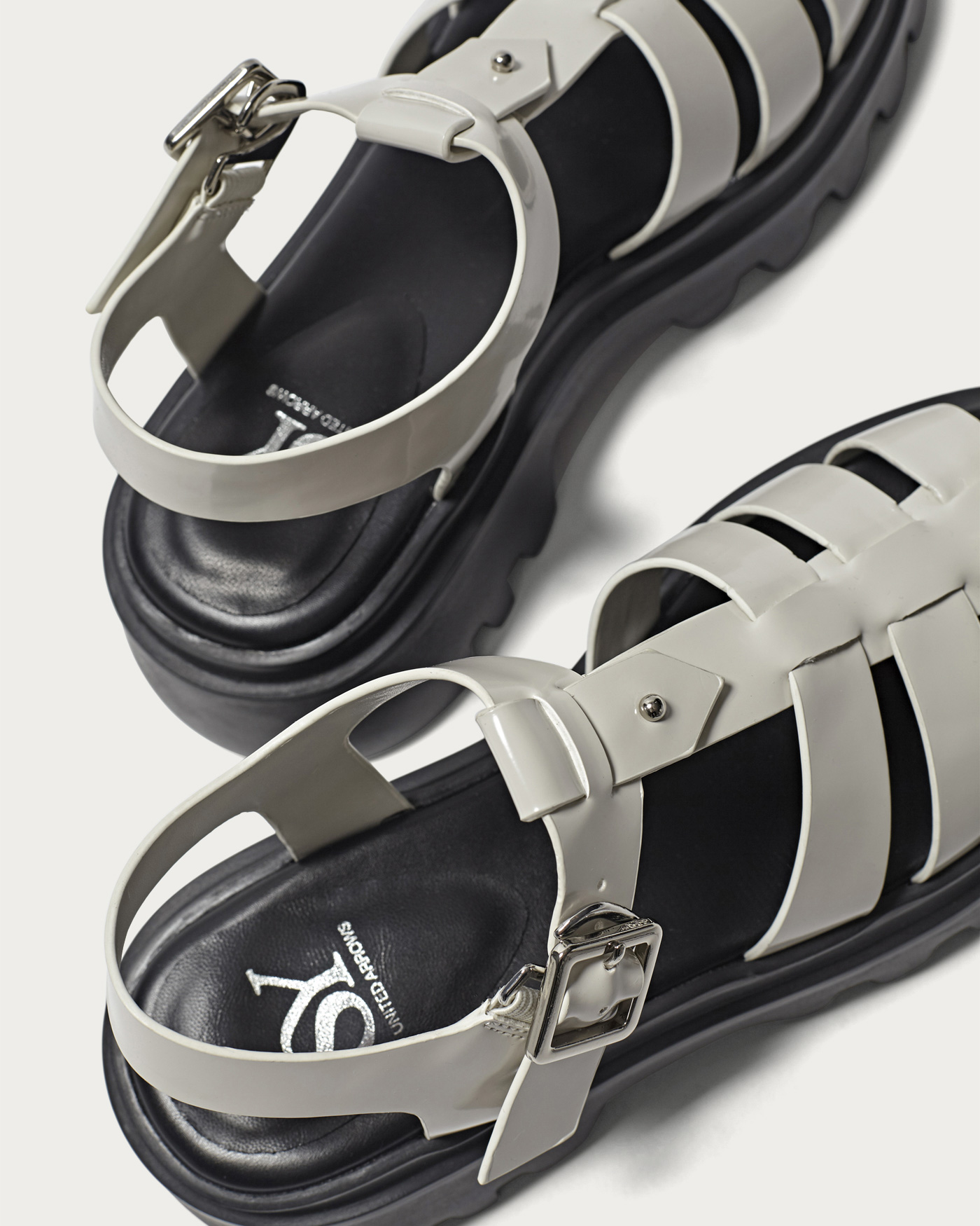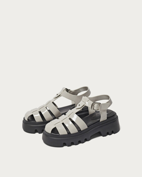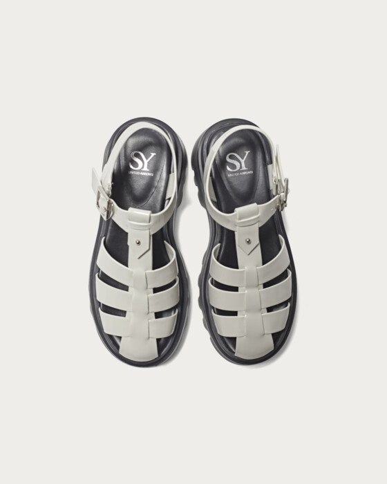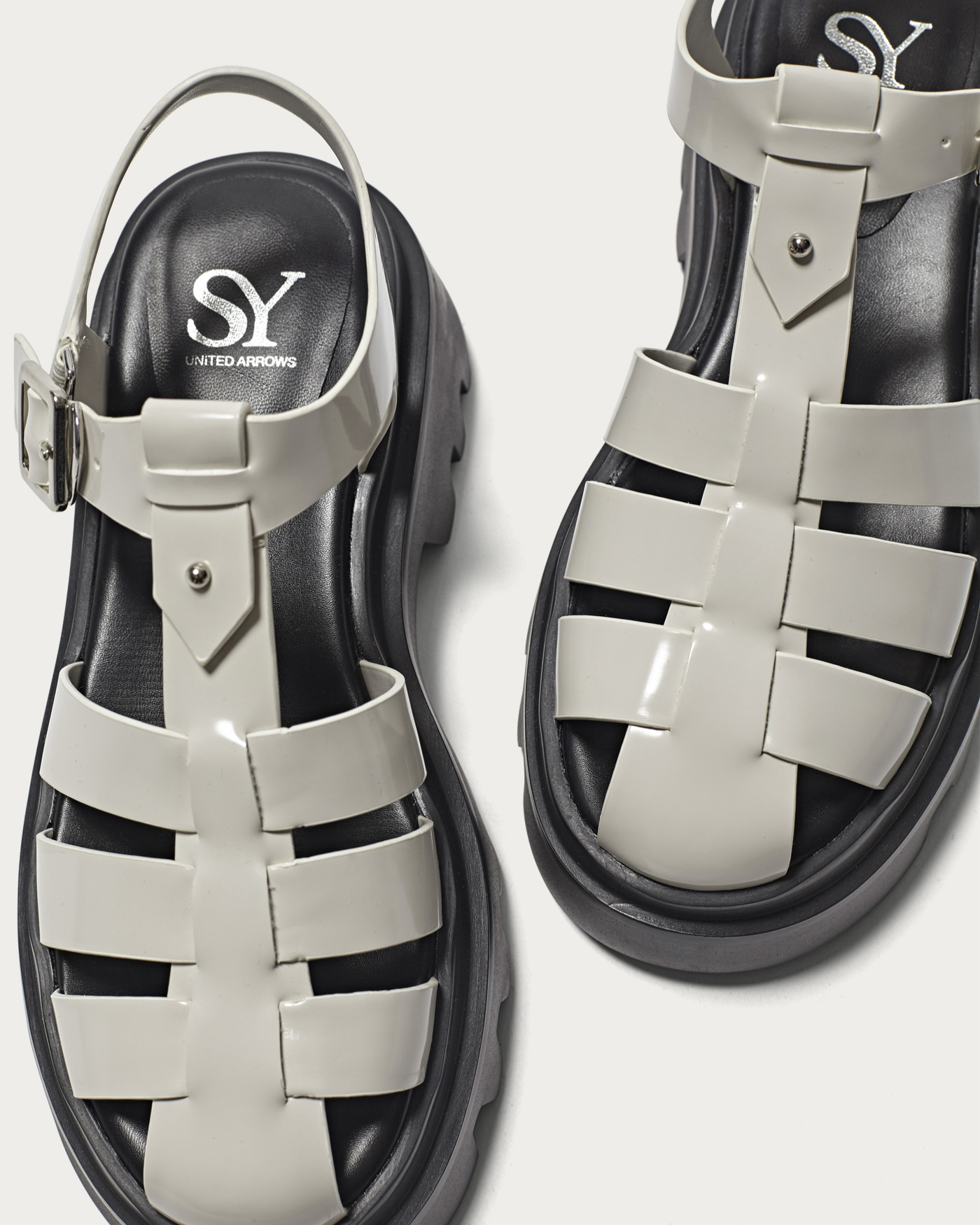The Gurkha sandals with their strikingly voluminous soles make a strong impression. The sizing is also a key point, allowing them to be paired with thicker socks. While casual, the upper design adds a touch of sophistication with its relaxed feel. The modern material gives a sleek finish, pulling the look together.