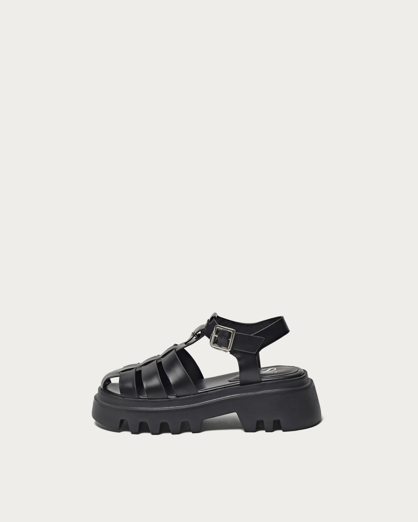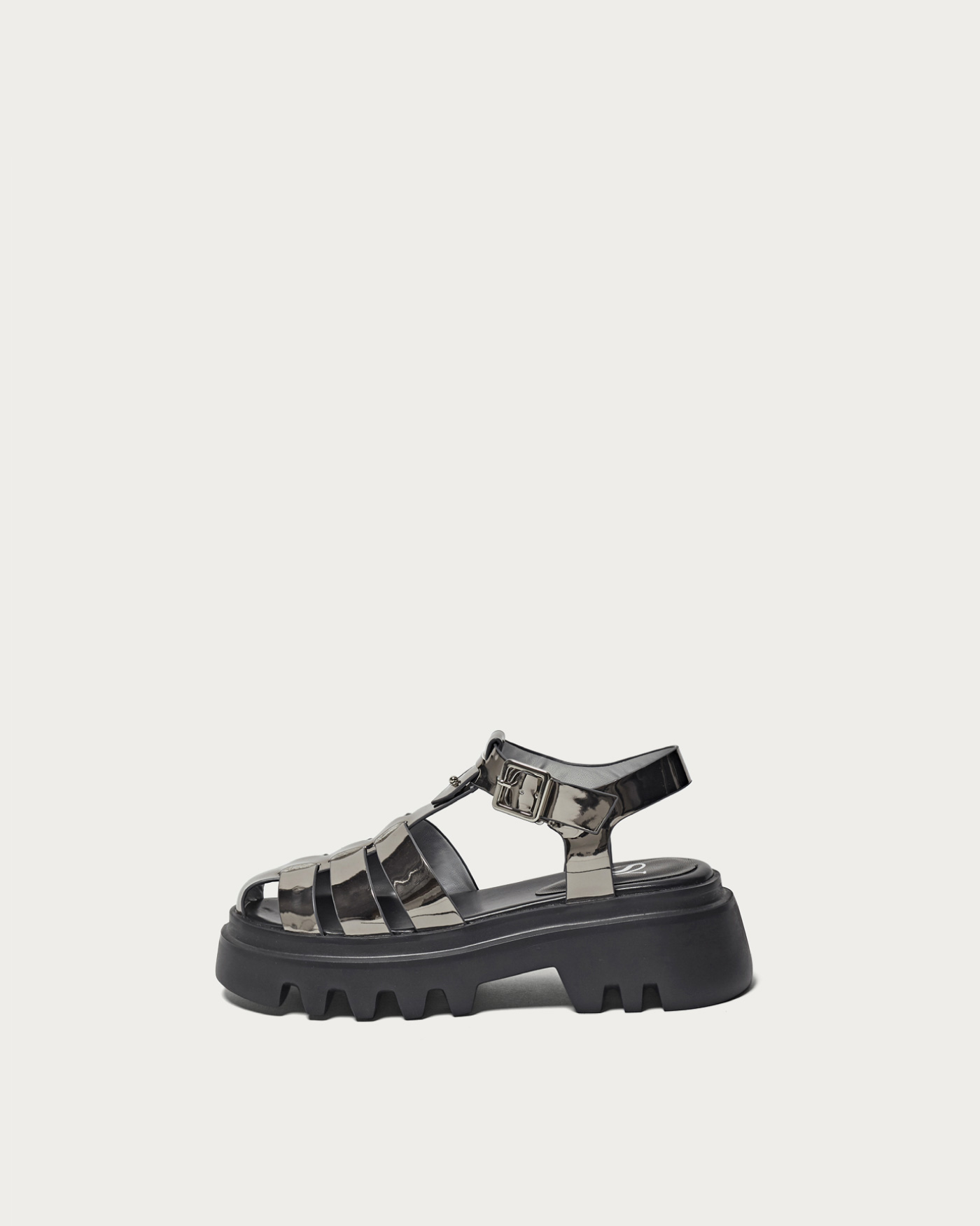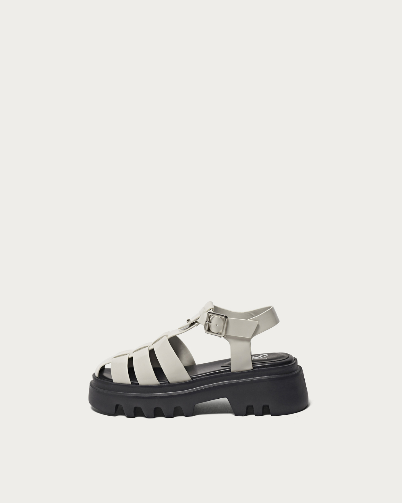 The Gurkha sandals with their strikingly voluminous soles make a strong impression. The sizing is also a key point, allowing them to be paired with thicker socks. While casual, the upper design adds a touch of sophistication with its relaxed feel. The modern material gives a sleek finish, pulling the look together.