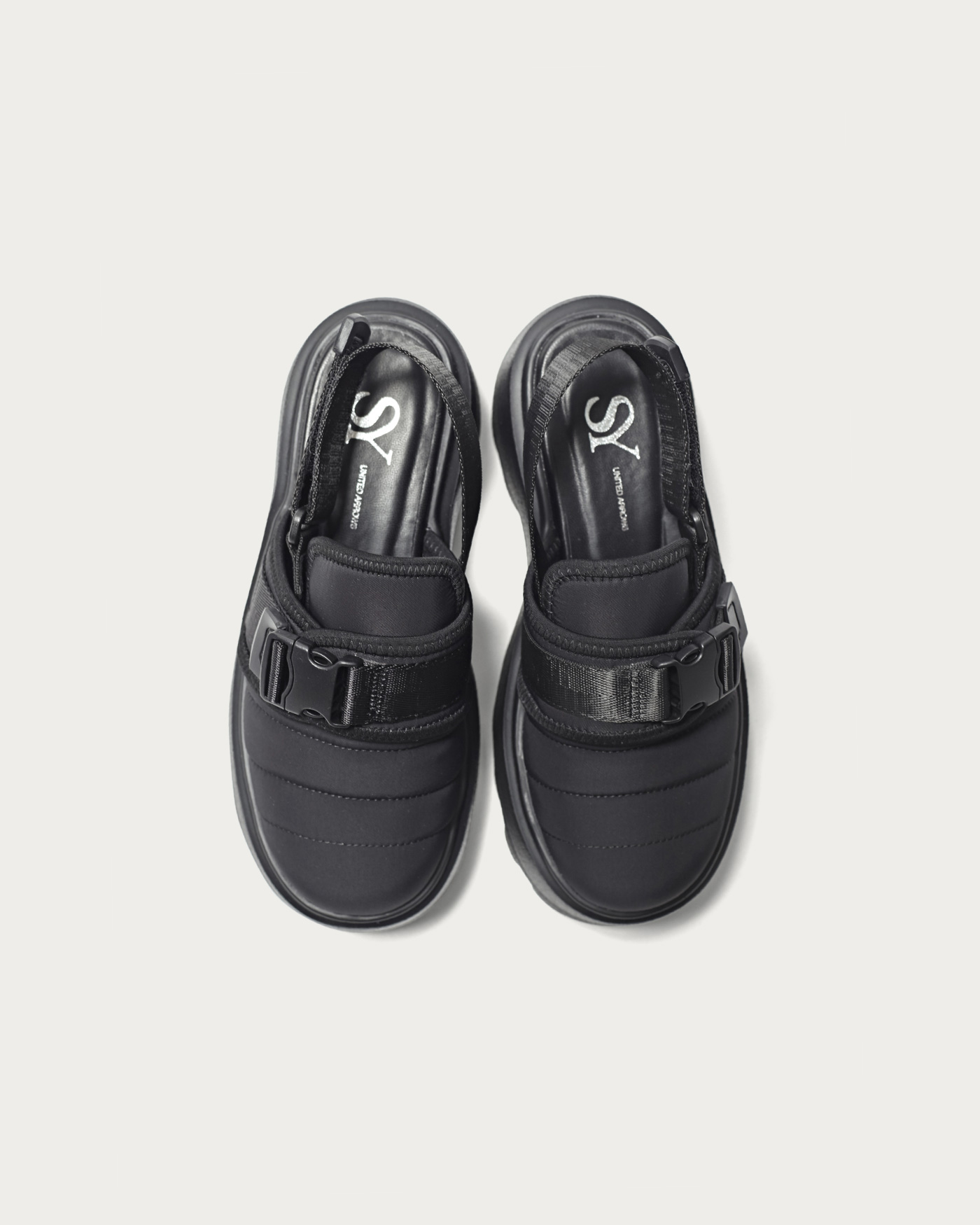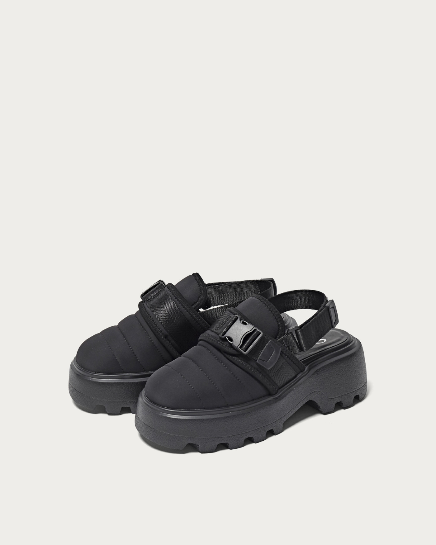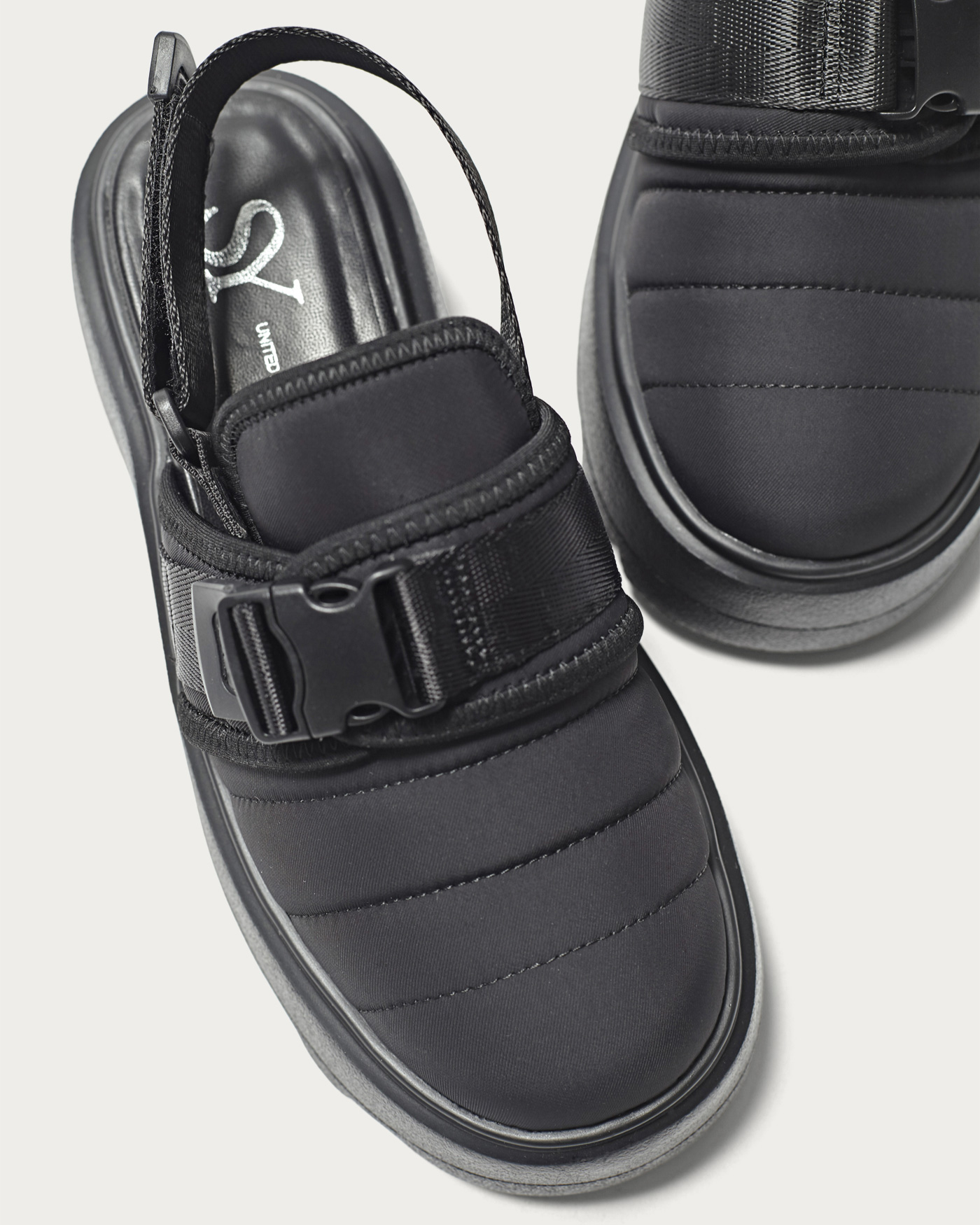 A pair with a plump shape and a strikingly robust sole. While the buckles and belts add a sporty touch, the open heel design prevents it from feeling too heavy, allowing you to achieve this season's trendy styling with added volume at the feet.