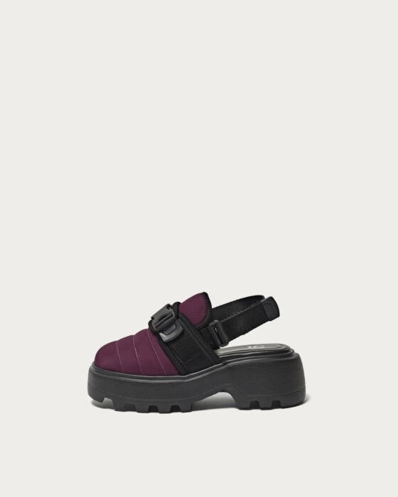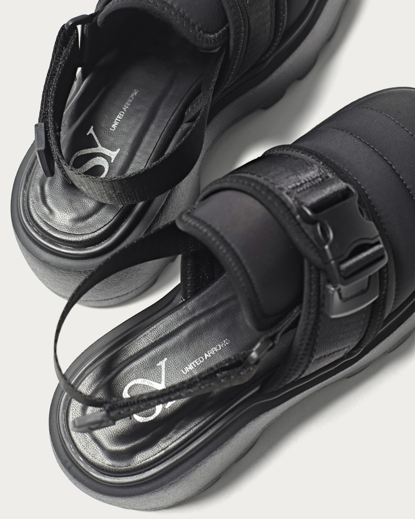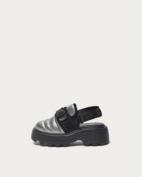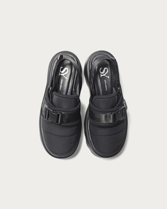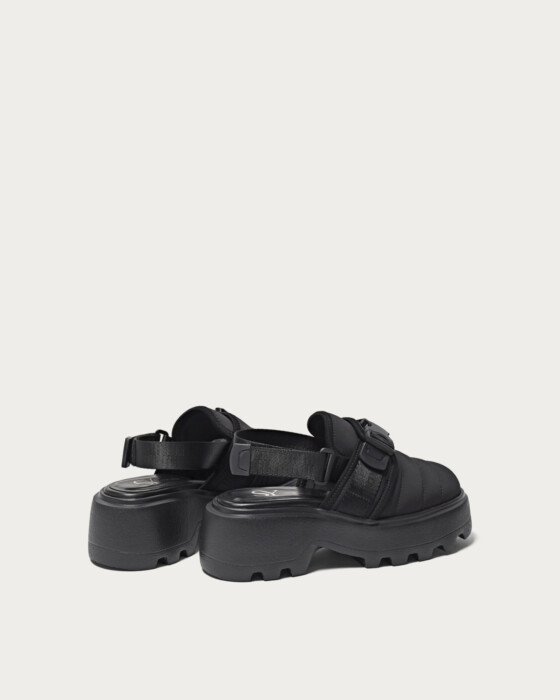 A pair with a plump shape and a strikingly robust sole. While the buckles and belts add a sporty touch, the open heel design prevents it from feeling too heavy, allowing you to achieve this season's trendy styling with added volume at the feet.