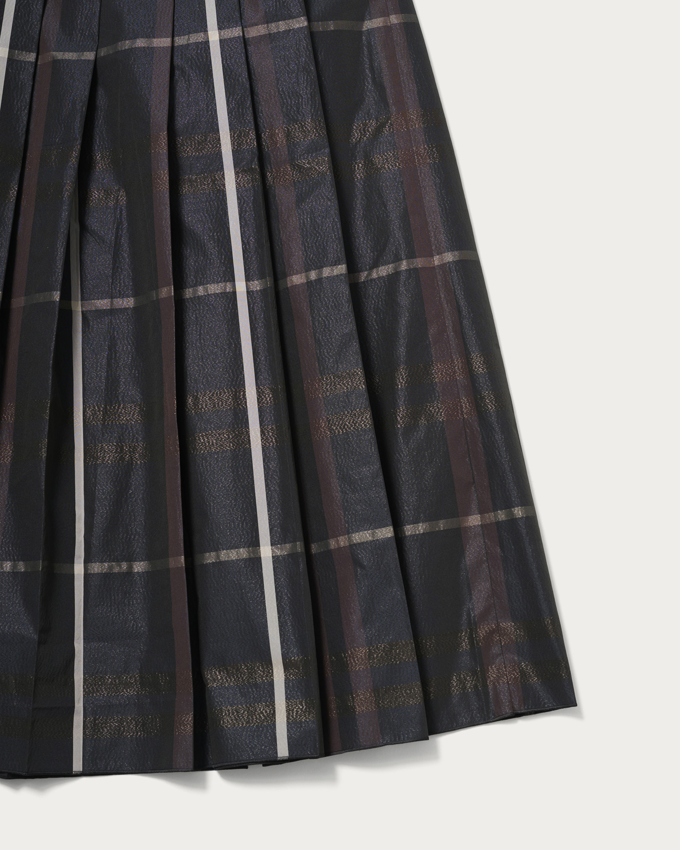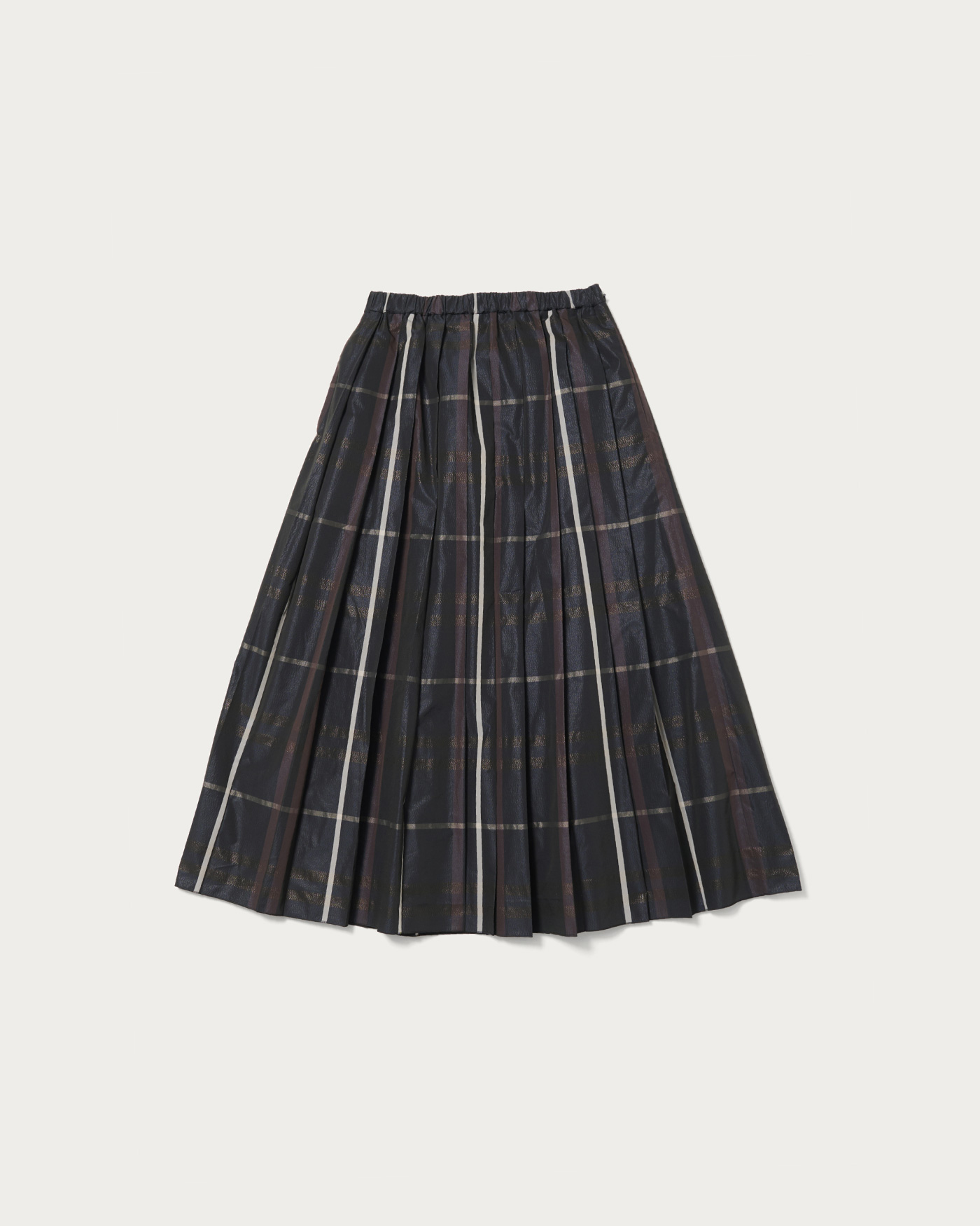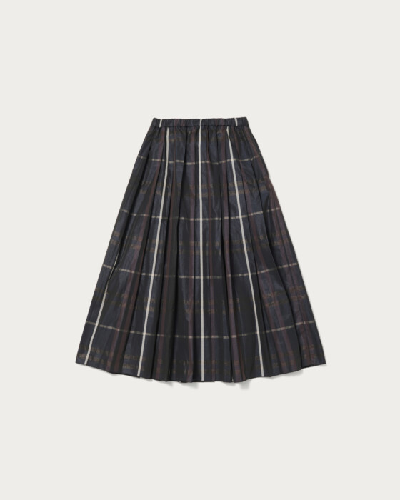A pleated skirt featuring a check pattern that appears to change colors with movement and delicate glitter that adds to its charm. The casually finished pleats make it an easy piece to incorporate into your daily wardrobe. Made from high-quality, glossy taffeta material, this skirt boasts an original pattern with a focus on the color and depth of the checks. The elastic waistband ensures a comfortable fit. The long length, which reveals the ankles, allows you to enjoy different footwear styles and makes it a versatile piece that can be worn across seasons.