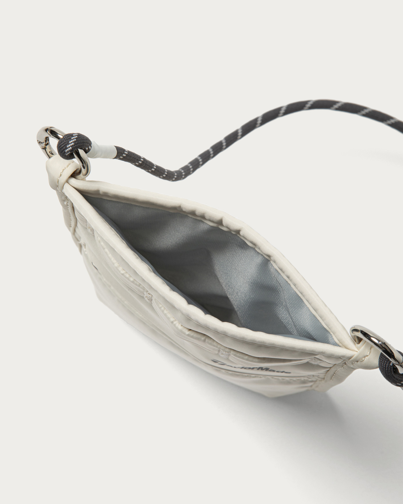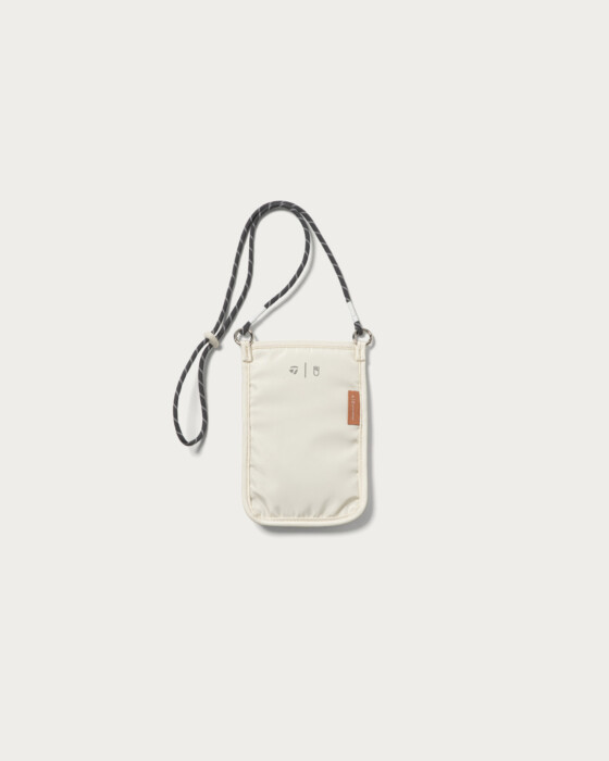 A sacoche made from an off-white polyester material with a relaxed and soft texture, featuring an orange patch in UA's brand color as an accent on the body. It includes a zippered pocket on the front and uses a thick, cord-like shoulder strap. This item is conveniently sized for quickly accessing small items like scorecards.