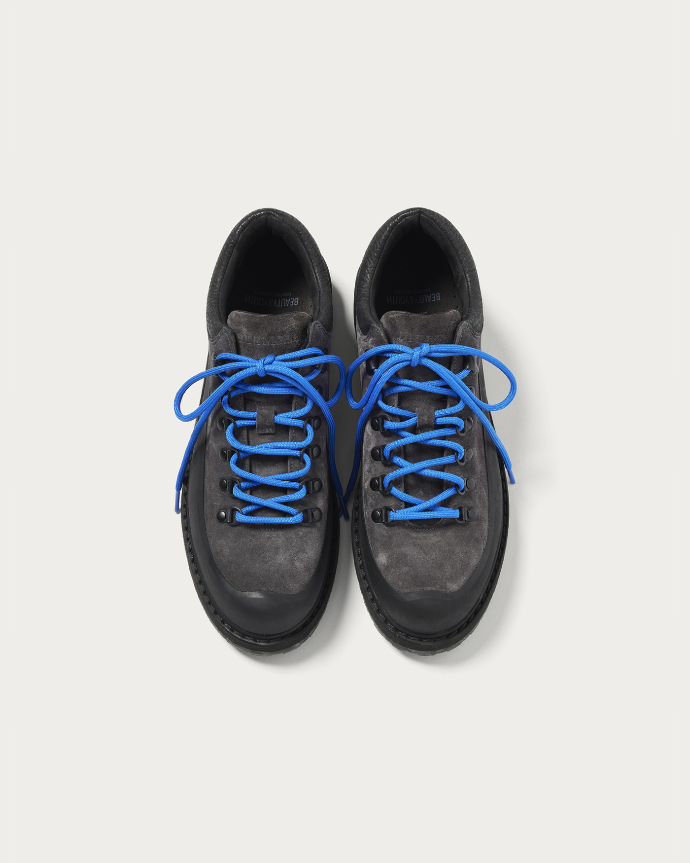 The classic model from Diemme has been customized with unique materials and colors from Beauty & Youth's perspective. Both feature uppers made of oil-infused suede, and the collar is adorned with premium pebbled nubuck, enhancing the texture and tonal contrast. This combination adds a sense of calm to the strong silhouette.