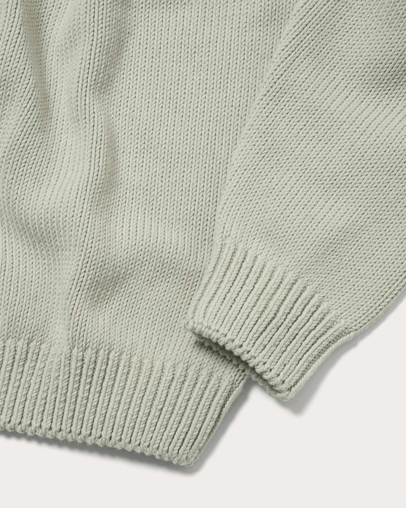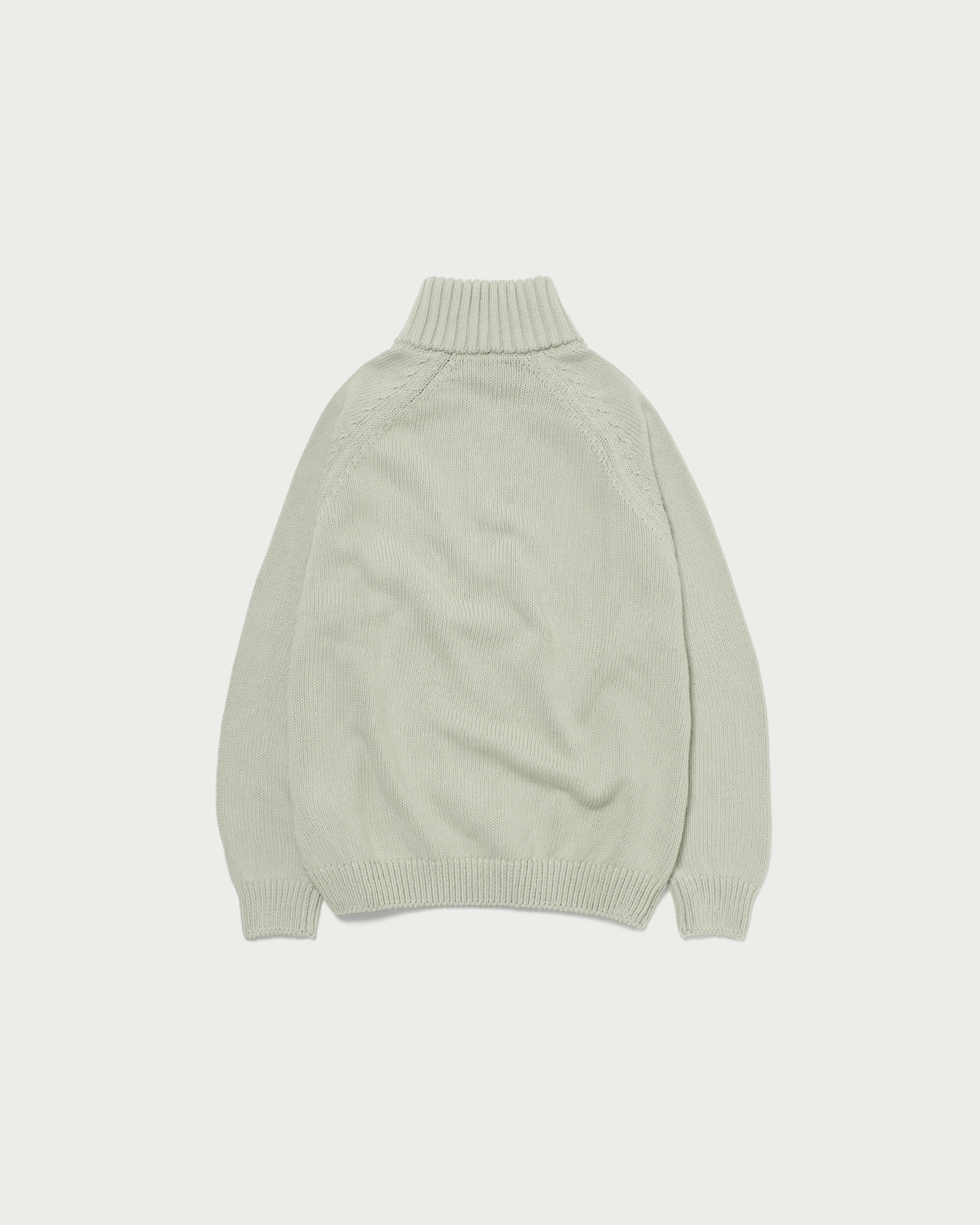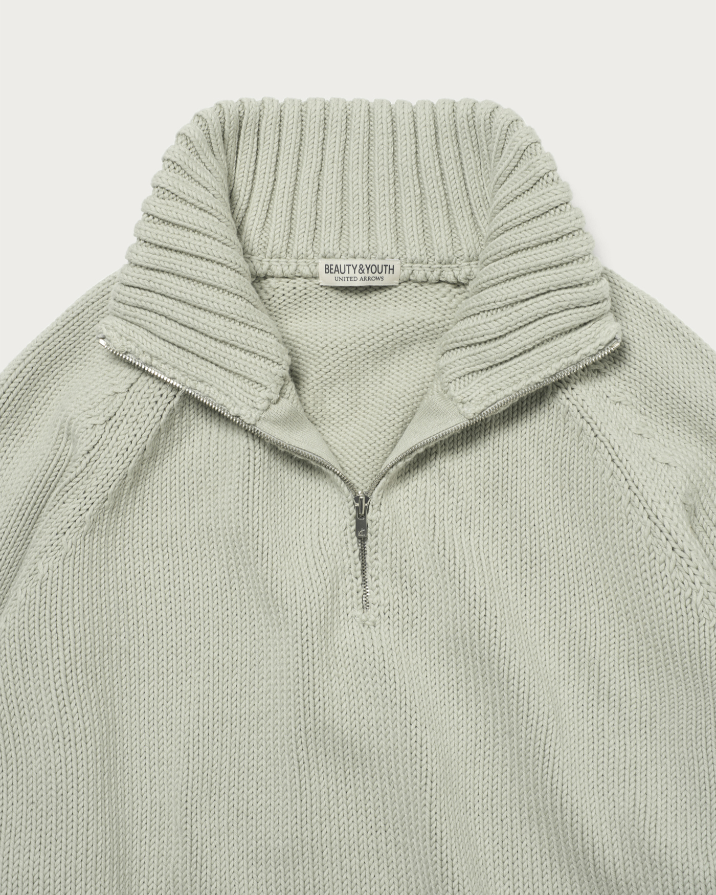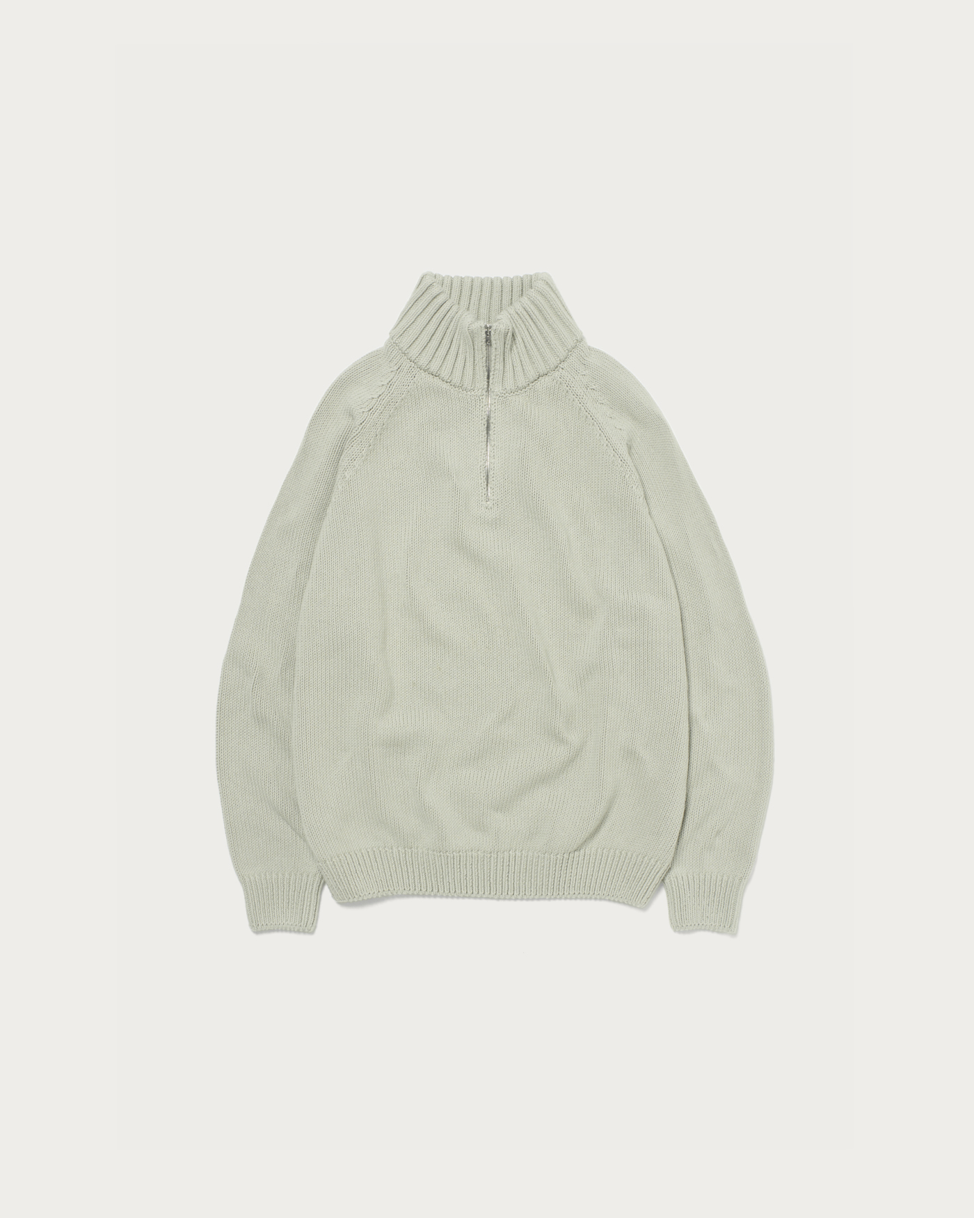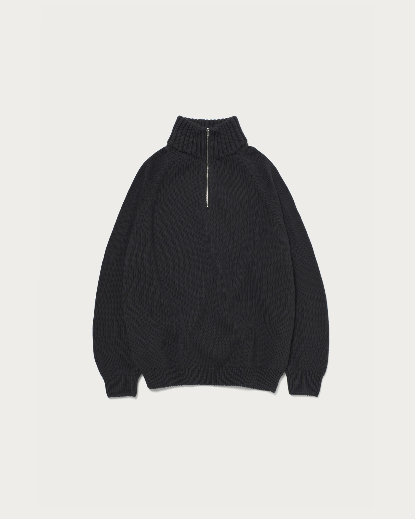 A half-zip knit crafted from thick cord yarn. It features a relaxed fit with a balloon silhouette, cinched at the sleeves and hem with ribbing. The nuanced coloring and the unique three-dimensional texture of the cord yarn, combined with the use of an Excella zipper, create a garment with a distinctive atmosphere. Made from 100% cotton cord yarn, it offers a smooth touch and expressive texture. It is designed to be washable at home.