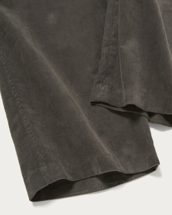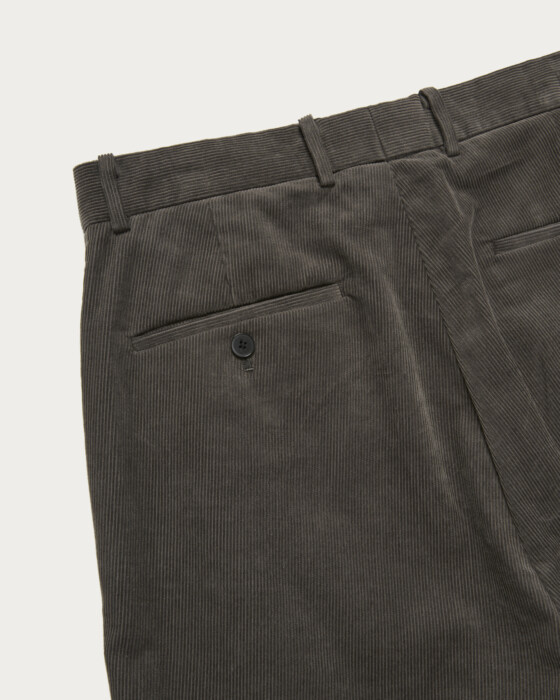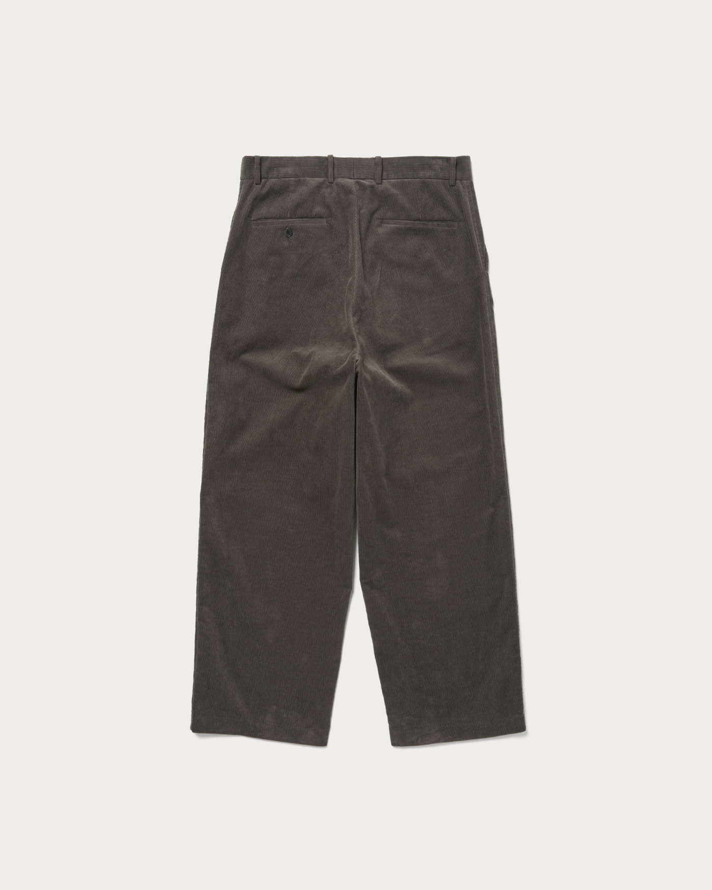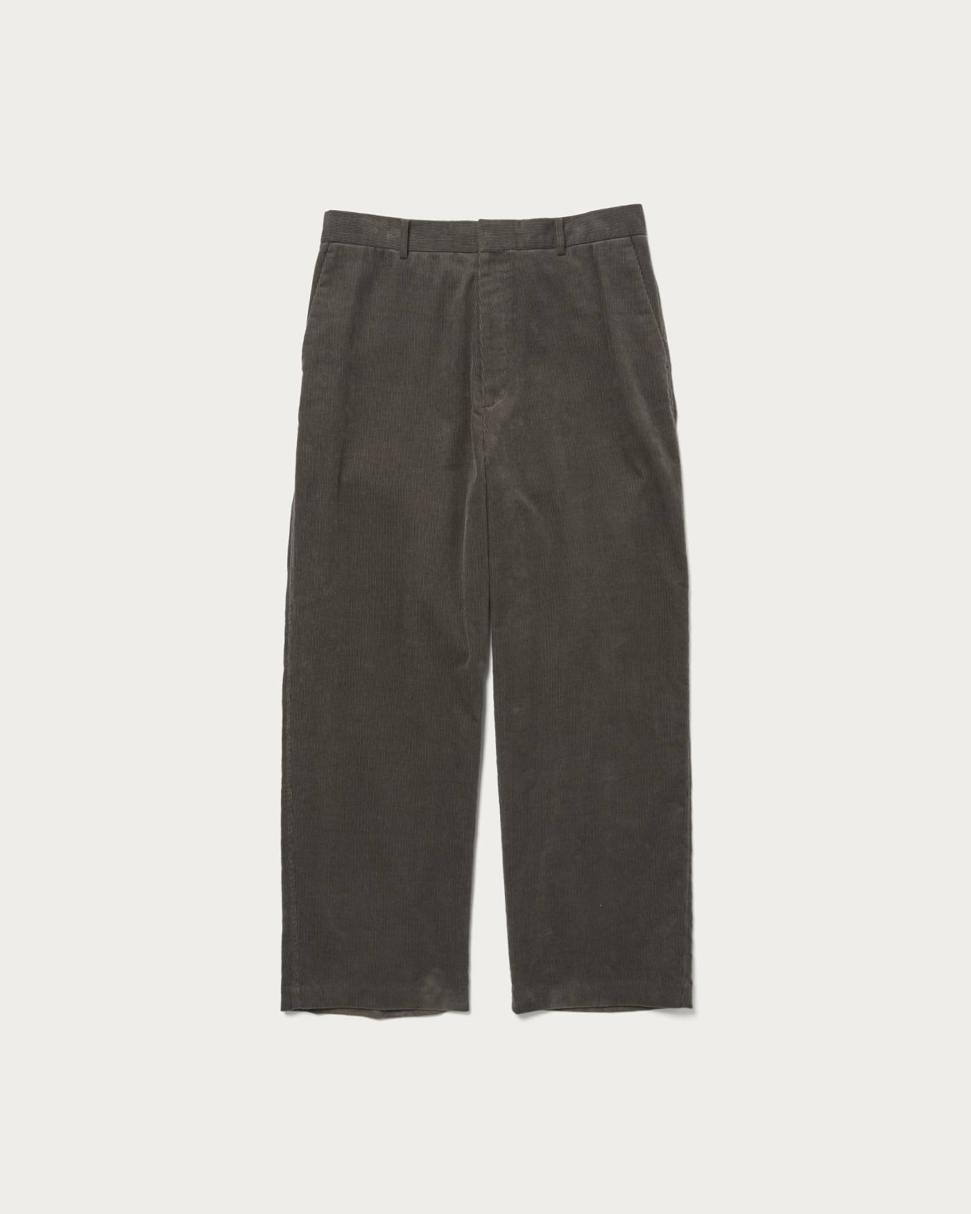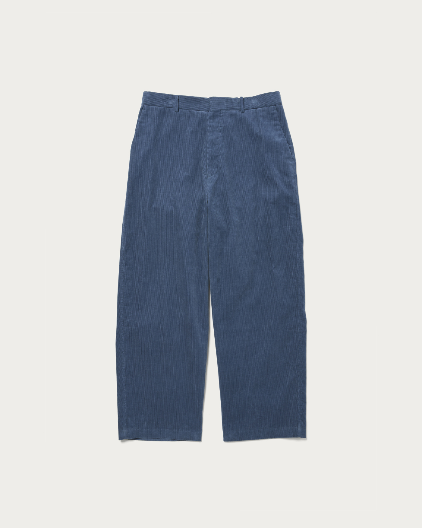This item is crafted as a DIRECTION product number. These are wide straight slacks without pleats. Corduroy pants tend to have a strong classic impression when pleats are added, so we've opted for a no-pleat design to enhance a more polished look. The silhouette is a wide straight cut with generous width at the hips, thighs, and hem.