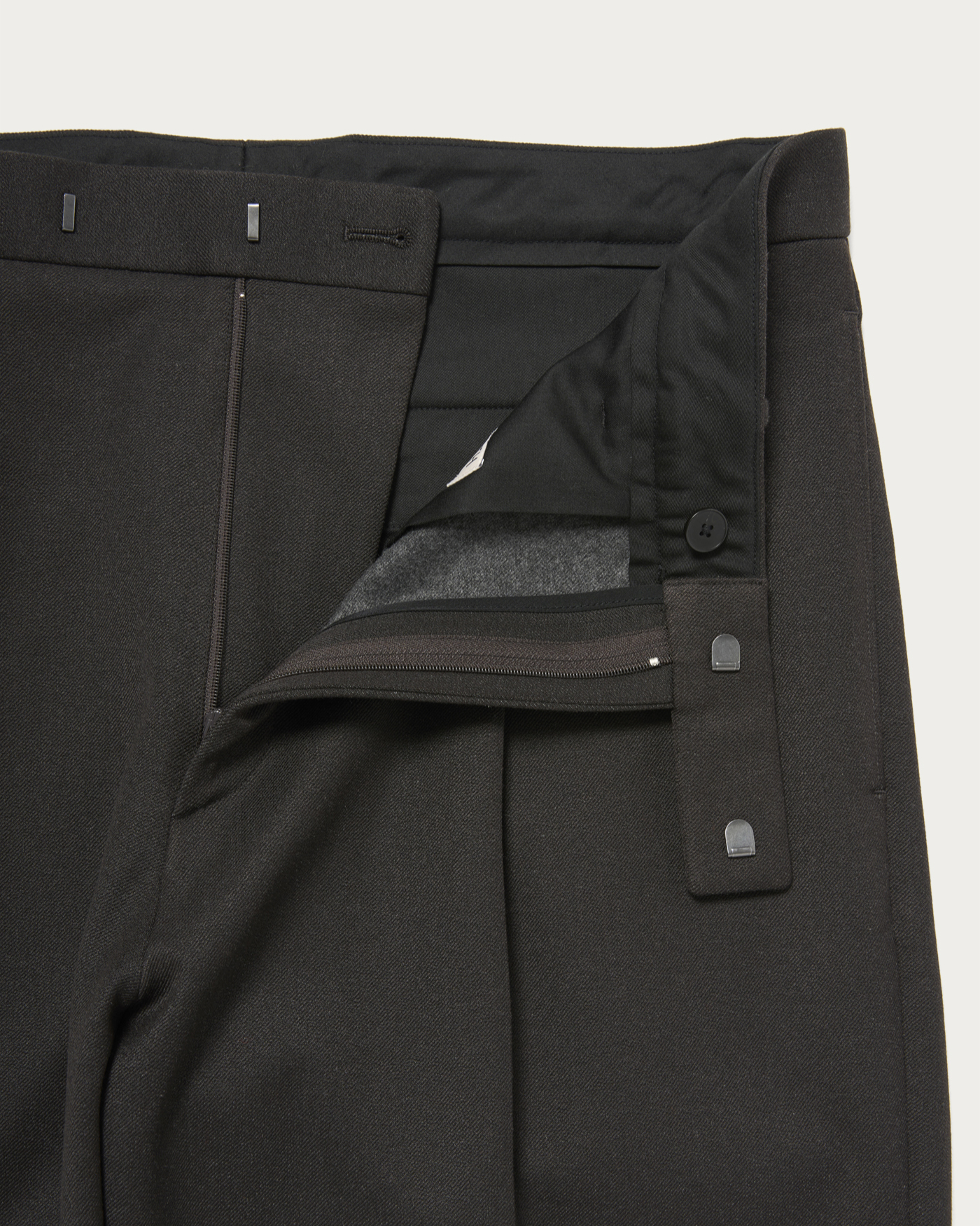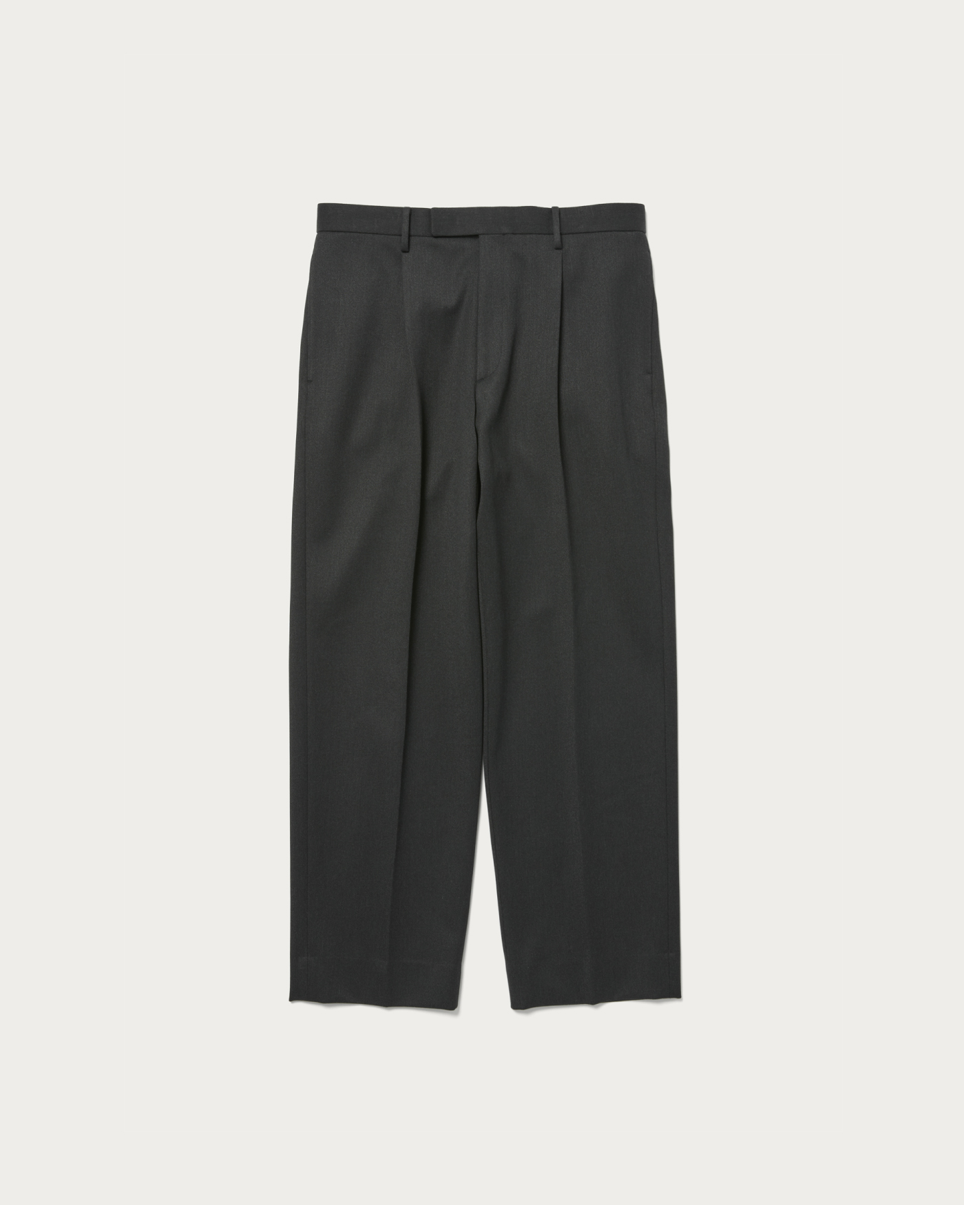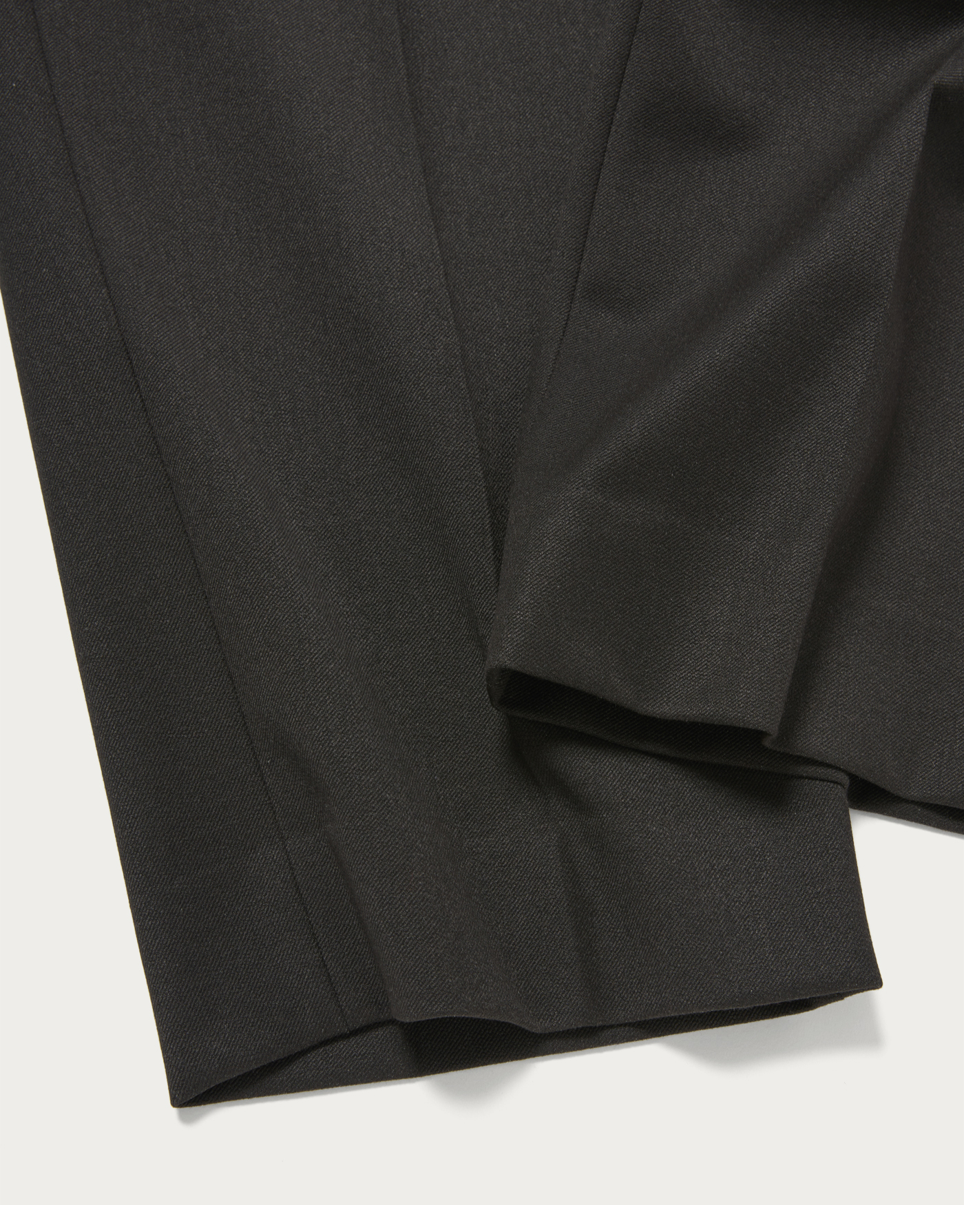 Here is the English translation of the provided Japanese text:"Elegant slacks with a 9 silhouette, designed with the possibility of launching around VP1 in mind. The tapering is slightly less pronounced than the usual number 9, creating a silhouette that falls smoothly even with thicker fabric. A coin pocket is equipped inside the right hip pocket."