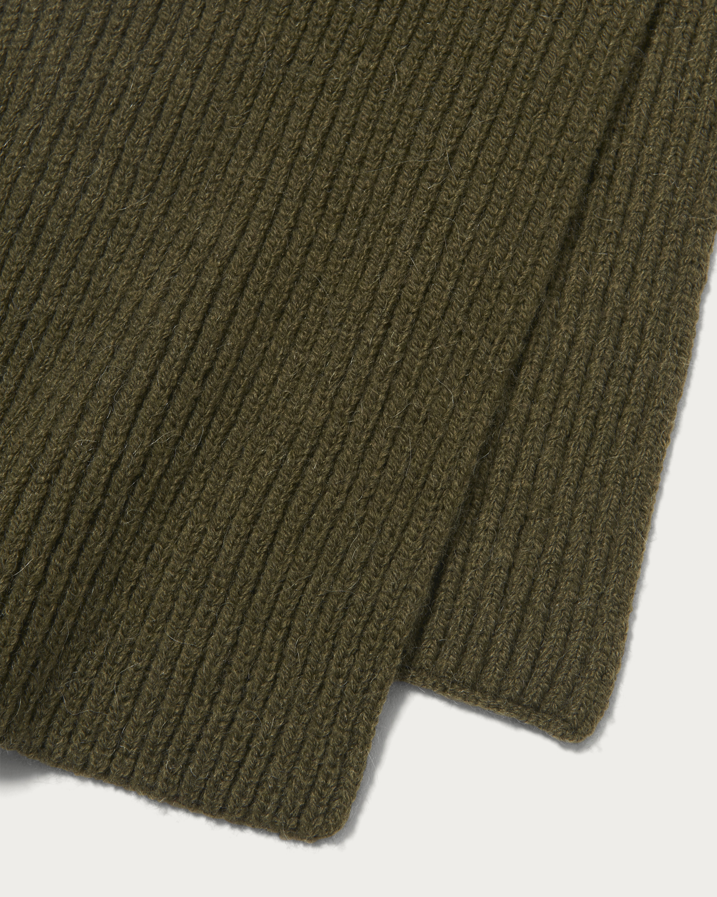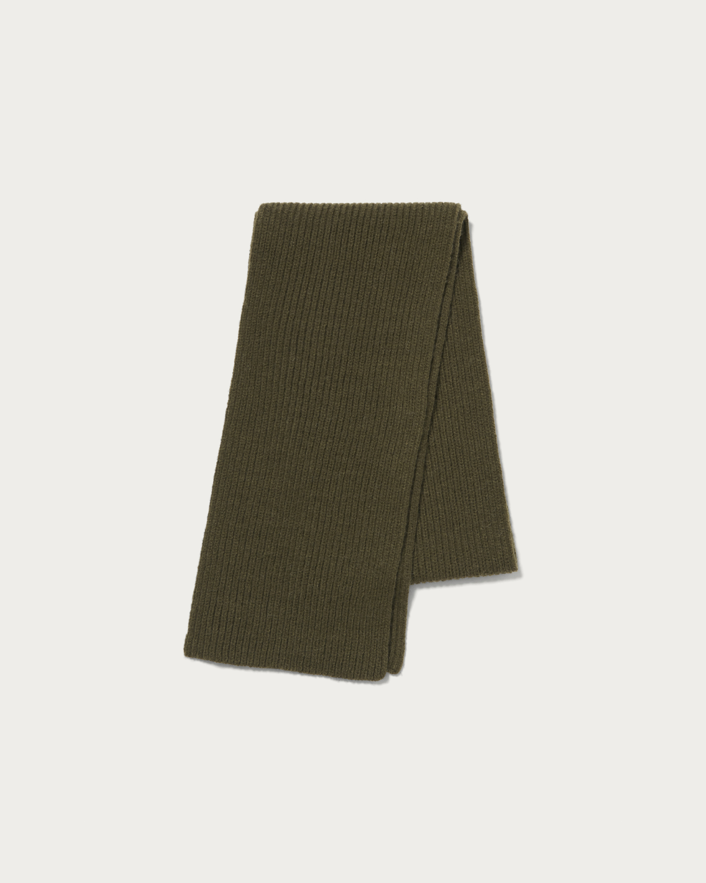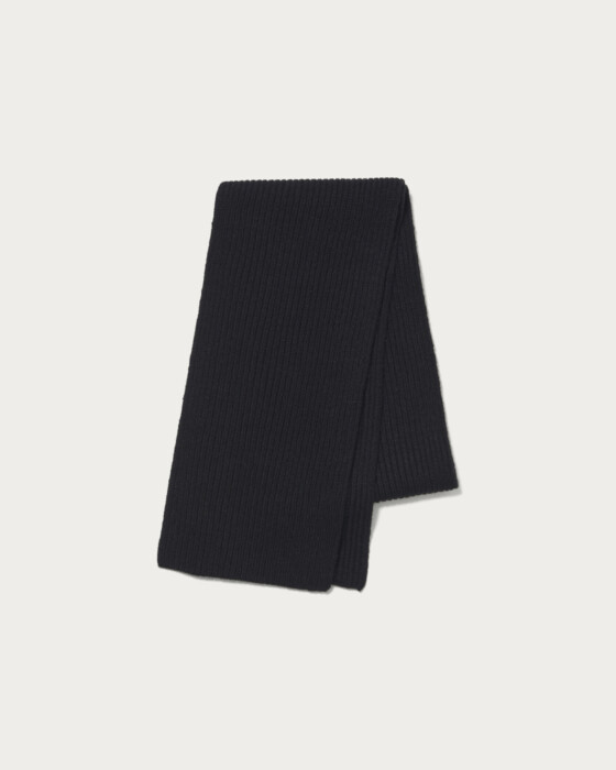 A knit scarf made with yarn characterized by a dry touch and lightness. It features a simple ribbed knit with a dense weave, making it sturdy yet lightweight. Available in three basic colors.