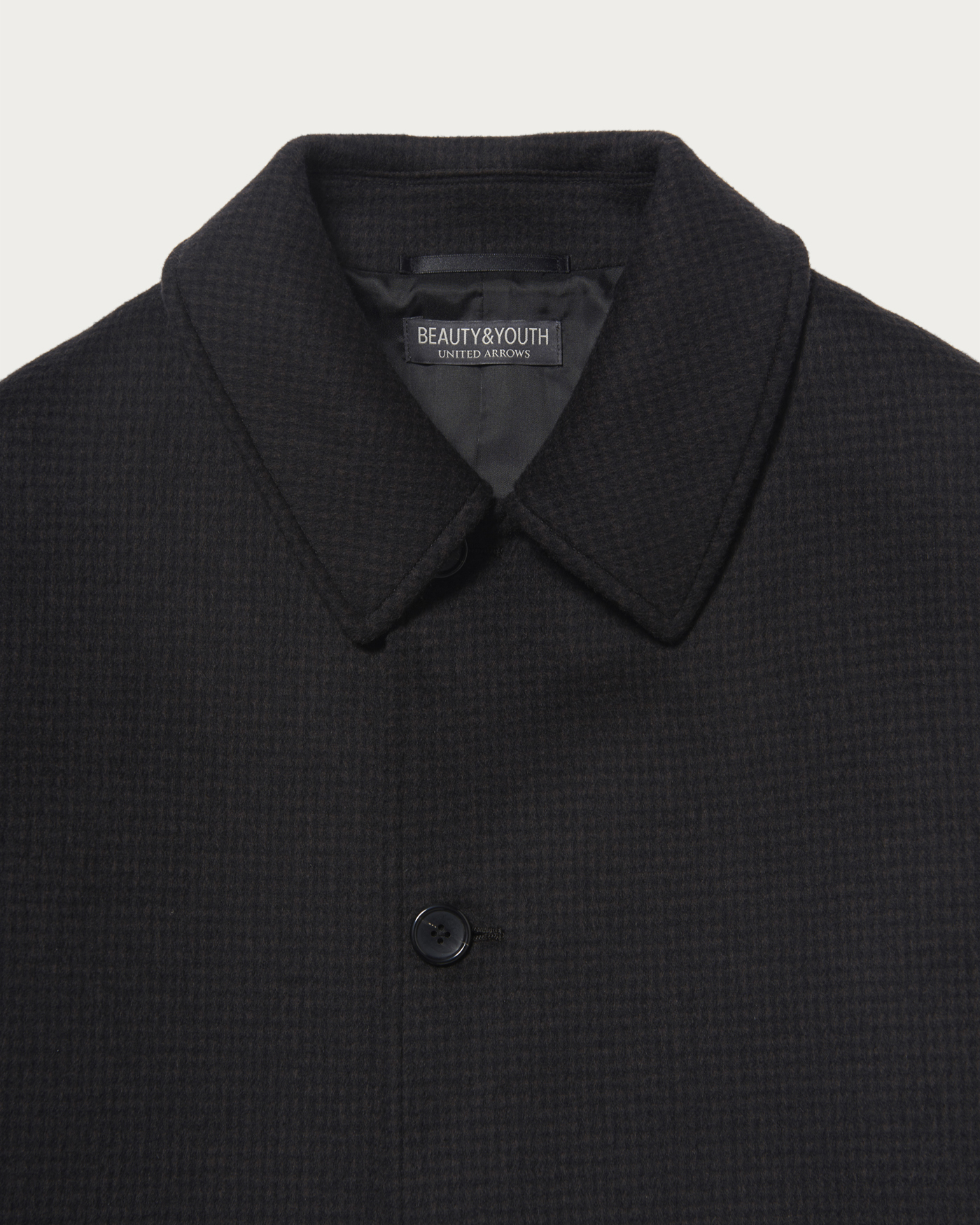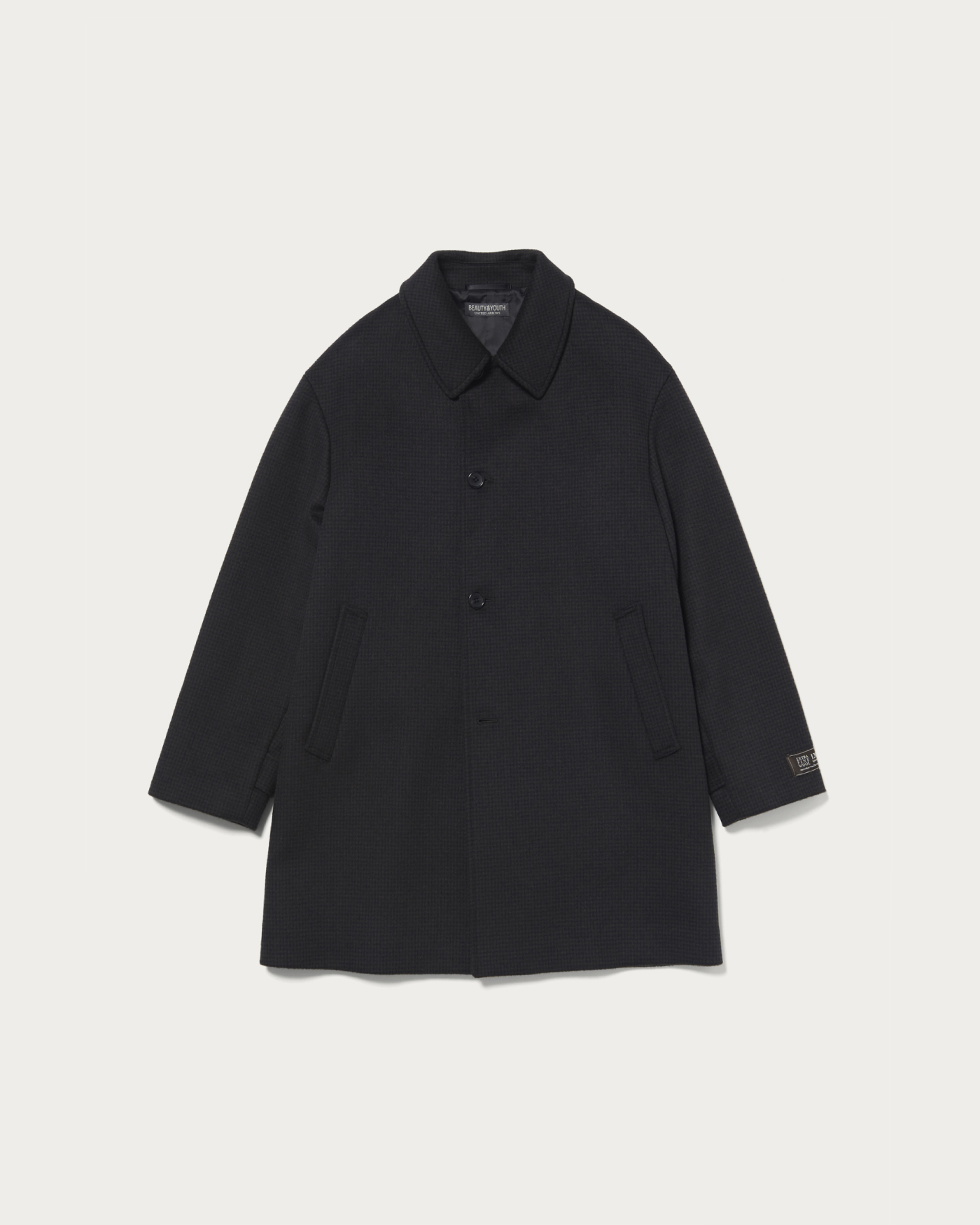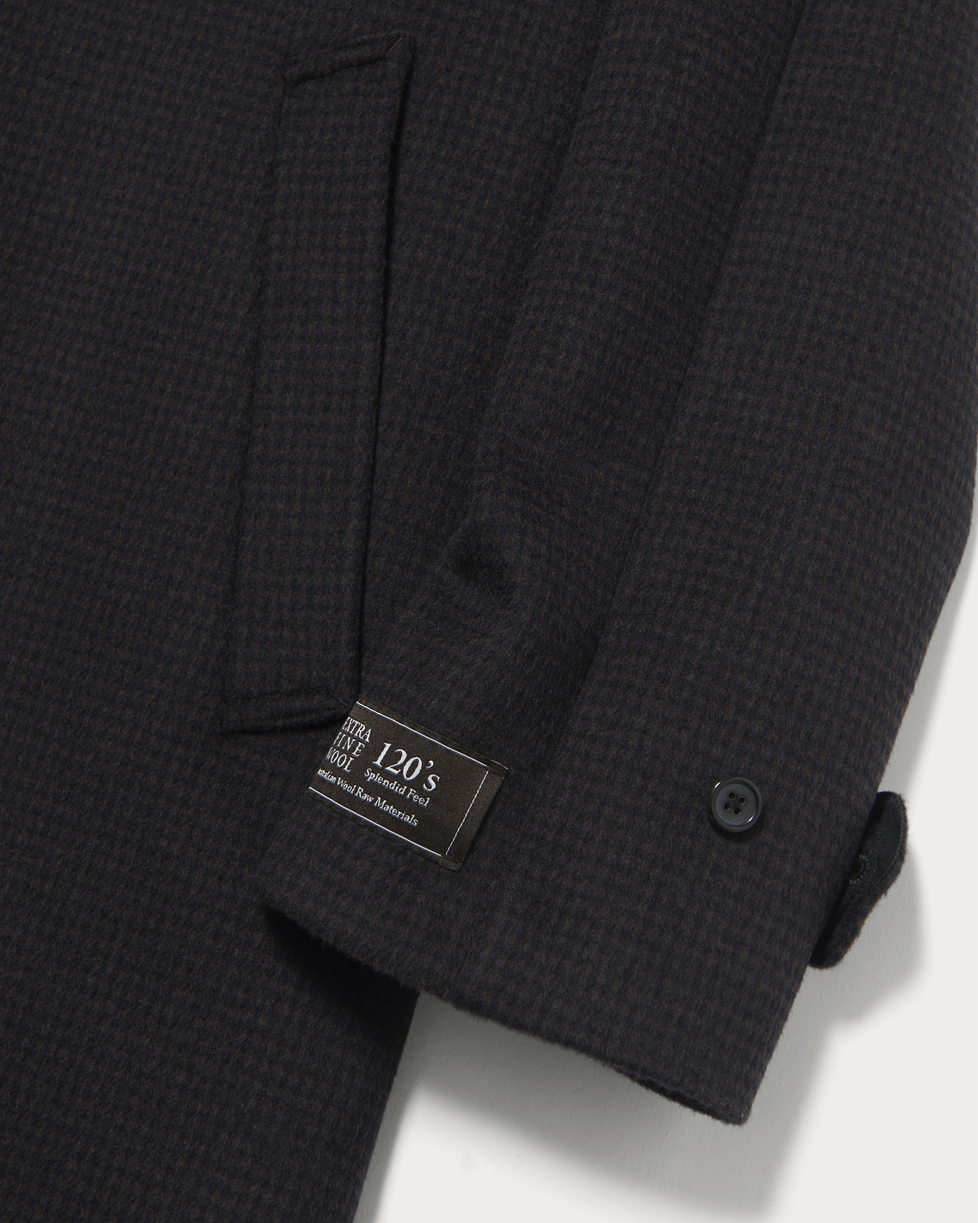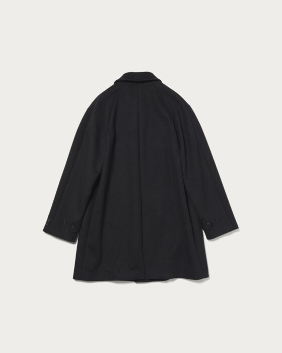 24FW same design. This piece features a slightly compact A-line silhouette, with a length that is not too long, making it suitable for mild winter climates. By using the chin tab located at the lower front, it can be worn with a stand-up collar. It uses a special order Super 120s Melton. All 75% wool is made from Super 120s with long fibers, providing the fabric with smoothness and an elegant sheen. Additionally, the double weave adds thickness and suppleness to the fabric, helping the product achieve a more three-dimensional finish.