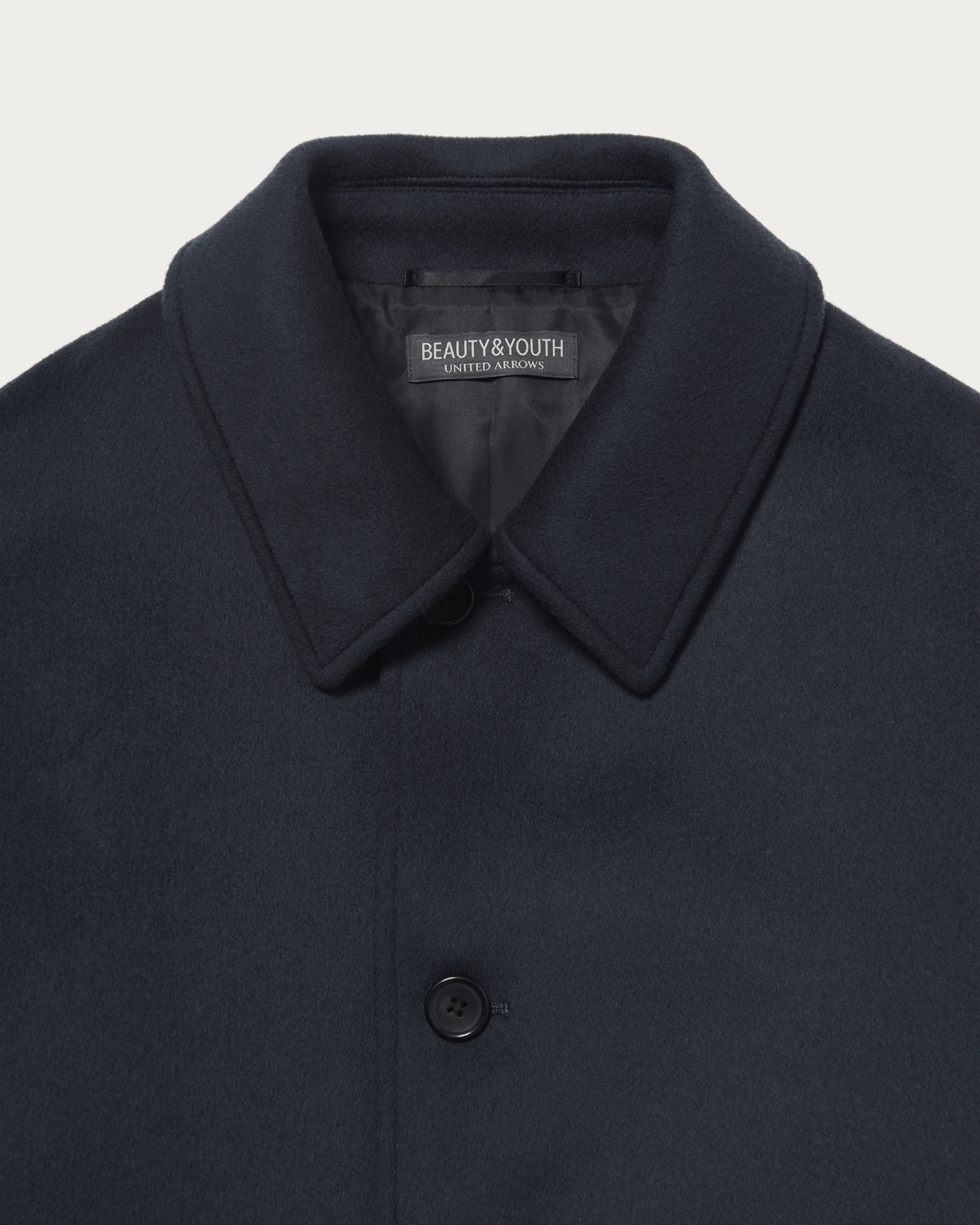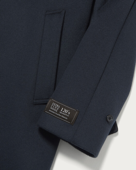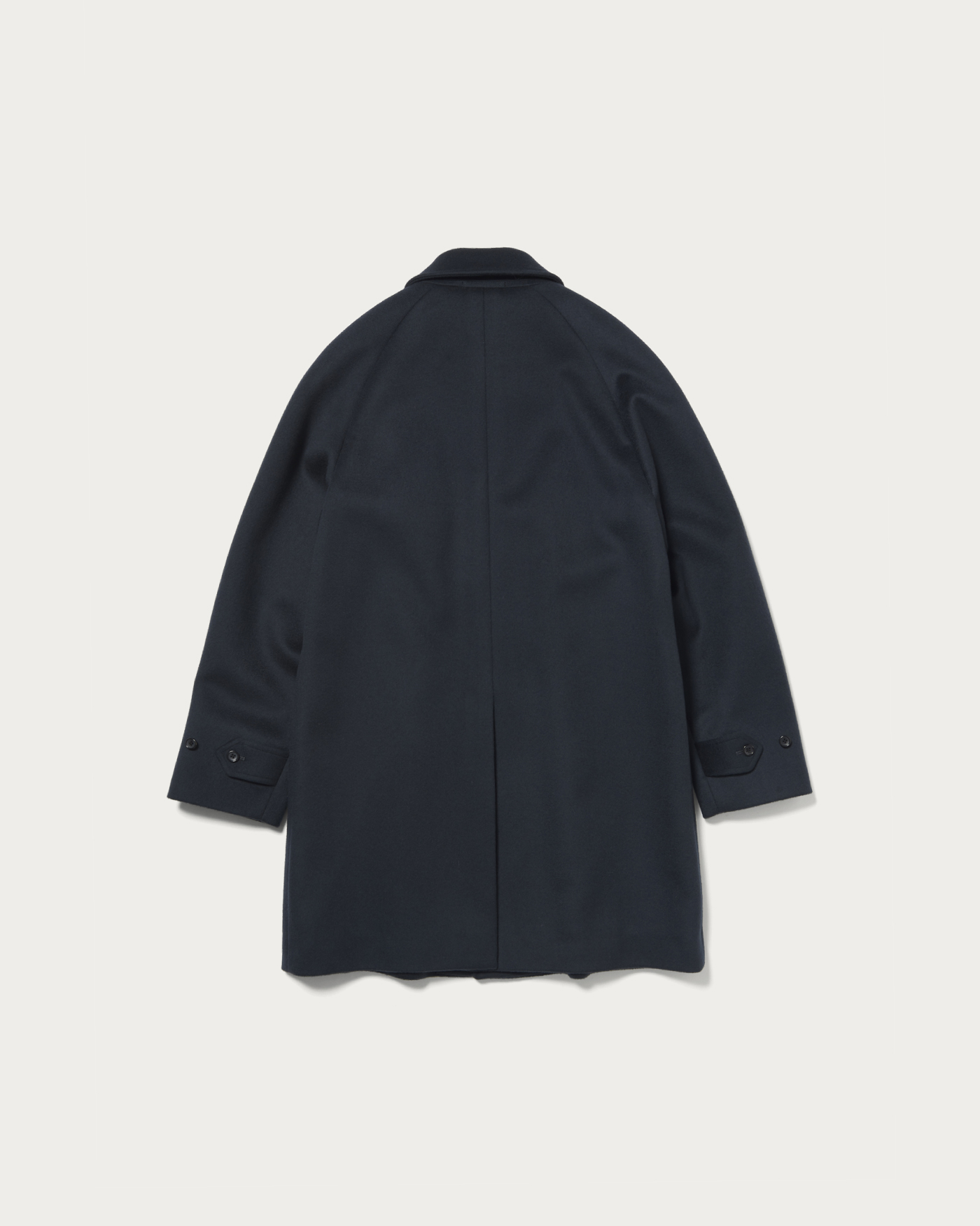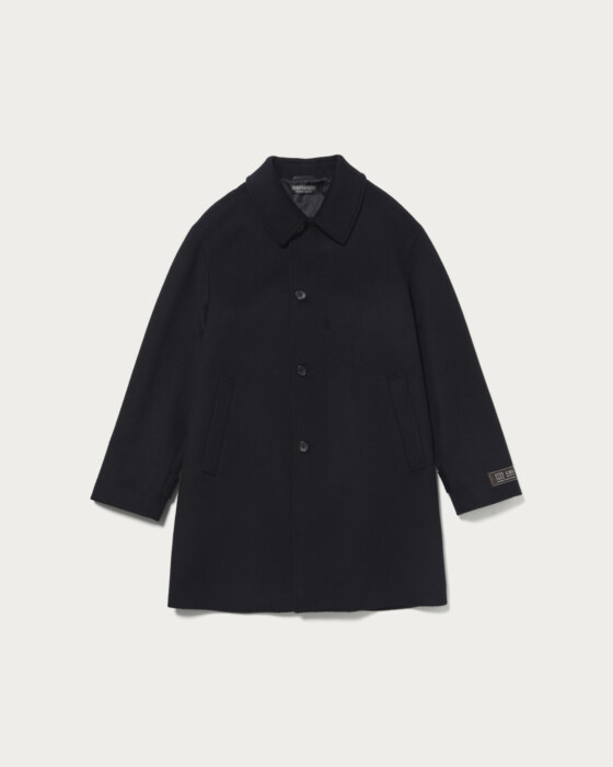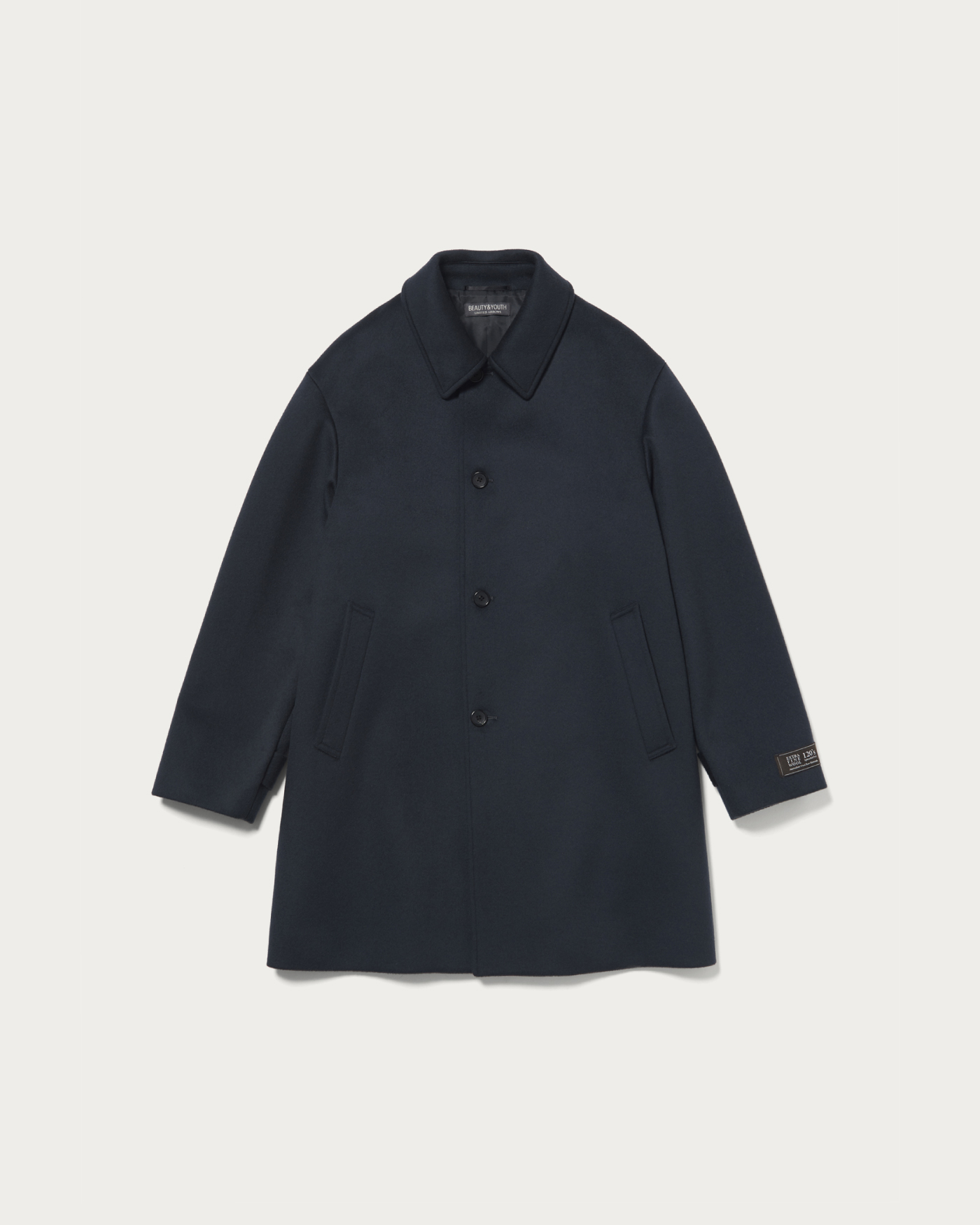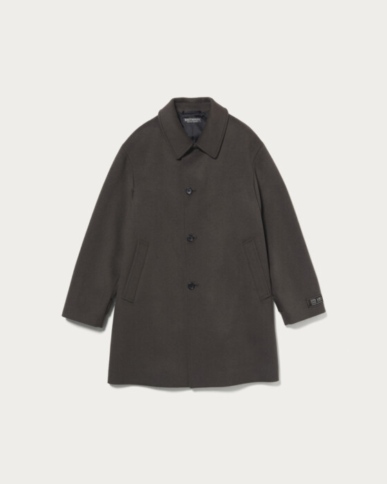 24FW same design. This piece features a slightly compact A-line silhouette, with a length that is not too long, making it suitable for mild winter climates. By using the chin tab located at the lower front, it can be worn with a stand-up collar. It uses a custom Super 120s Melton fabric. All 75% wool content utilizes Super 120s with long fibers, providing the fabric with smoothness and an elegant sheen. Additionally, the double weave adds thickness and suppleness to the fabric, helping the product achieve a more three-dimensional finish.