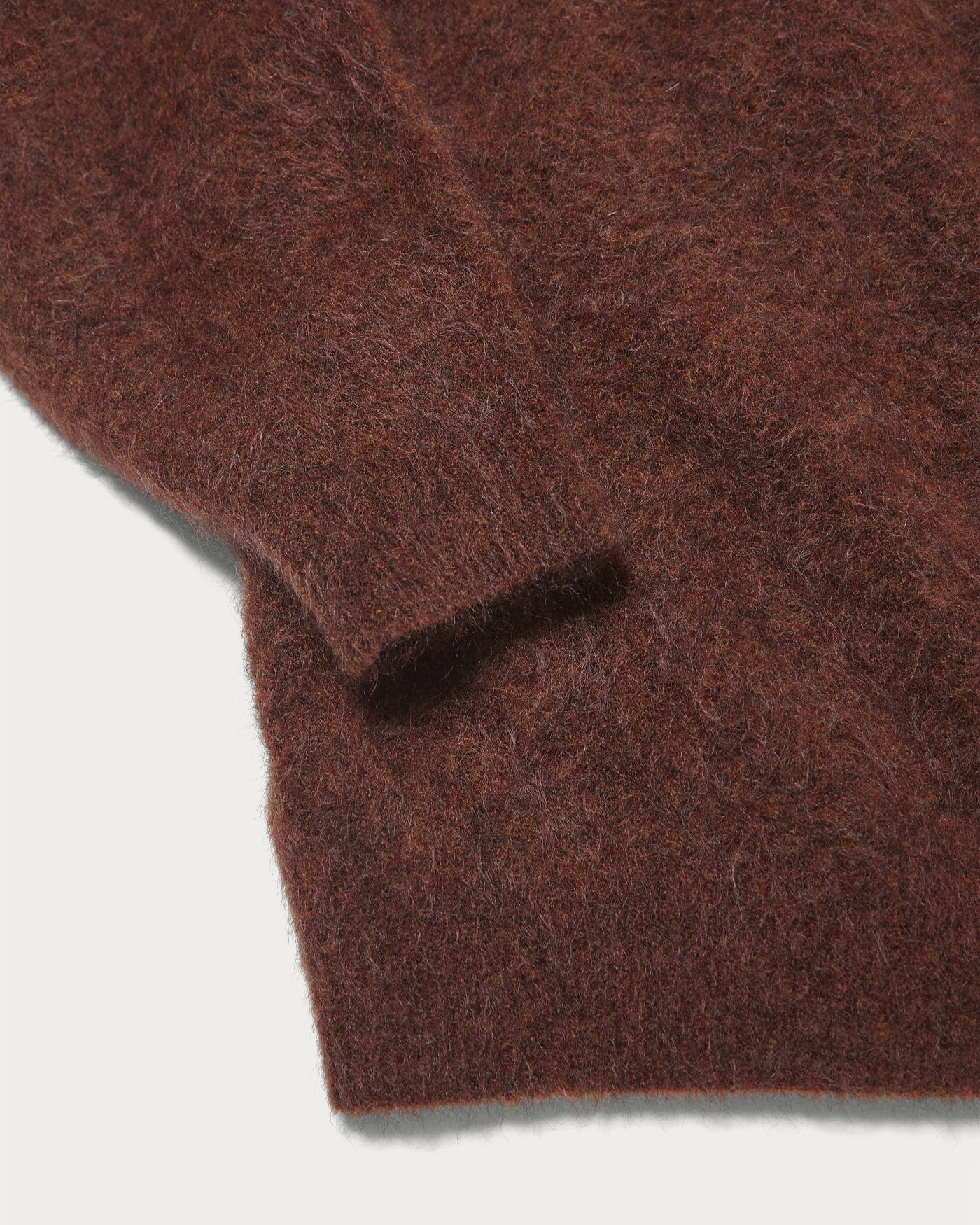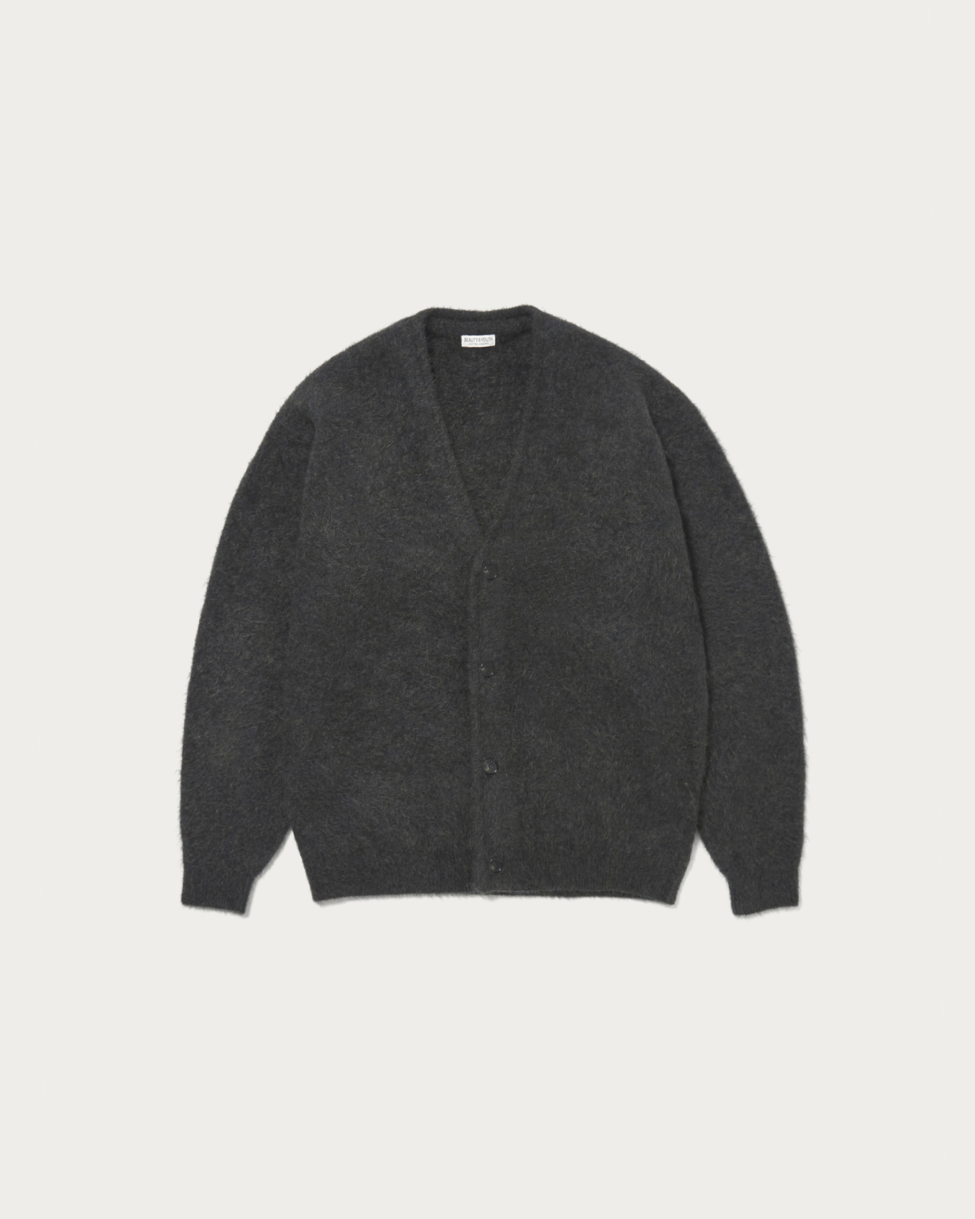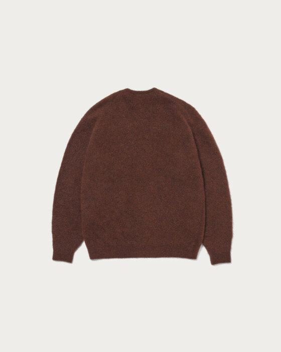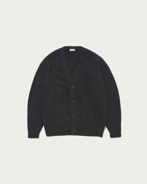 A V-neck cardigan crafted from luxurious mohair shaggy material, developed using vintage mohair cardigans as a design source. It features a moderately loose silhouette that pairs easily with relaxed T-shirts or shirts. The generous silhouette allows it to be worn as an outer layer during early autumn. While maintaining a refined and sophisticated appearance, it also exudes a subtle grunge mood. The material is a kid mohair mix crafted by the Italian company "LINEAPIU," favored by maison brands. The material is impressive with its voluminous and plush finish, offering a smooth touch and lightness not found in vintage mohair cardigans.