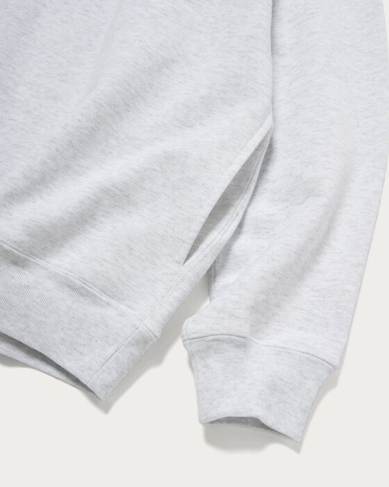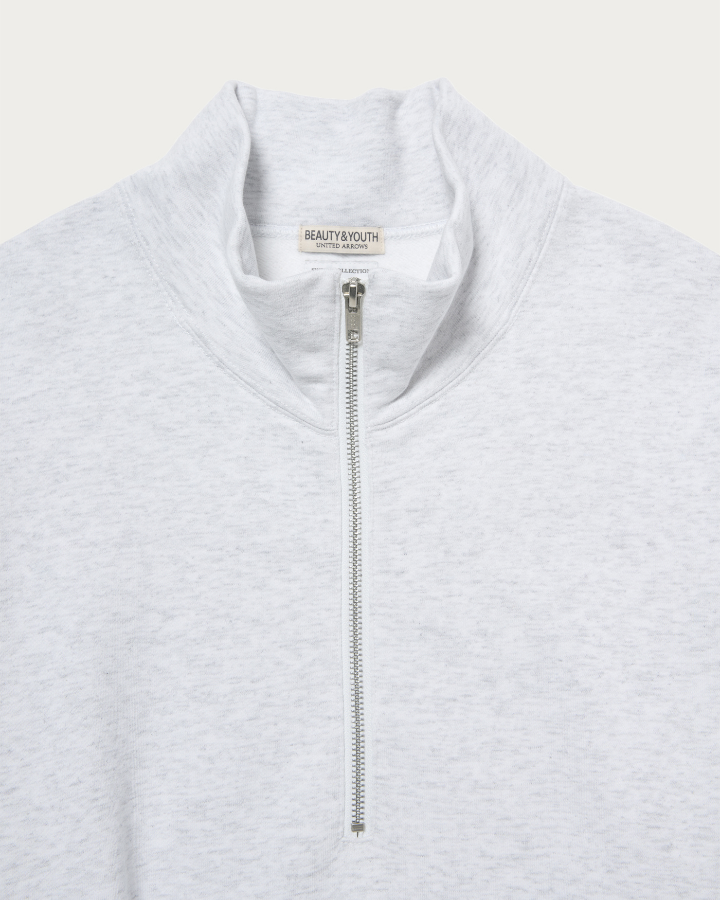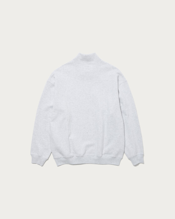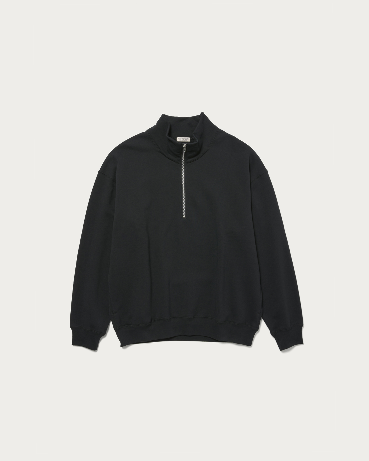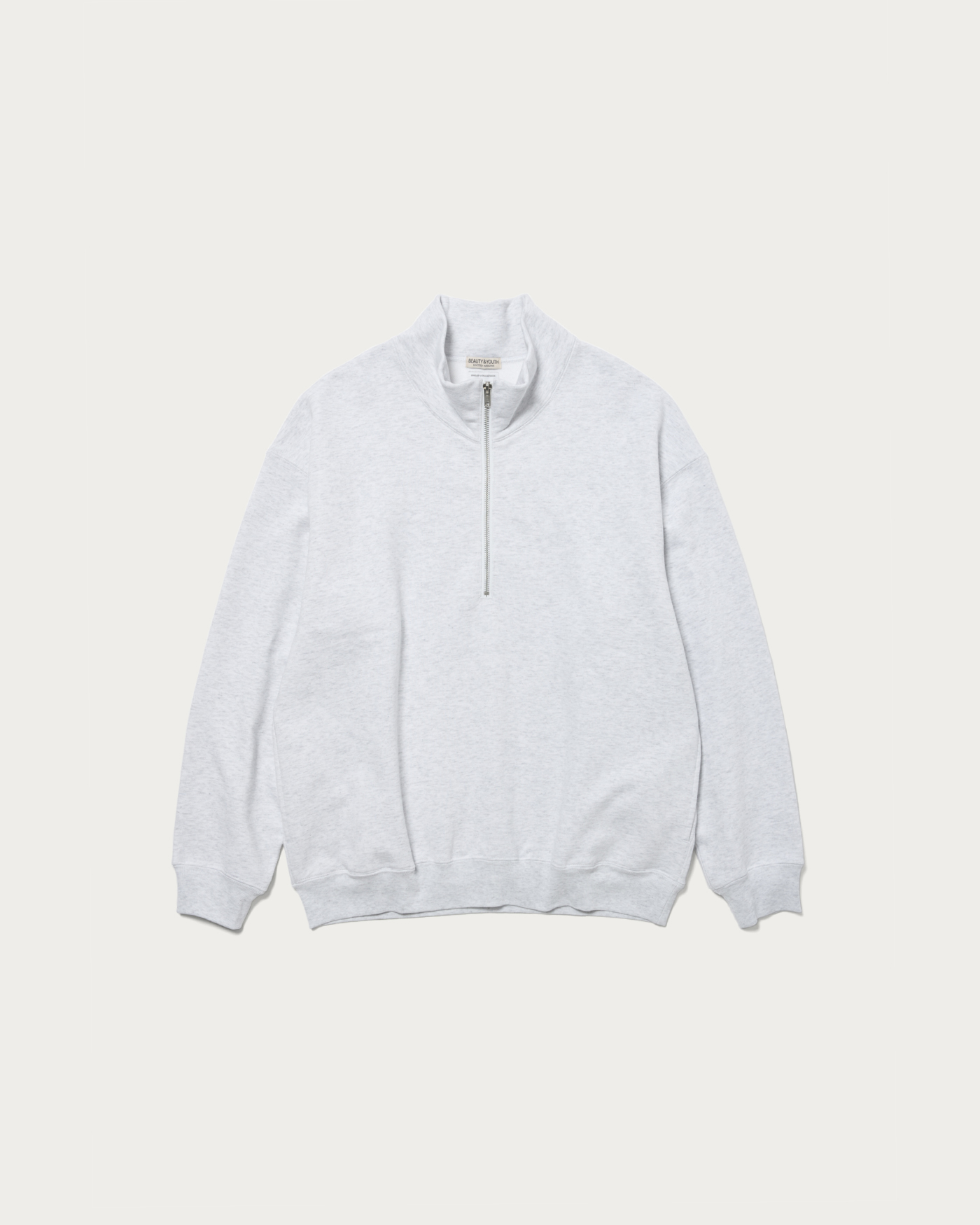 The 25FW Edition "SNAZZY" Sweatshirt Series. SNAZZY... Stylish, Chic. A sweatshirt series proposed as an outfit for going out. Instead of the typical crew neck, we offer a lineup of sweatshirts with a focus on design. The half-zip features a 2-way style that allows you to wear it with the collar raised or laid flat, which we highly recommend. It comes with waist pockets, allowing it to be worn like outerwear. With bio-silket processing, the surface is free of fuzz, giving it a clean and polished appearance. The fabric is tightly knitted, providing a firm texture that makes it a substantial choice for men's sweatshirts. The inside is lightly brushed, making it a material that can be worn comfortably throughout the season without being overly warm.