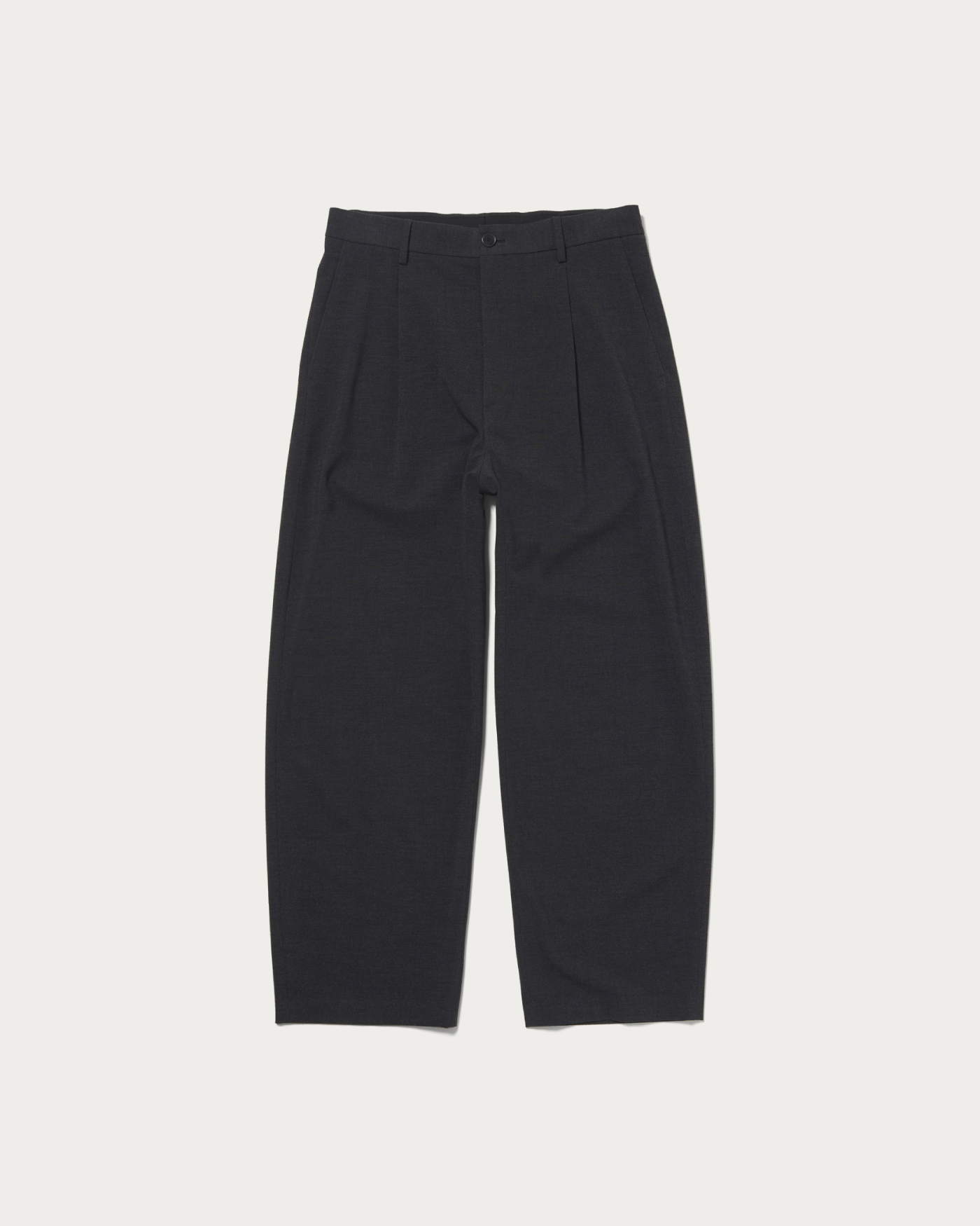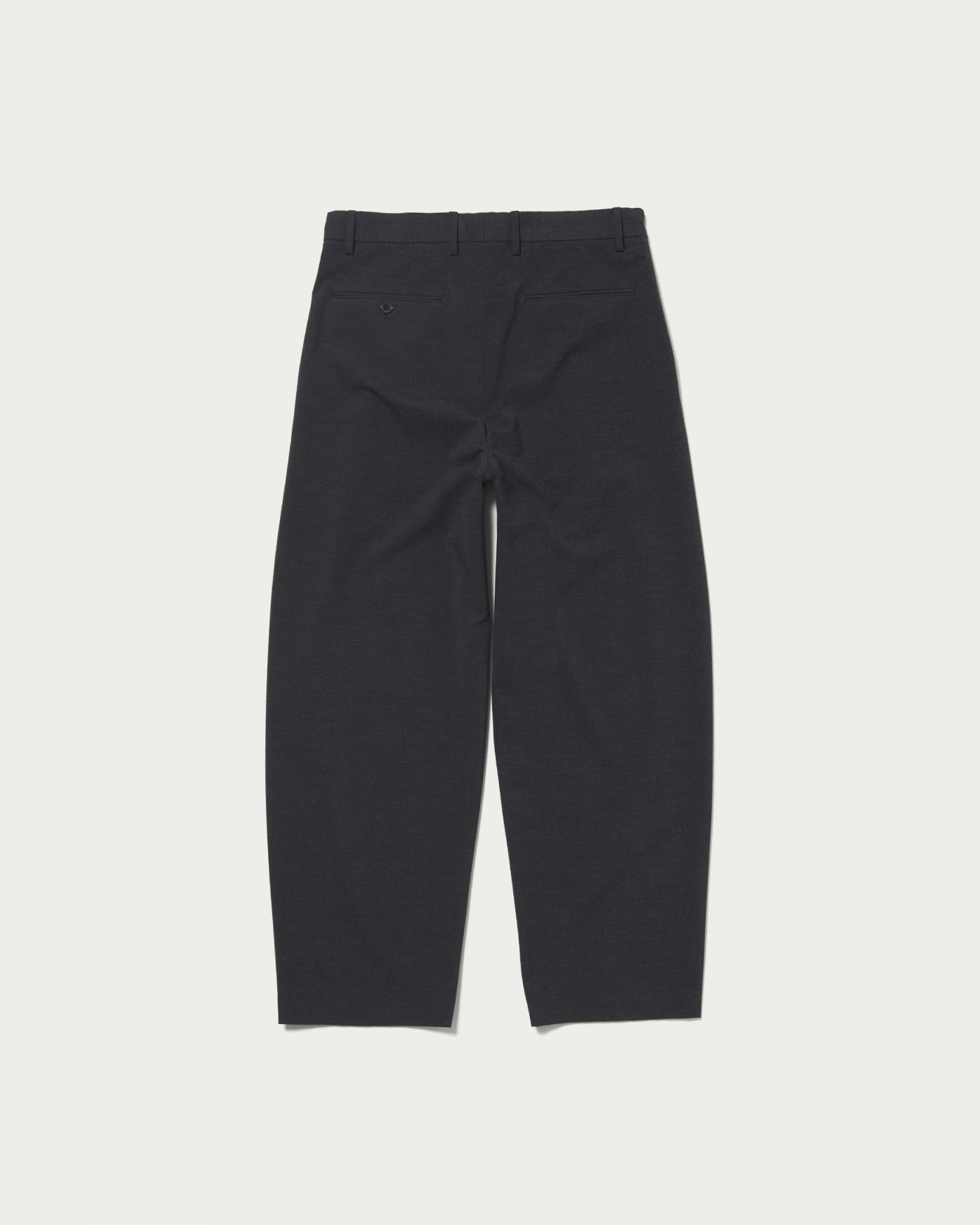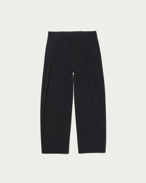 The word "BARREL" means a barrel. We are introducing a new barrel-shaped silhouette with a wide knee width that tapers towards the hem. Made from fabric with a wool-like texture, these simple slacks are designed for you to enjoy the change in silhouette. Available in two colors, black and charcoal, we also recommend styling them for a modern look. The fabric, a blend of TR (polyester and rayon) with added polyurethane, provides volume and, with a brushed finish, offers a wool-like texture. The reverse side is also slightly brushed, providing a smooth feel against the skin, making it a very comfortable material to wear.