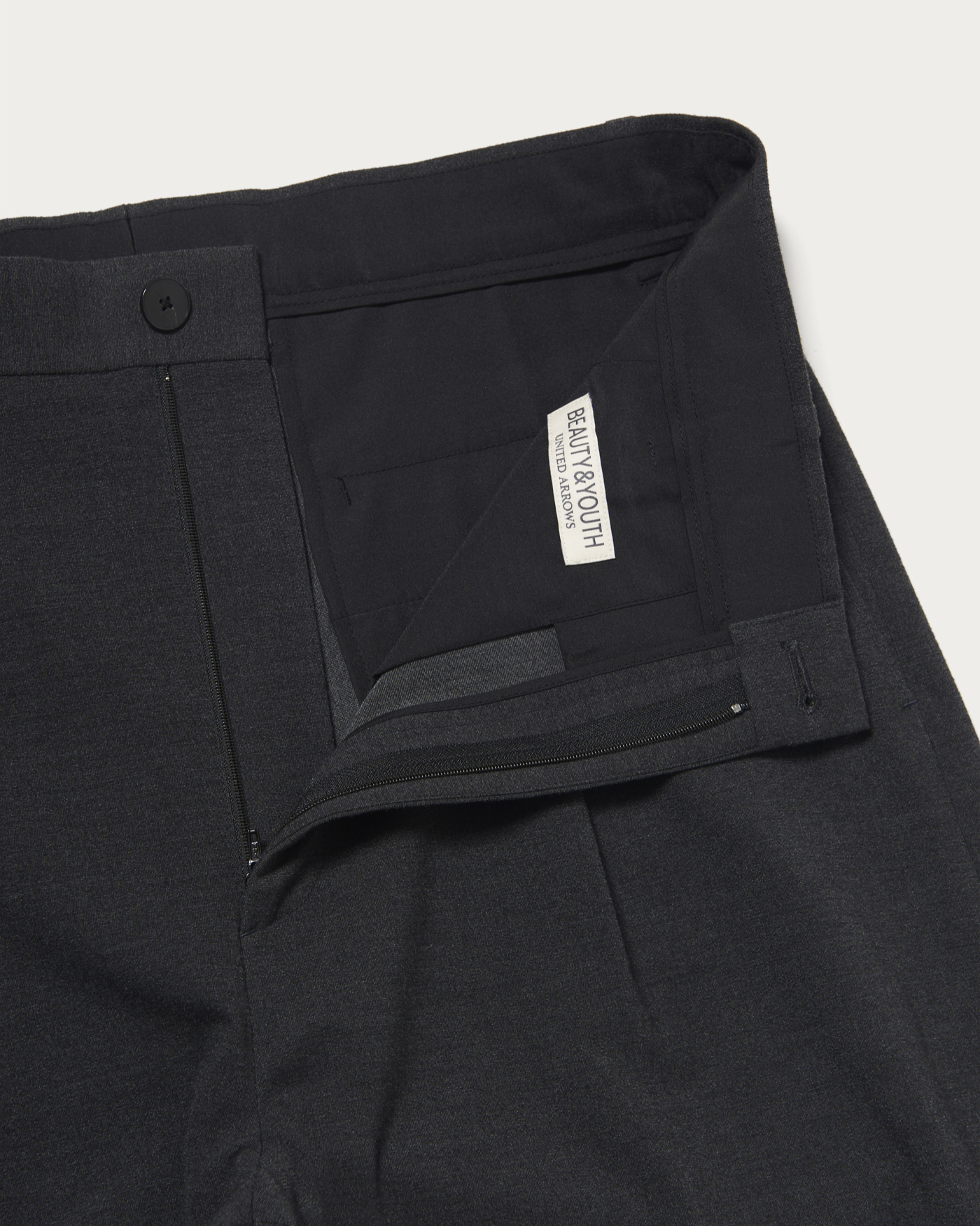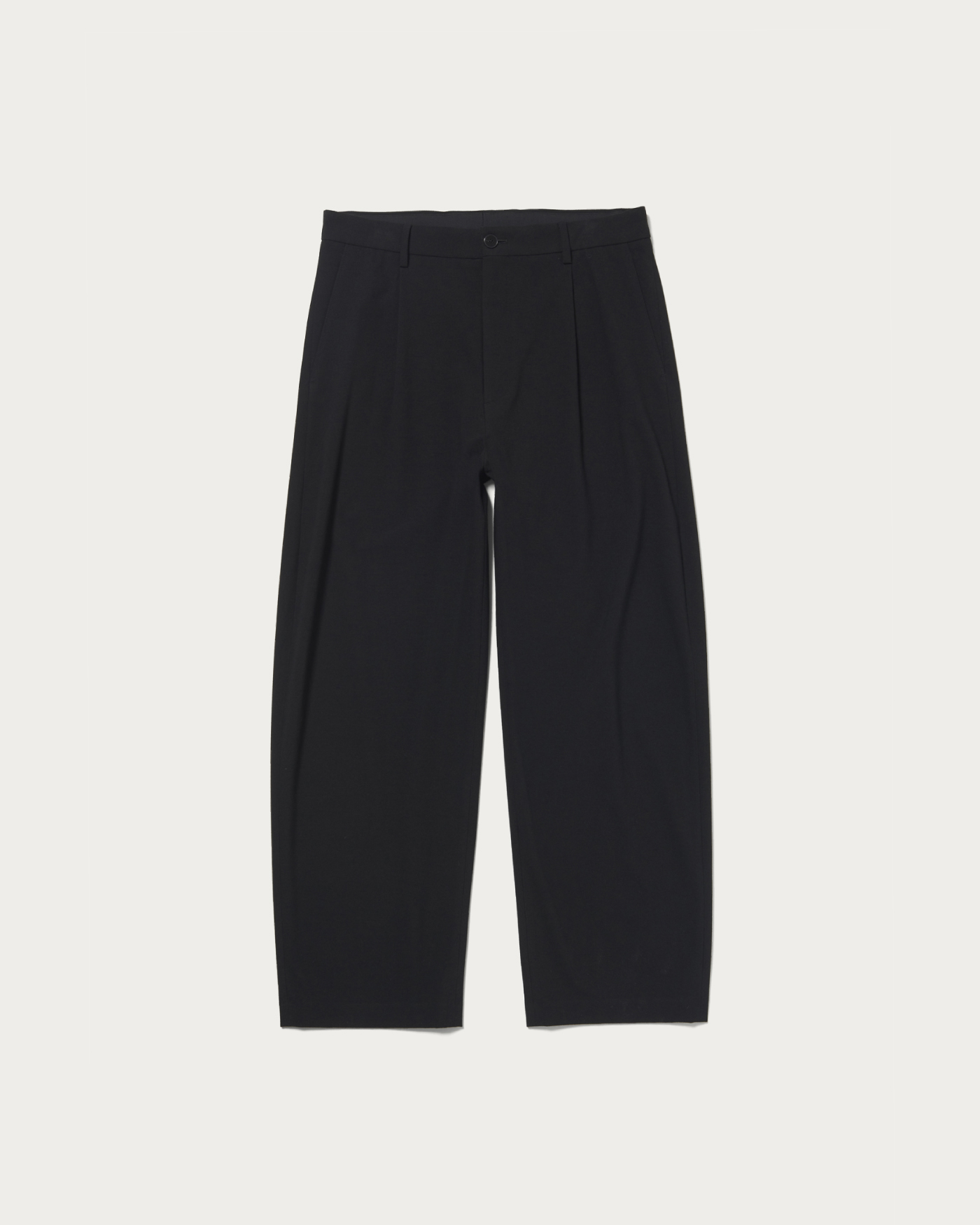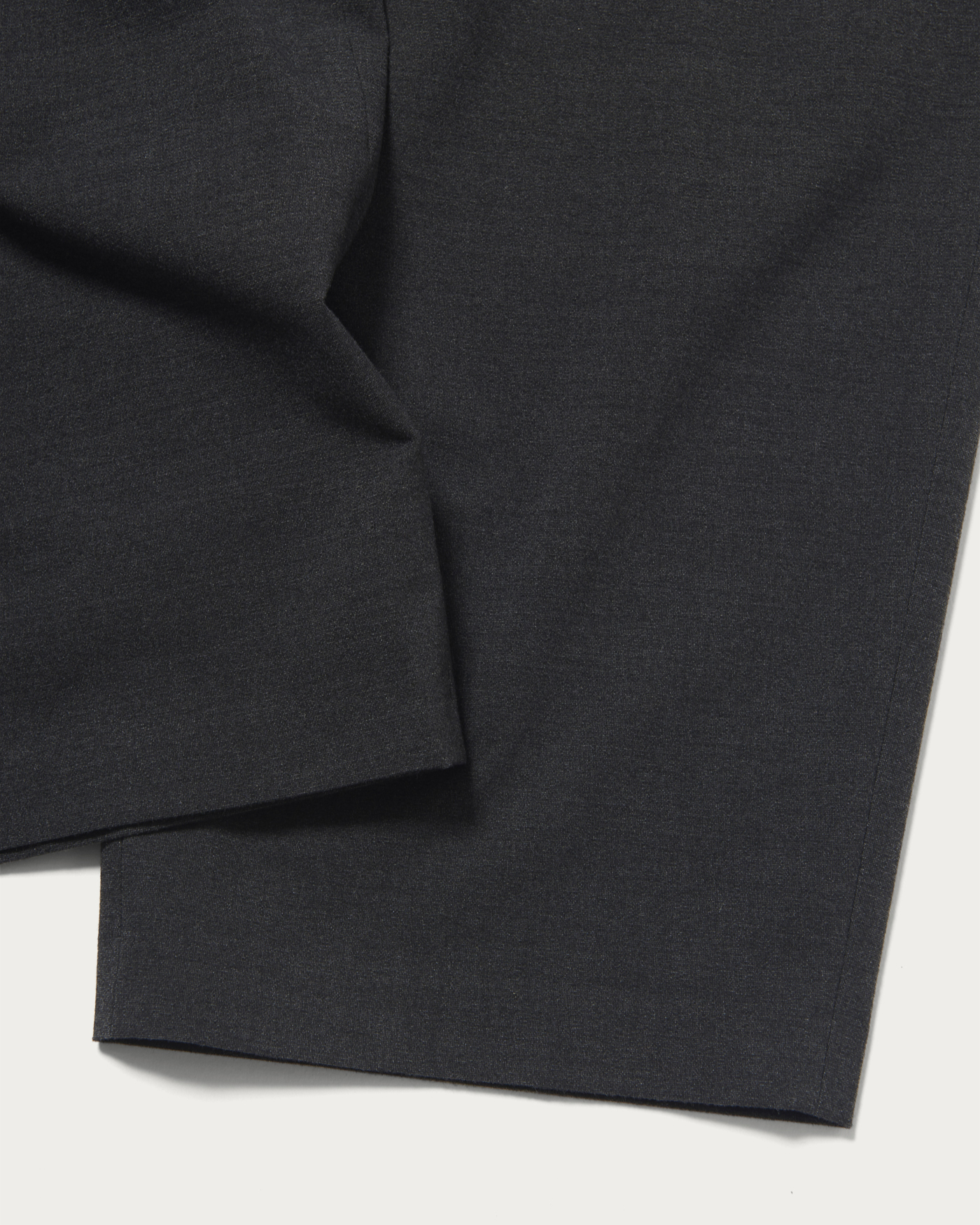 The word "BARREL" means a barrel. We are introducing a new barrel-shaped silhouette with a wide knee width that tapers towards the hem. Made from fabric with a wool-like texture, these simple slacks are designed for you to enjoy the change in silhouette. Available in two colors, black and charcoal, we also recommend styling them for a modern look. The fabric, a blend of TR (polyester and rayon) with added polyurethane, provides volume and, with a brushed finish, offers a wool-like texture. The reverse side is also slightly brushed, providing a smooth feel against the skin, making it a very comfortable material to wear.