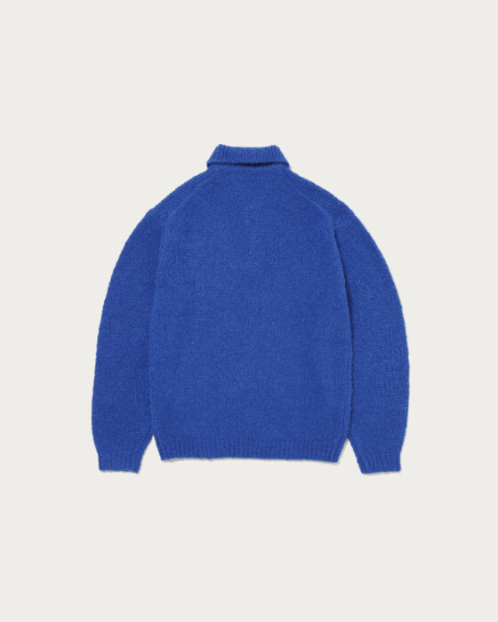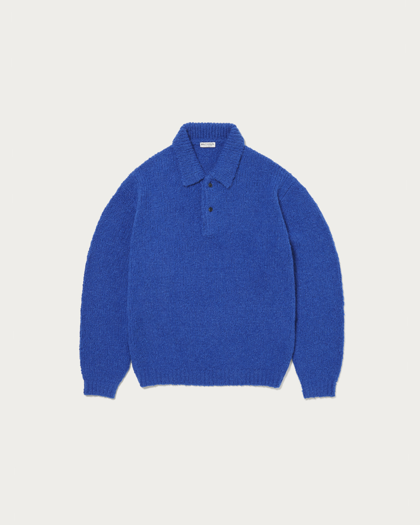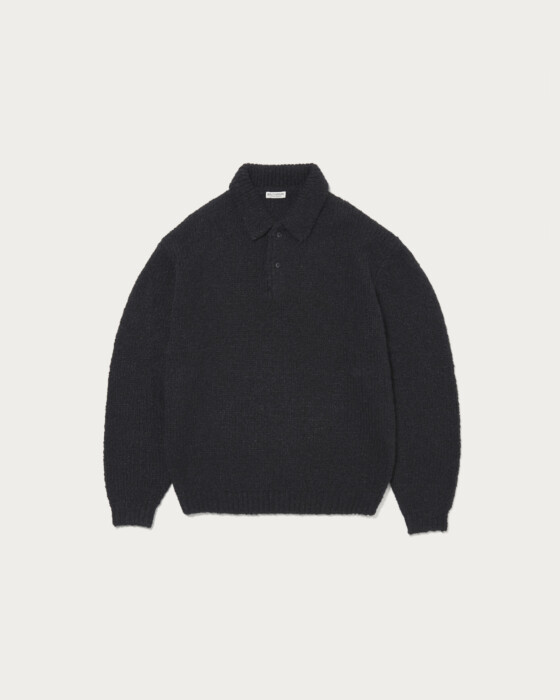 This knit polo features a distinctive bubble yarn with a bubbly, three-dimensional surface texture. Despite its volume, it is lightweight due to the unique characteristics of the yarn shape. The design is simple, yet the three-dimensional material gives it a strong presence. It has a relaxed silhouette with just the right amount of roominess. The special material used is a boucle yarn crafted by the Italian company "LINEAPIU," favored by maison brands, which is brushed in its yarn state. It is characterized by a fluffy texture and surface feel. Thanks to its unique shape, it maintains volume while being relatively lightweight.