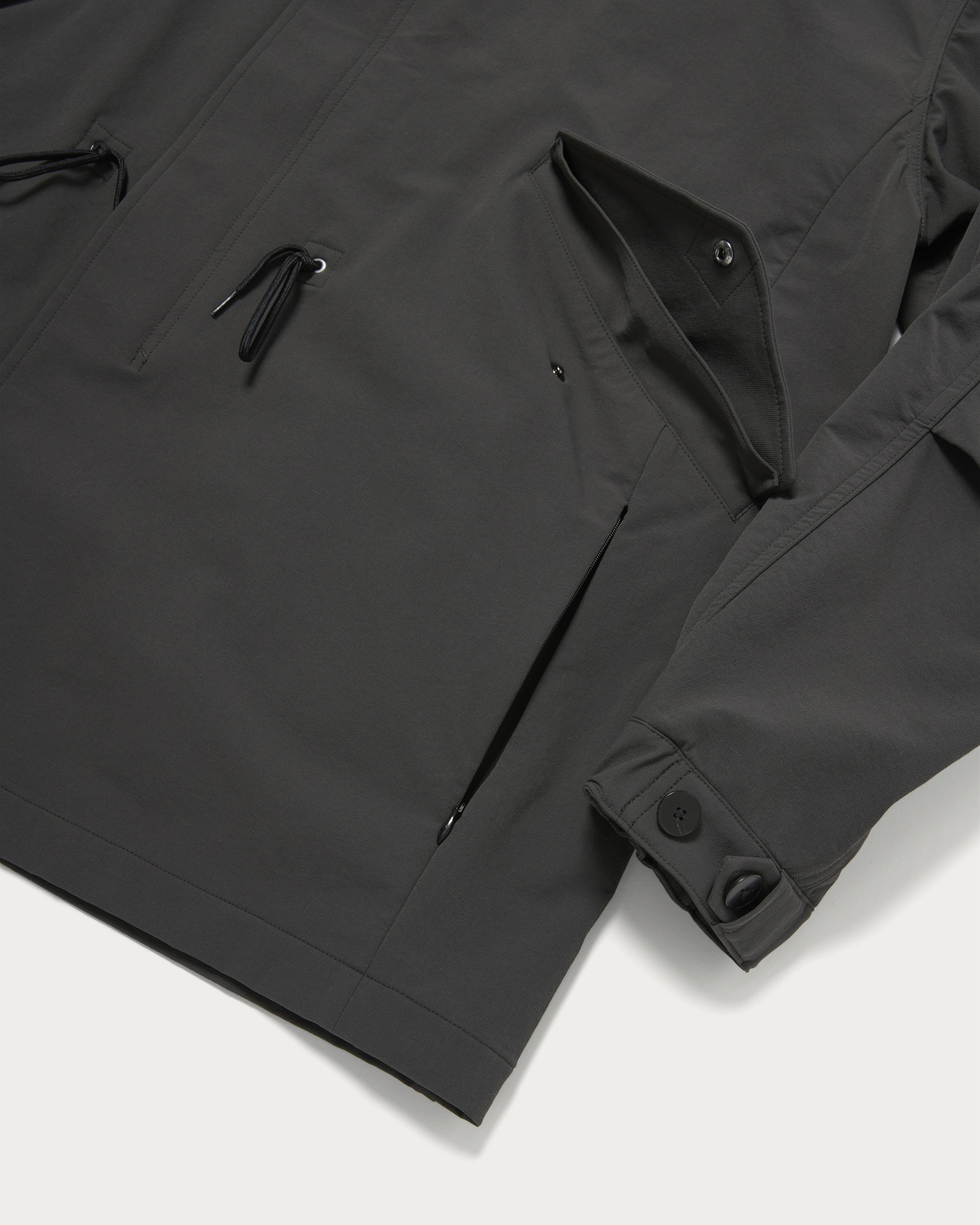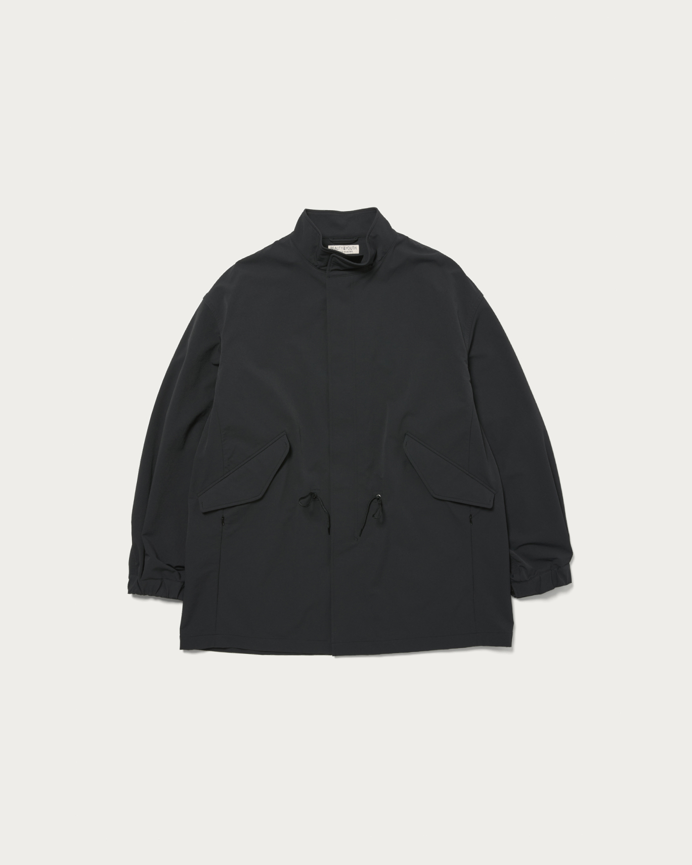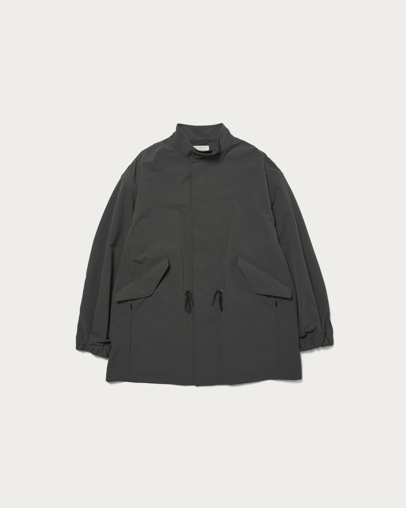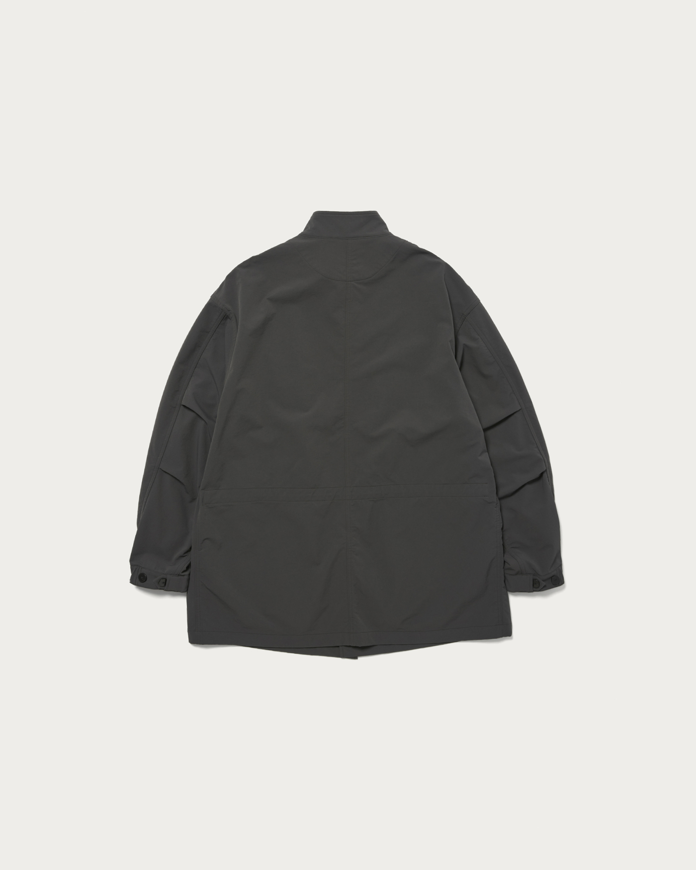 This is a single-layer military coat based on the M-65 design, featuring a slightly wide silhouette that allows for versatile layering as you head into the depths of winter. The cuffs and waist come with adjustable drawstrings for a customizable fit. Additionally, there are hand-warmer pockets with concealed zippers located at the sides of the waist flaps, enhancing usability. The fabric is the same Komatsu Matere material as the setup item number. Made from nylon and polyurethane, the fabric is highly elastic and appears suitable for year-round use, but the brushed interior adds a seasonal touch for autumn and winter.