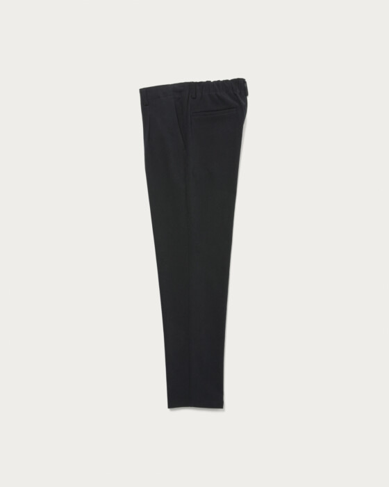Tapered silhouette pants similar to those from the 24FW collection. These pants have no center crease, giving them a moderately casual appearance. The back of the waist features an elastic shirring design, and the front spindle allows for fine adjustments. Additionally, there is a coin pocket inside the right hip pocket. The pants are made from a specially ordered, slightly glossy washer velvet. With a casual shadow effect and a neatly brushed texture, they are designed to be easily worn in everyday settings. The navy color, in particular, is a dark shade close to black, but the material's characteristics stand out. There aren't many setups in the market using seasonal fabrics that are not wool-based, so we highly recommend this product.