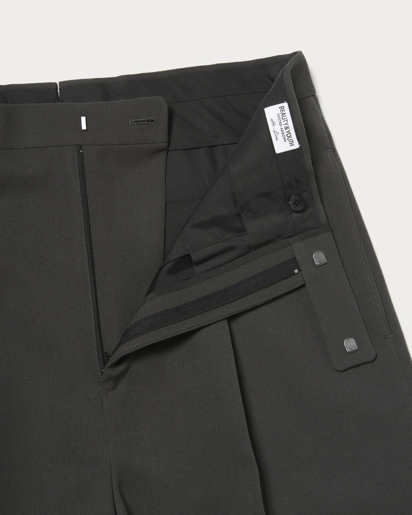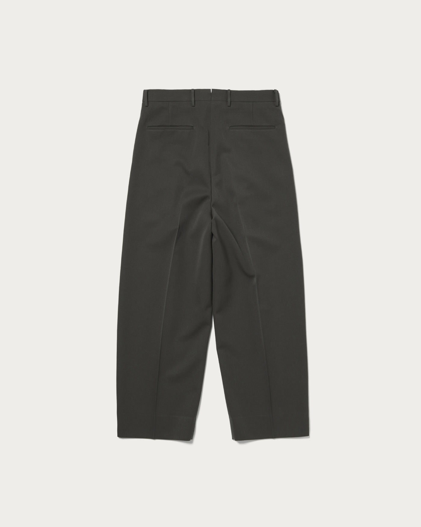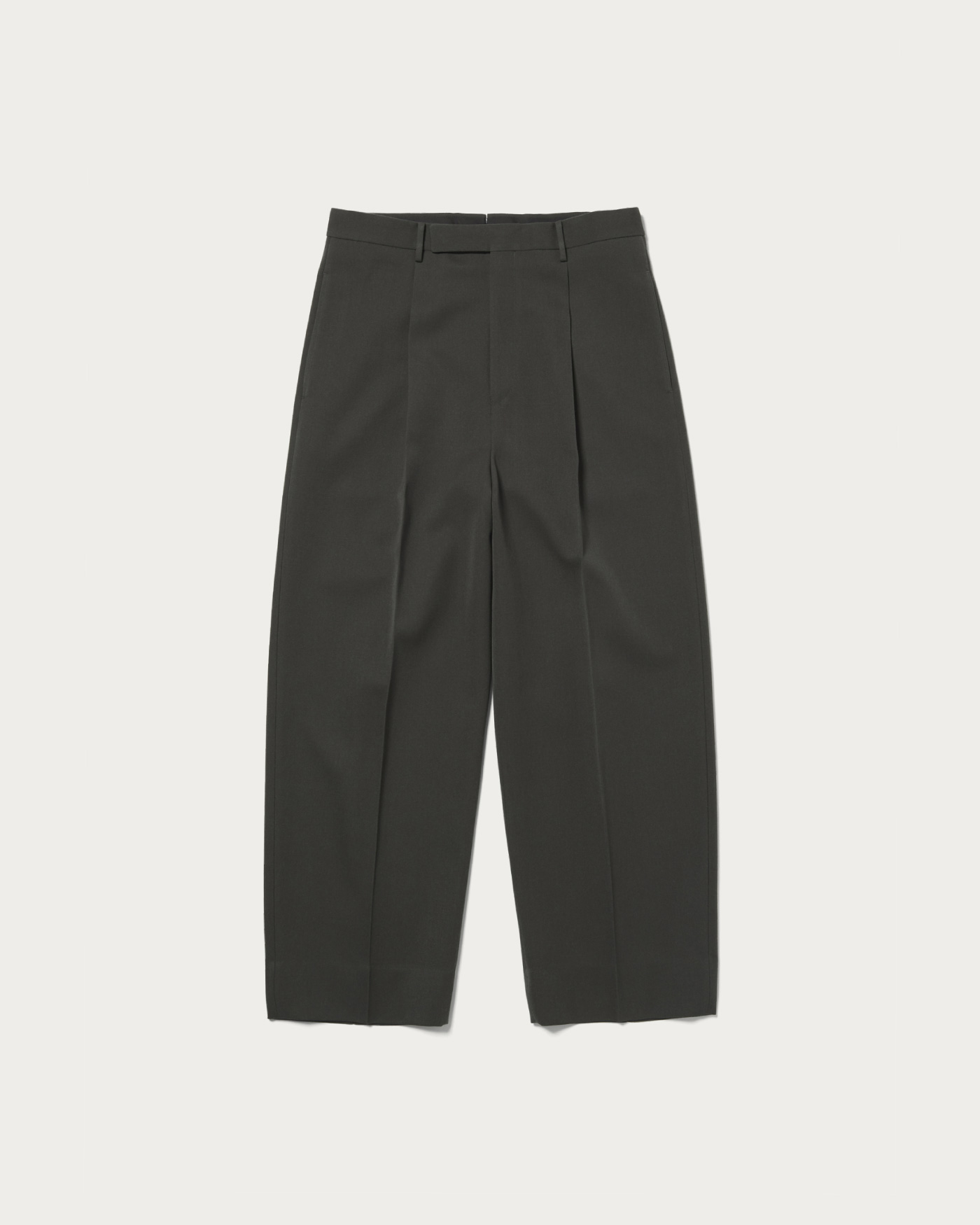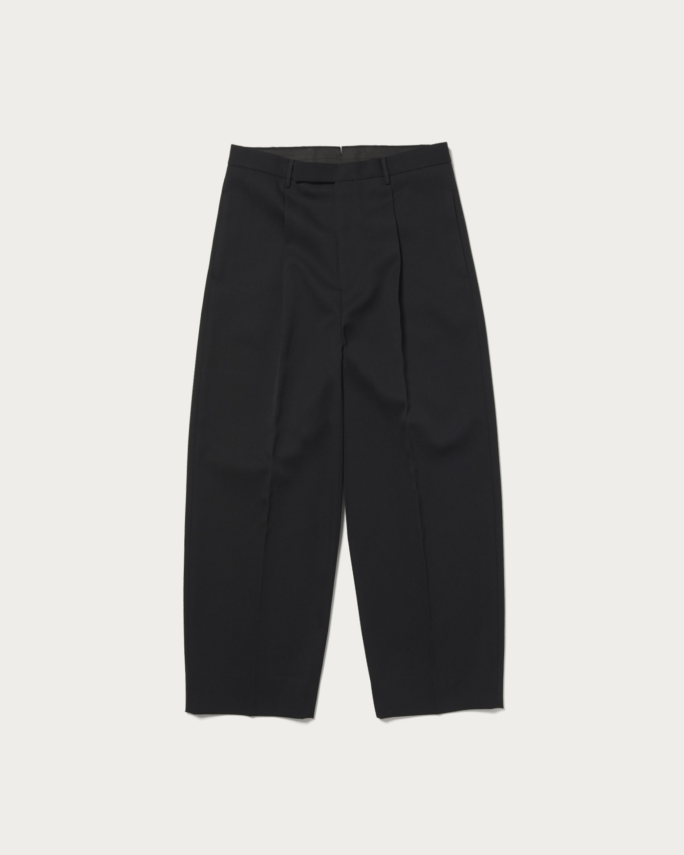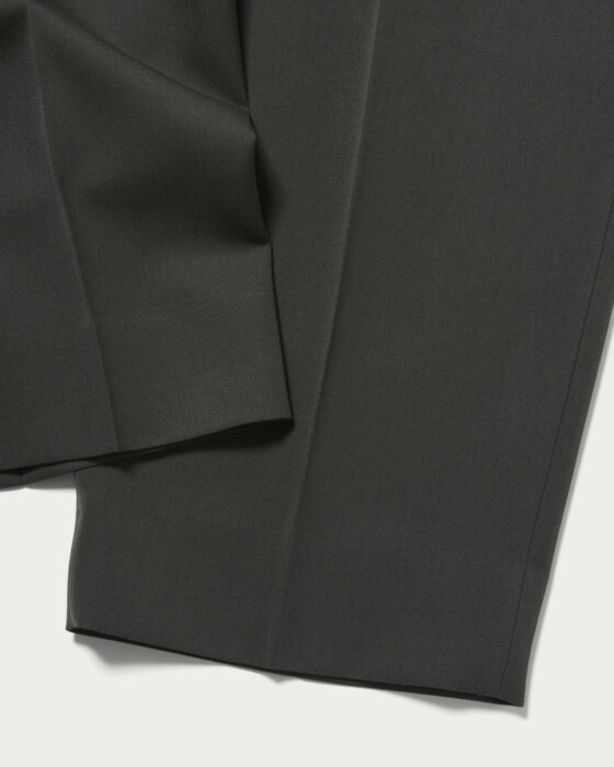Trousers made from densely woven worsted fabric. Specially ordered balash fabric with added thickness from the Bishu district in Aichi Prefecture, a renowned wool textile region. Featuring a wide silhouette that remains broad down to the hem, with an inward curve line for a slightly rounded shape. Designed with a high waist, these trousers are a standout piece for any outfit.
