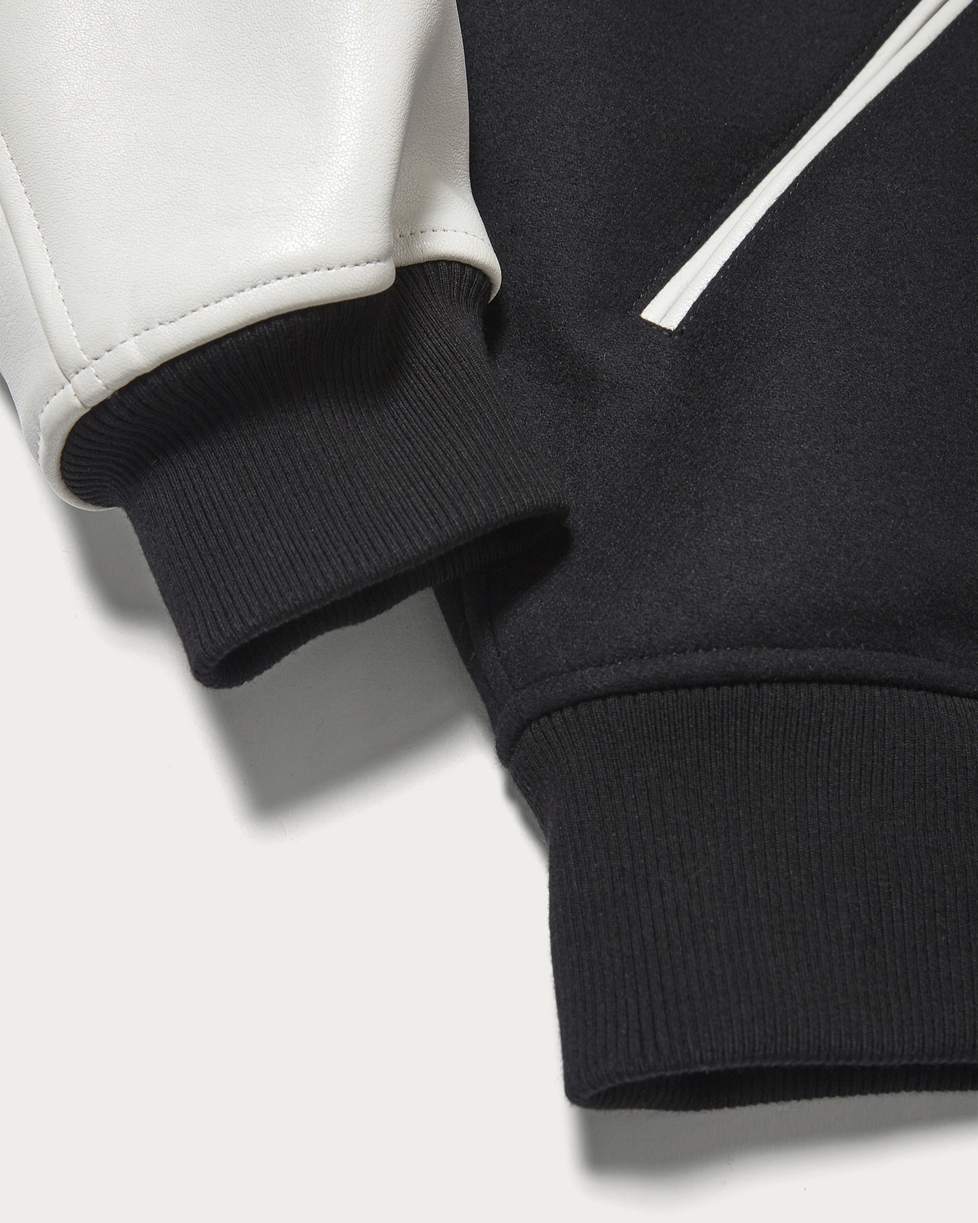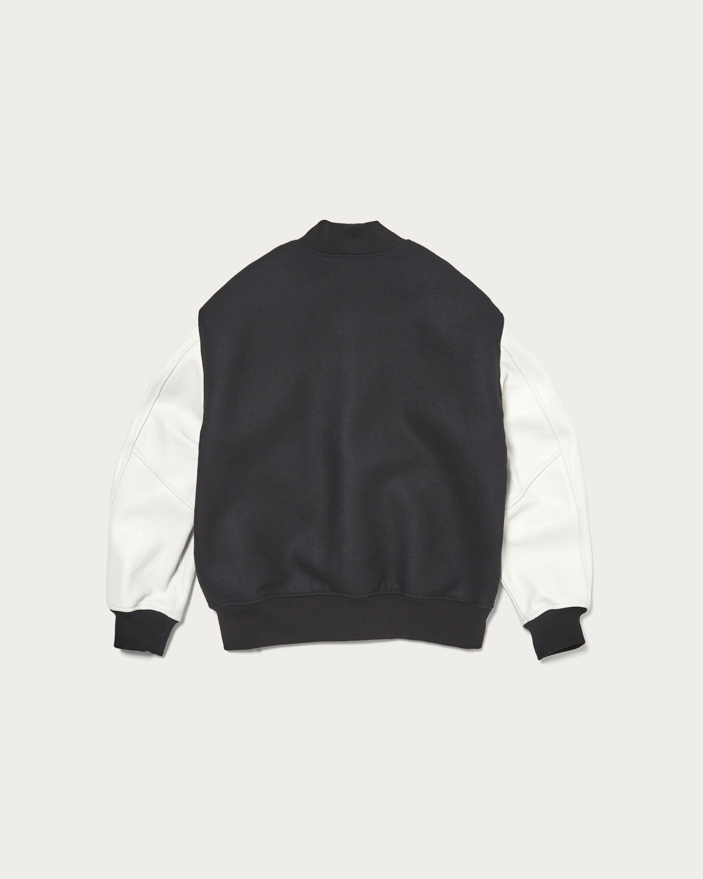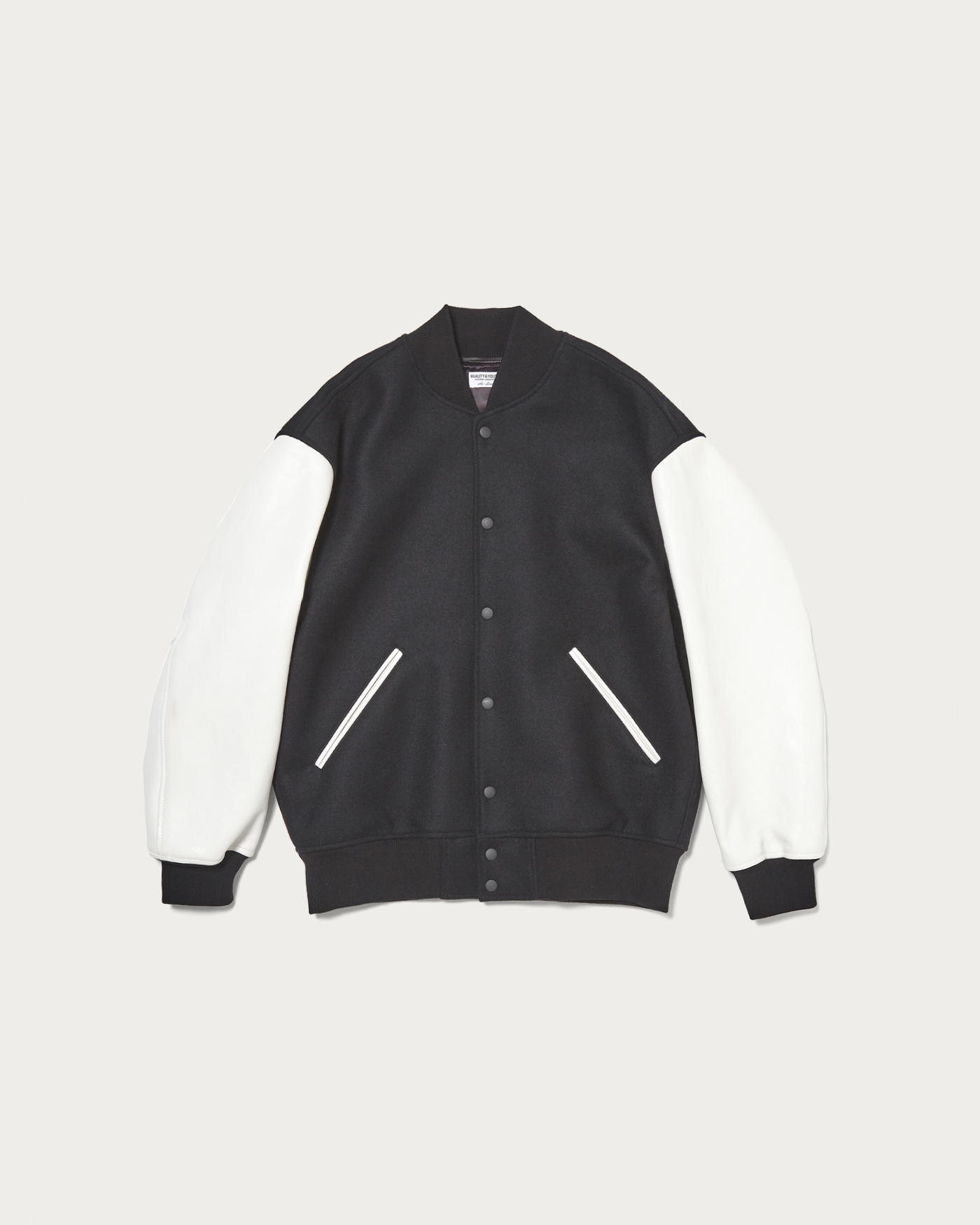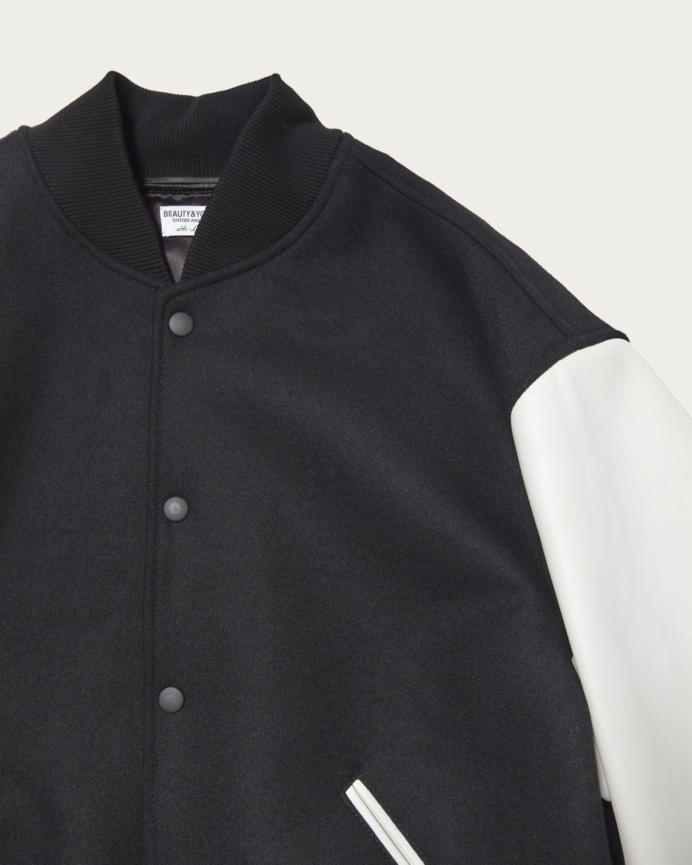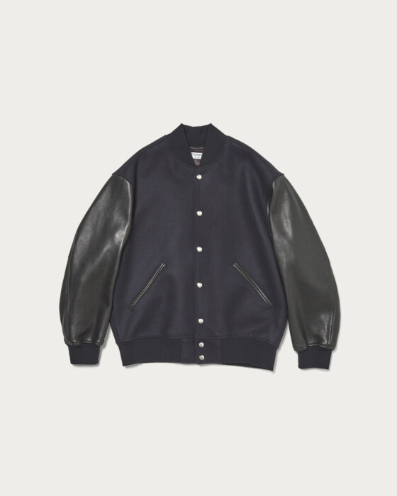 The contrast between the Super 130s double-woven melton body and the finely textured sheep leather arms creates a quiet and dignified presence. The supple materials are utilized to craft a rounded, elegant silhouette.