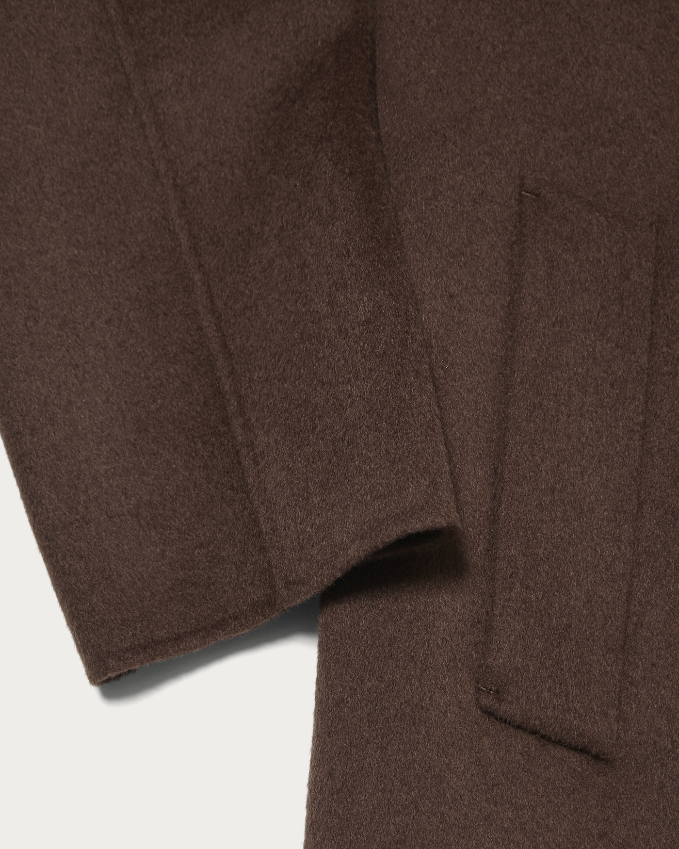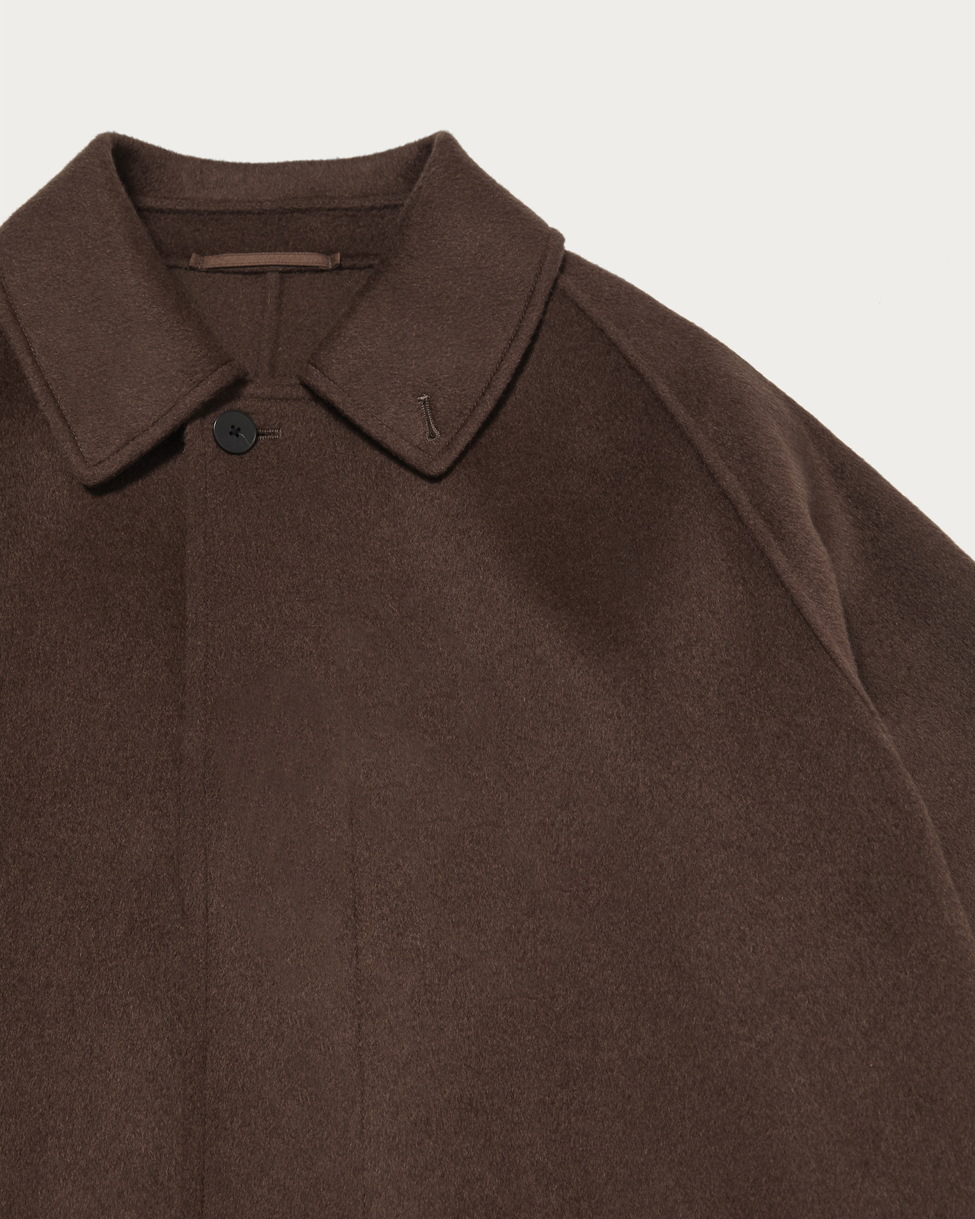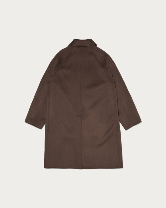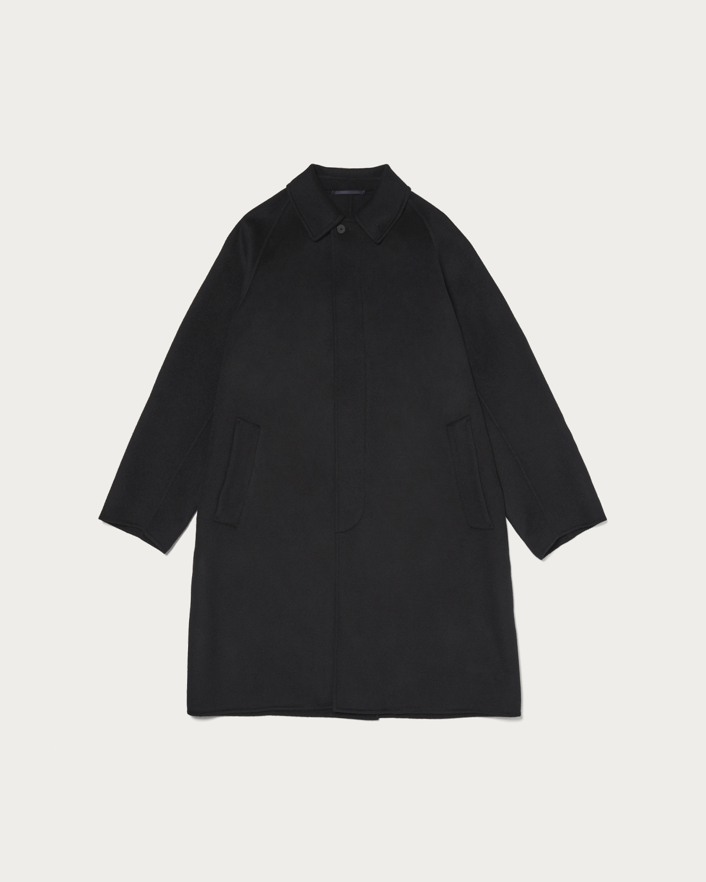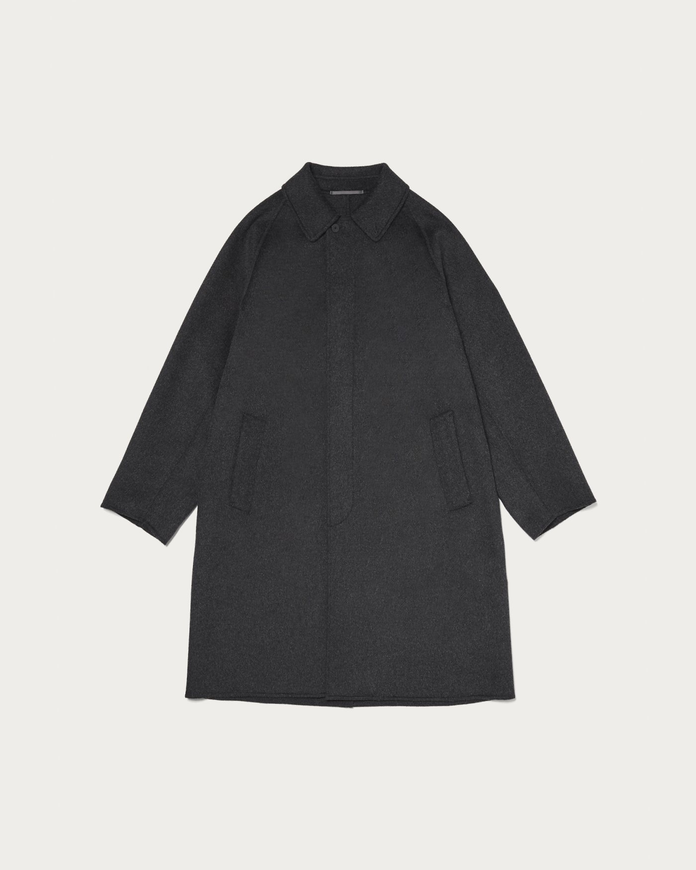 A reversible coat that reduces the characteristic heaviness of wool by blending the fabric with polyester. This wool coat, made using the reversible method, offers a relaxed fit that can be easily thrown on. Its slightly loose silhouette makes it easy to layer. The surface, with its well-groomed texture, features an elegant sheen.