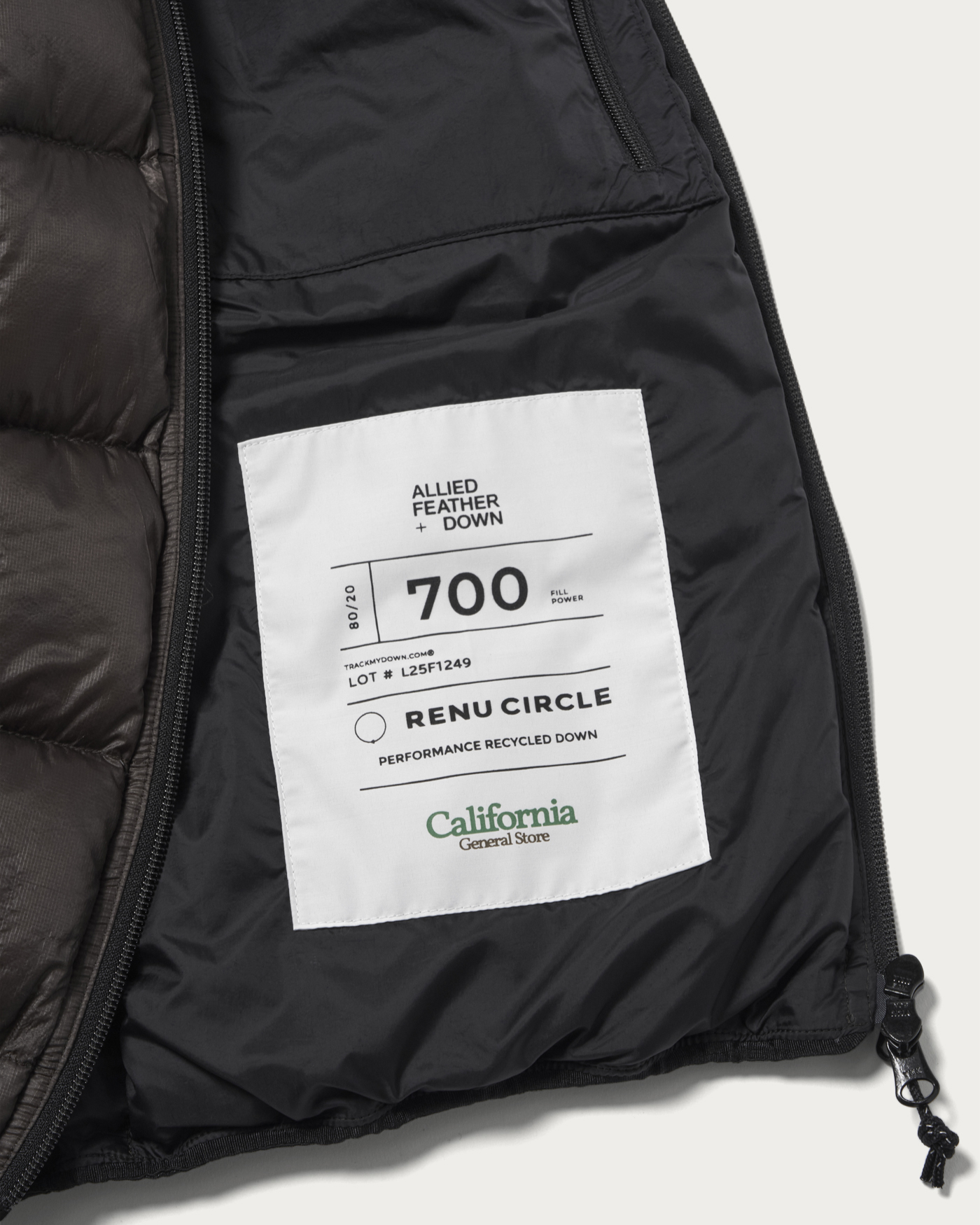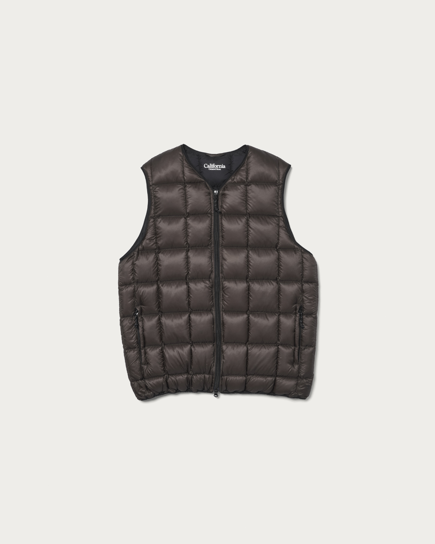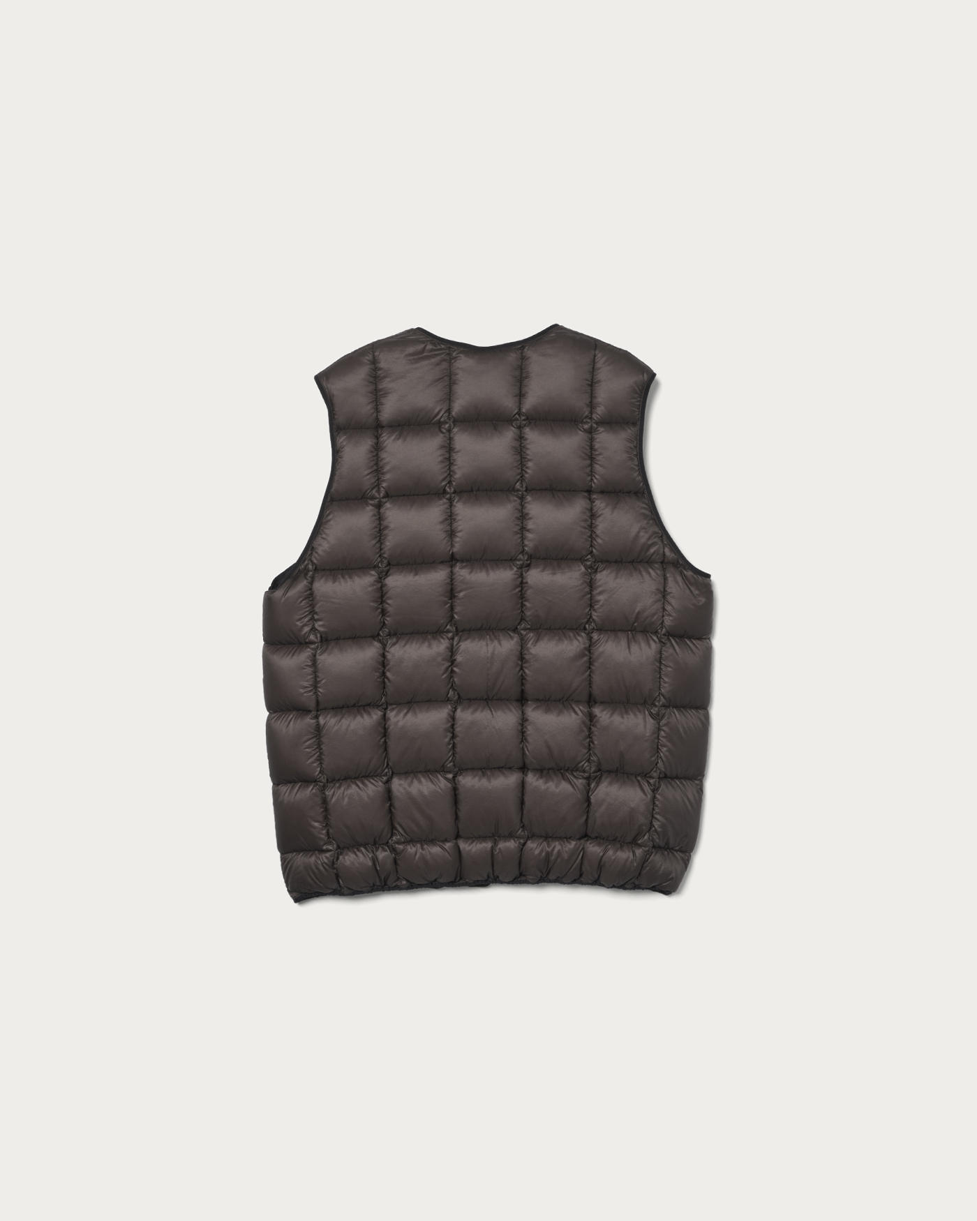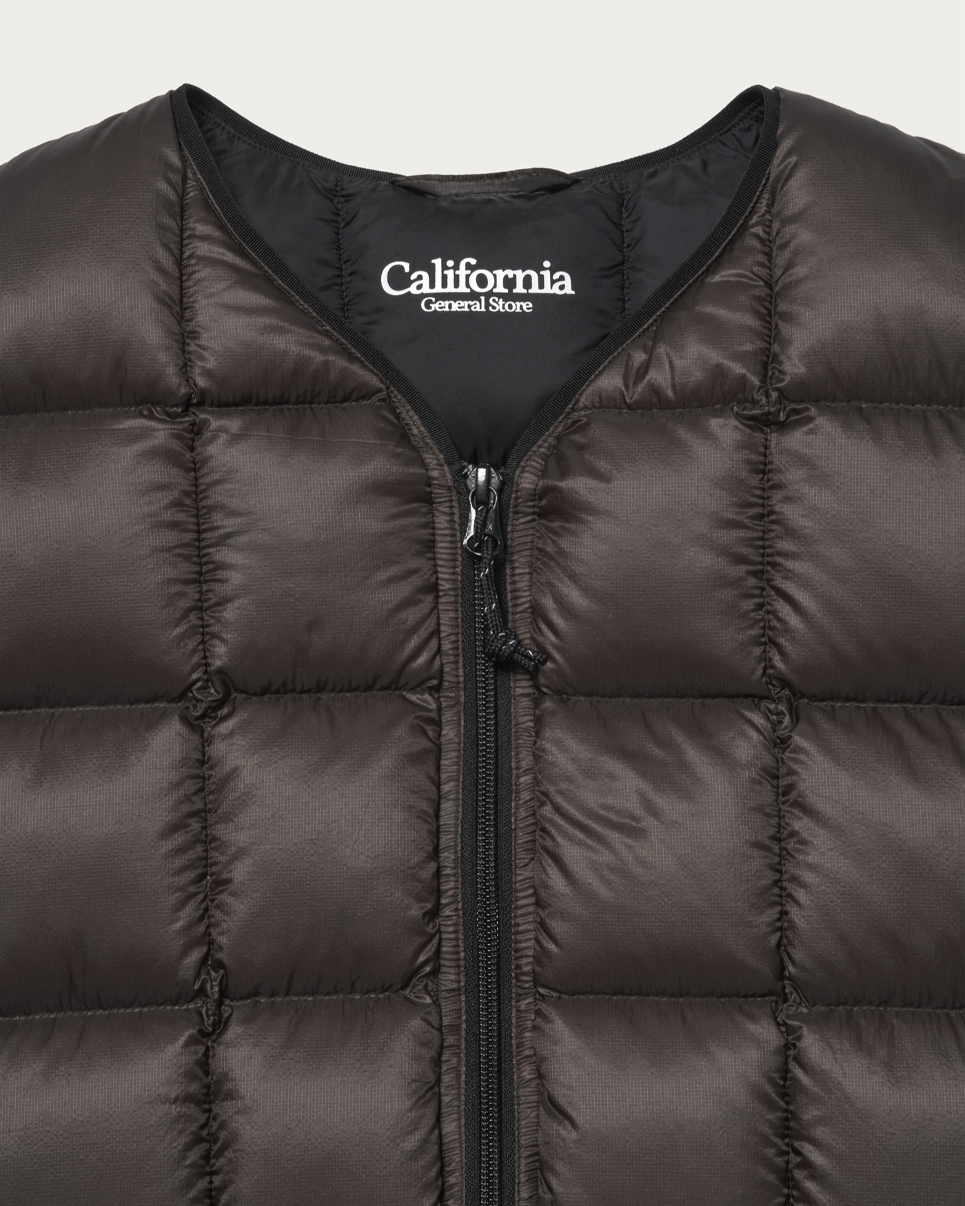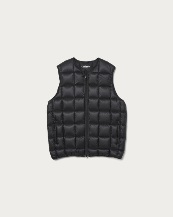 A high-density woven recycled nylon ripstop made from ultra-fine 10 denier threads. It features the supple and soft texture characteristic of nylon. The filling uses recycled down from Allied. This down vest can be worn on its own or as a middle layer. It is designed with sizing that makes layering easy, allowing for coordination without the need to choose specific inner items. This is a unisex item that can be worn by anyone.