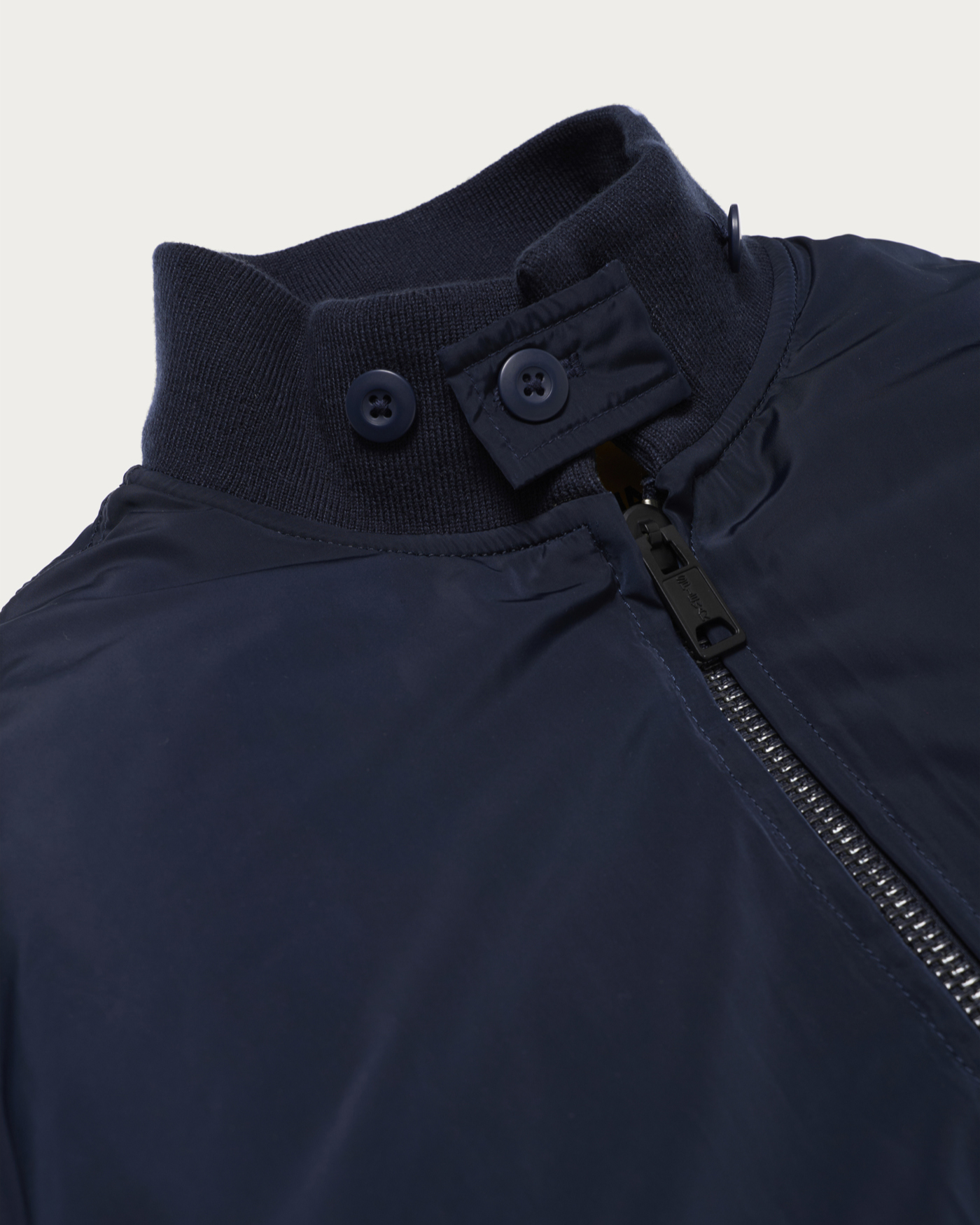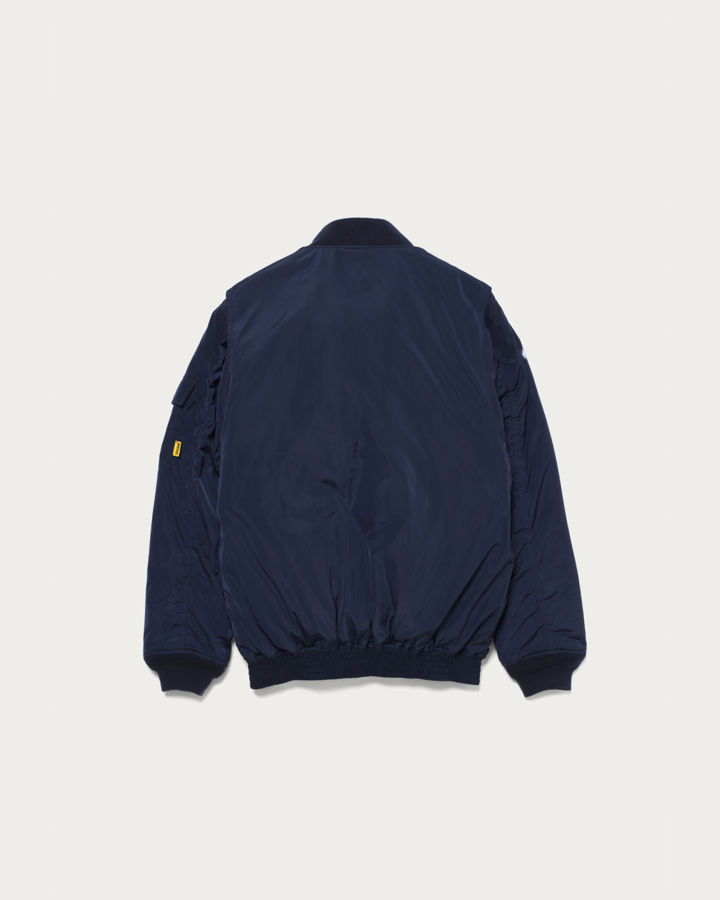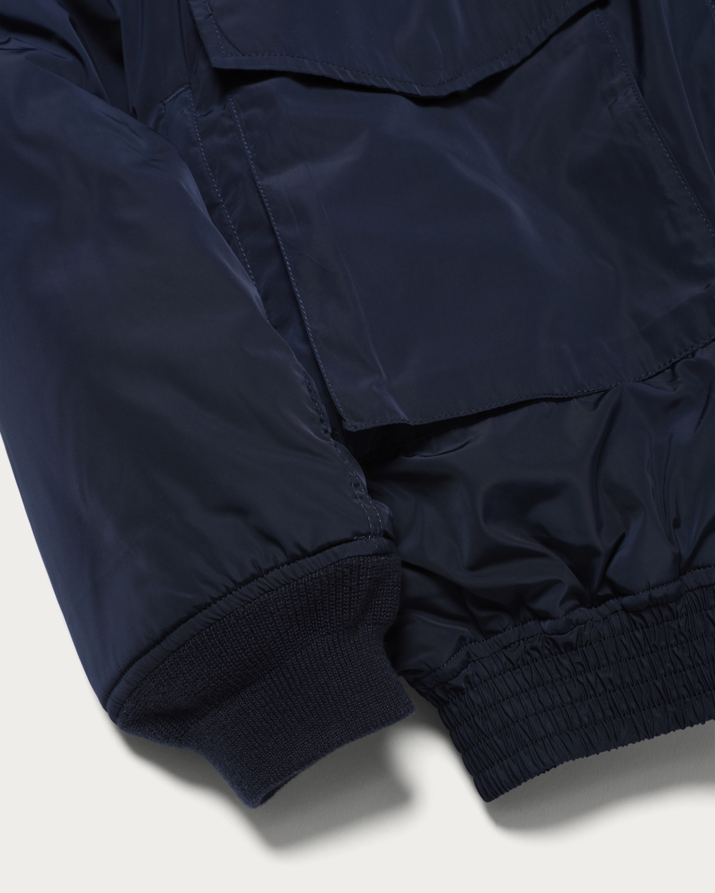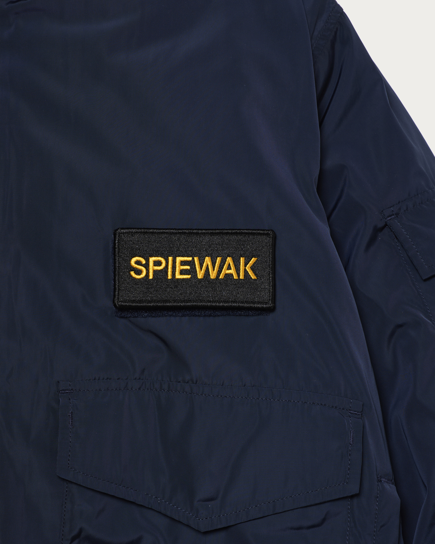 The CGS special edition model of the WEP jacket, commonly known as the G-8, was used by the U.S. Navy from the mid-1950s to the mid-1970s. It retains functional and iconic details such as the stand-up collar, chest pockets with gussets, a cigarette pocket on the left arm, and action pleats on the back. The material has been changed to a matte-textured nylon oxford fabric. This material is characterized by being thin and lightweight while maintaining warmth. Despite its rugged appearance, the all-navy color gives it an urban finish.