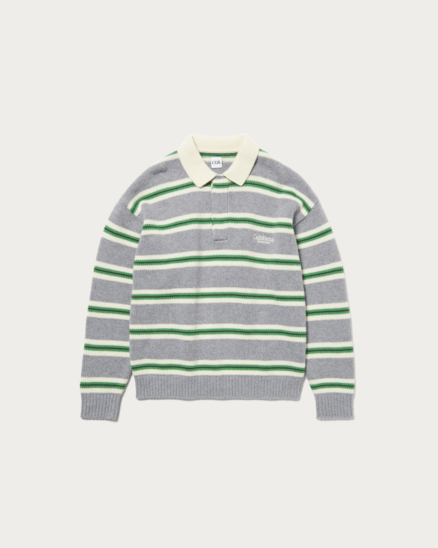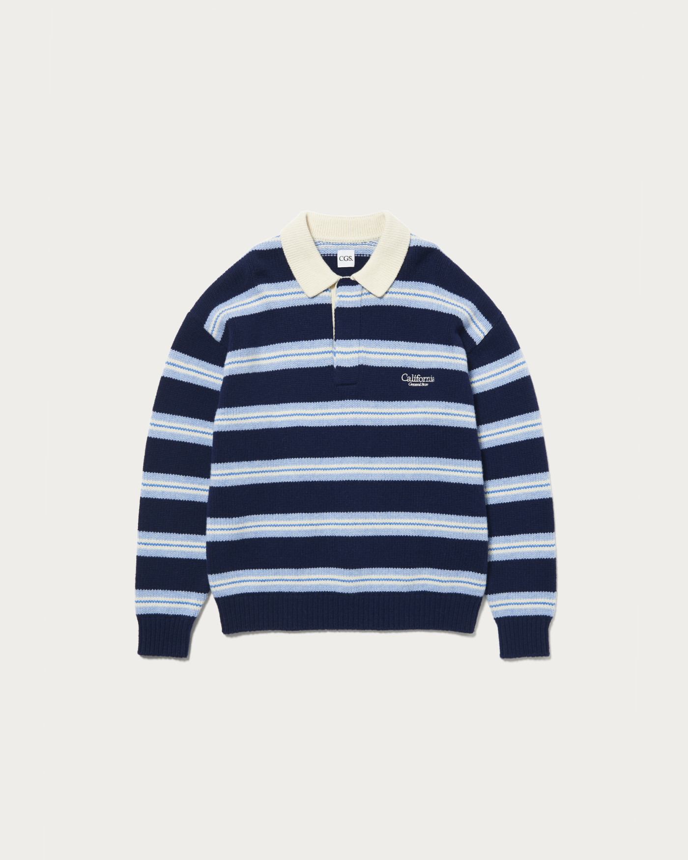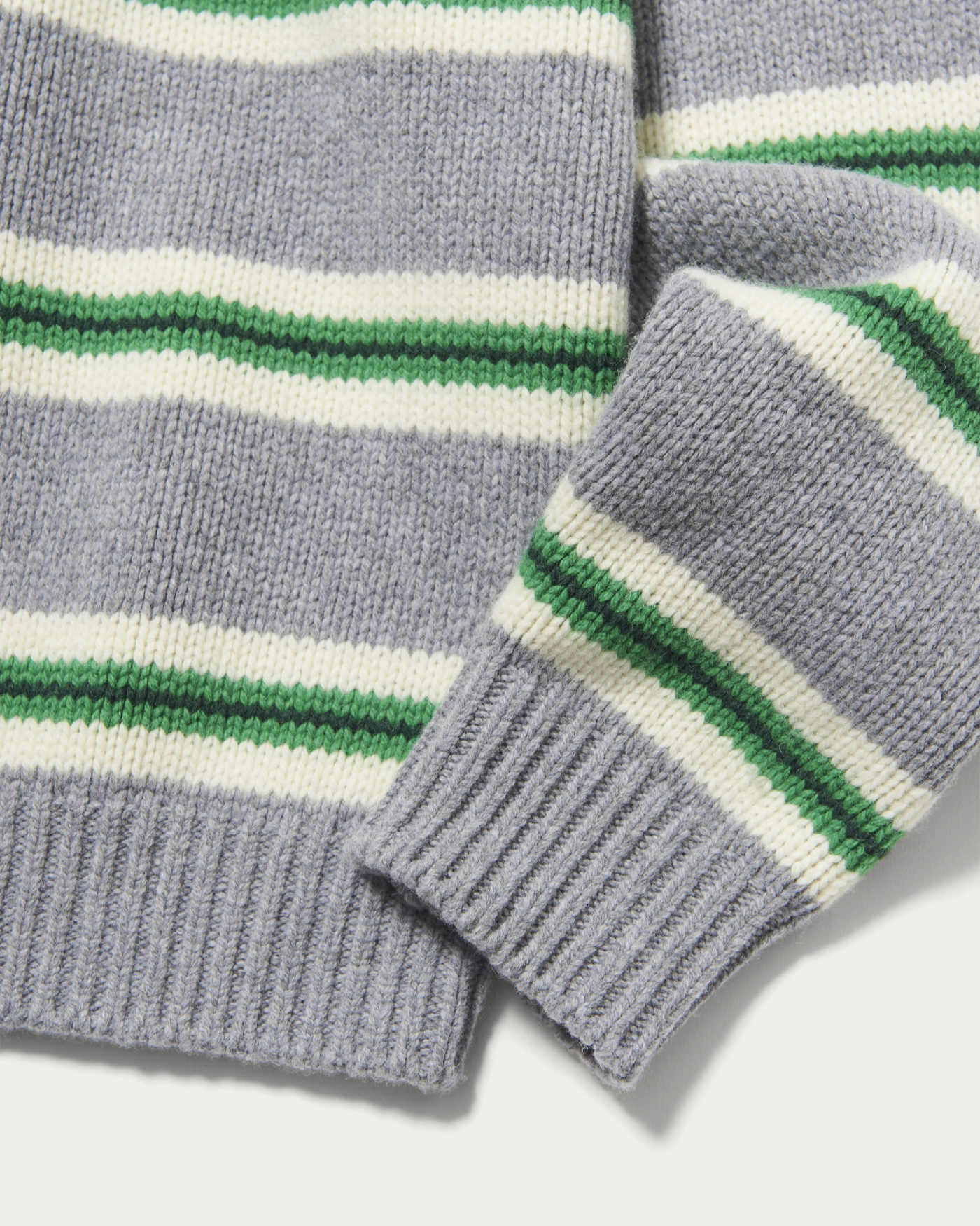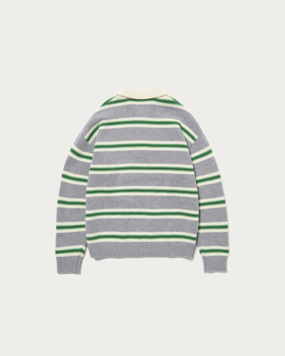 The yarn used is made from wool and recycled nylon. This material offers the unique softness and warmth characteristic of wool. It is expressed with the elegant, voluminous texture typical of knitwear. Featuring a ribbed cuff and hem, it has a rounded silhouette that combines a sense of fashion with a relaxed feel, and its distinctive border pattern makes it a standout piece. The embroidered shop logo on the left chest adds a subtle accent.