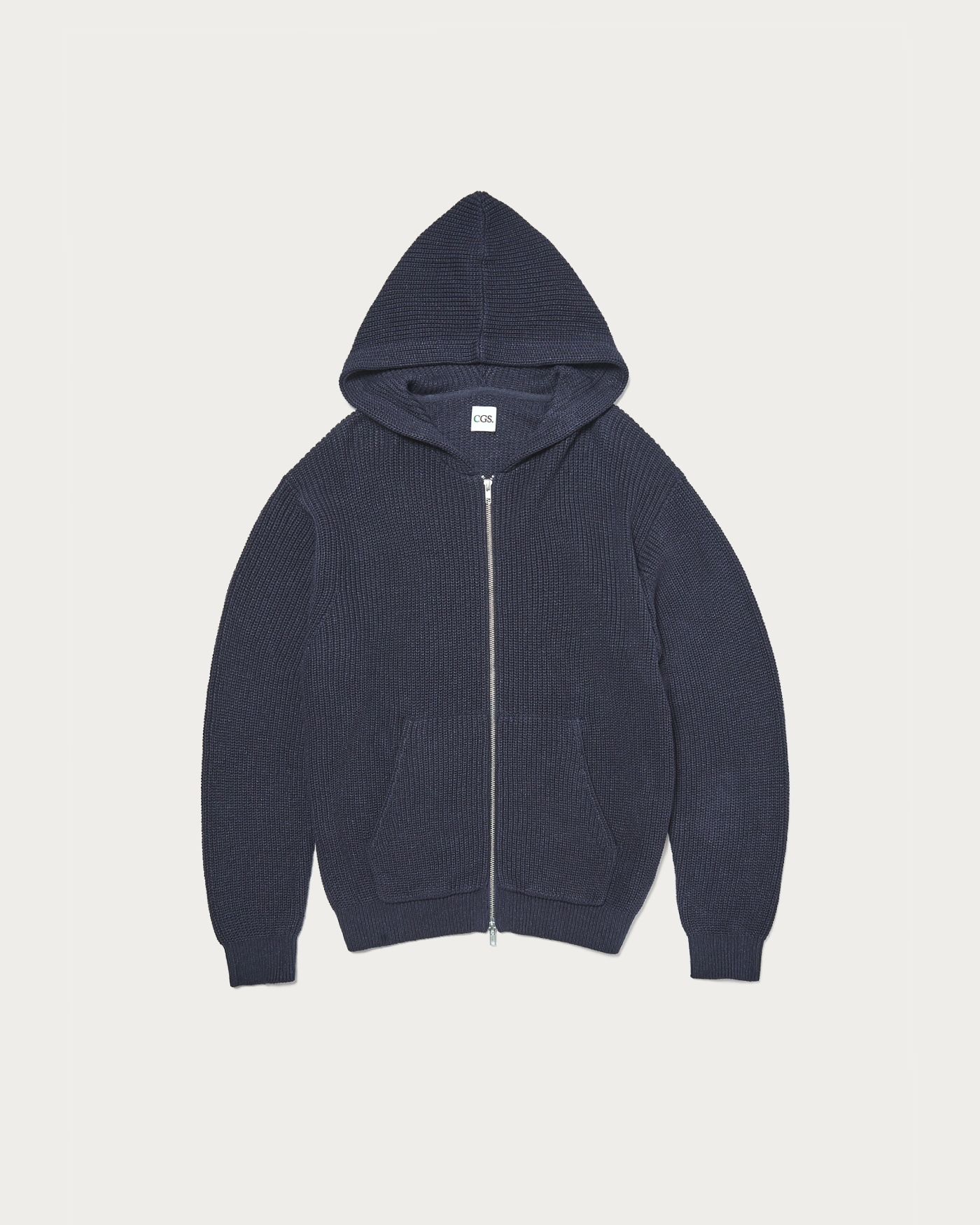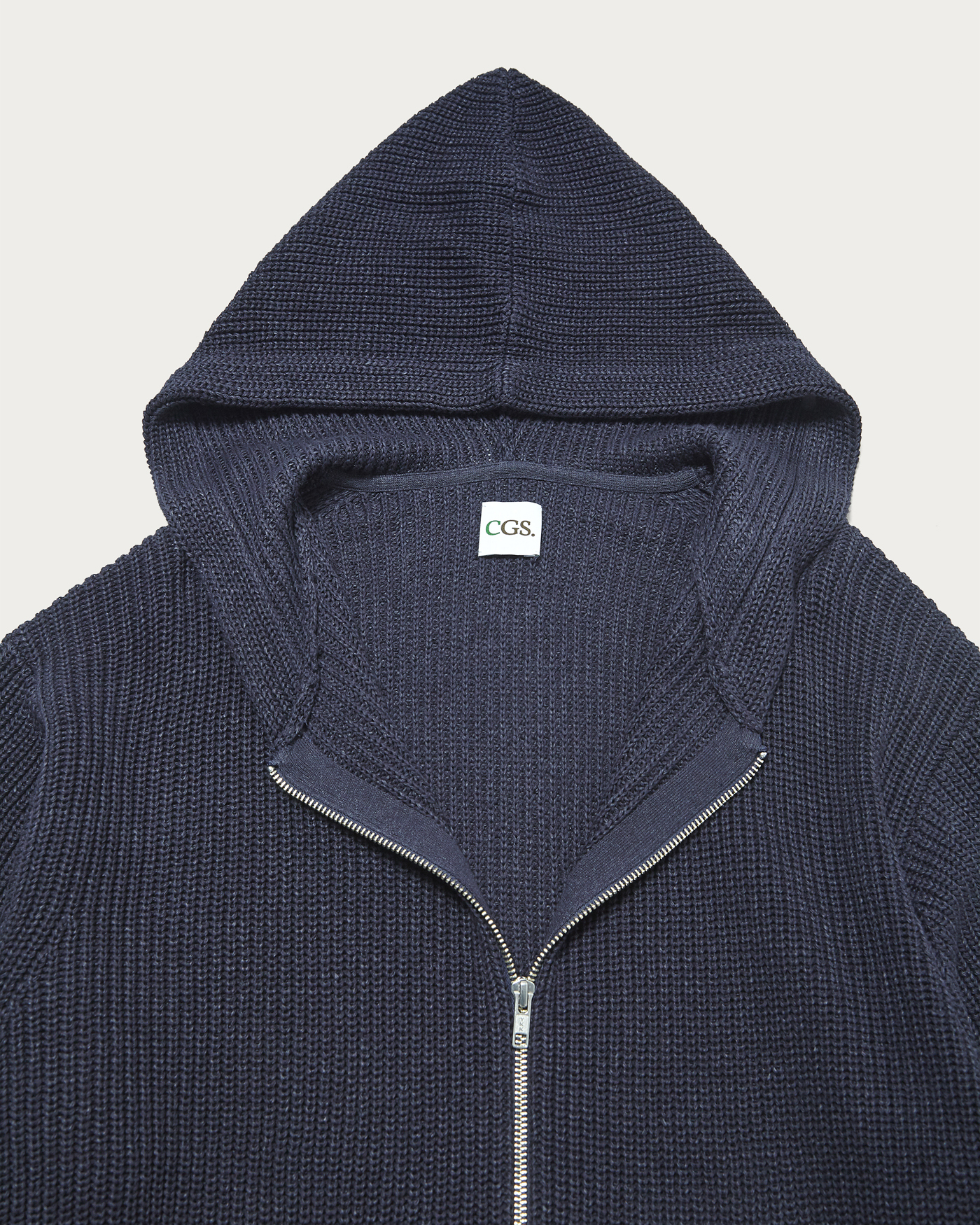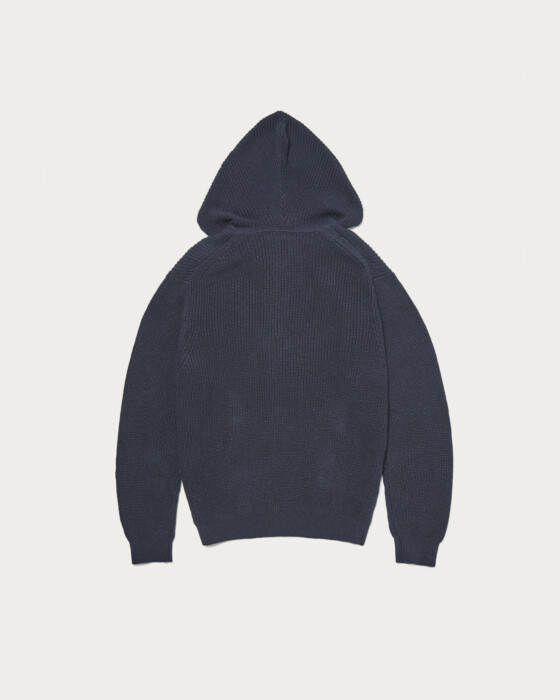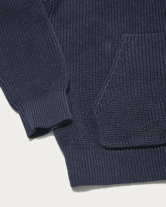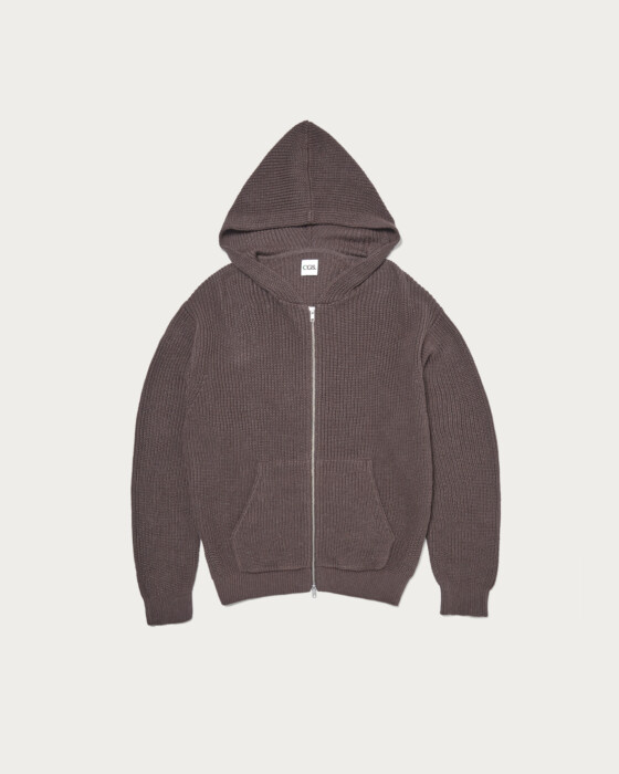A knit material blended with organic cotton and non-classified fibers (paper). The dry texture and unexpected lightness are unique to paper yarn. This is a low-gauge, half-cardigan stitch knit zip hoodie. It features a rounded silhouette with ribbed cuffs and hem, and its slightly shorter length allows it to be worn like a blouson.