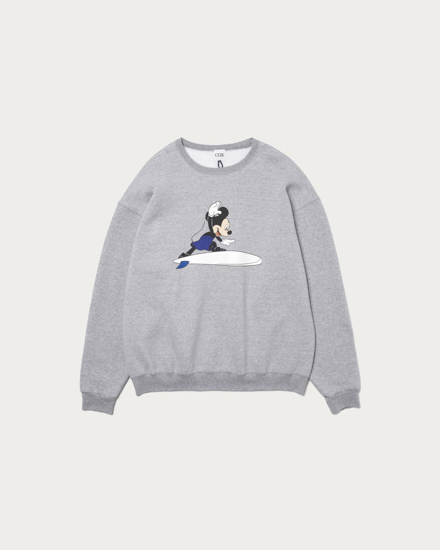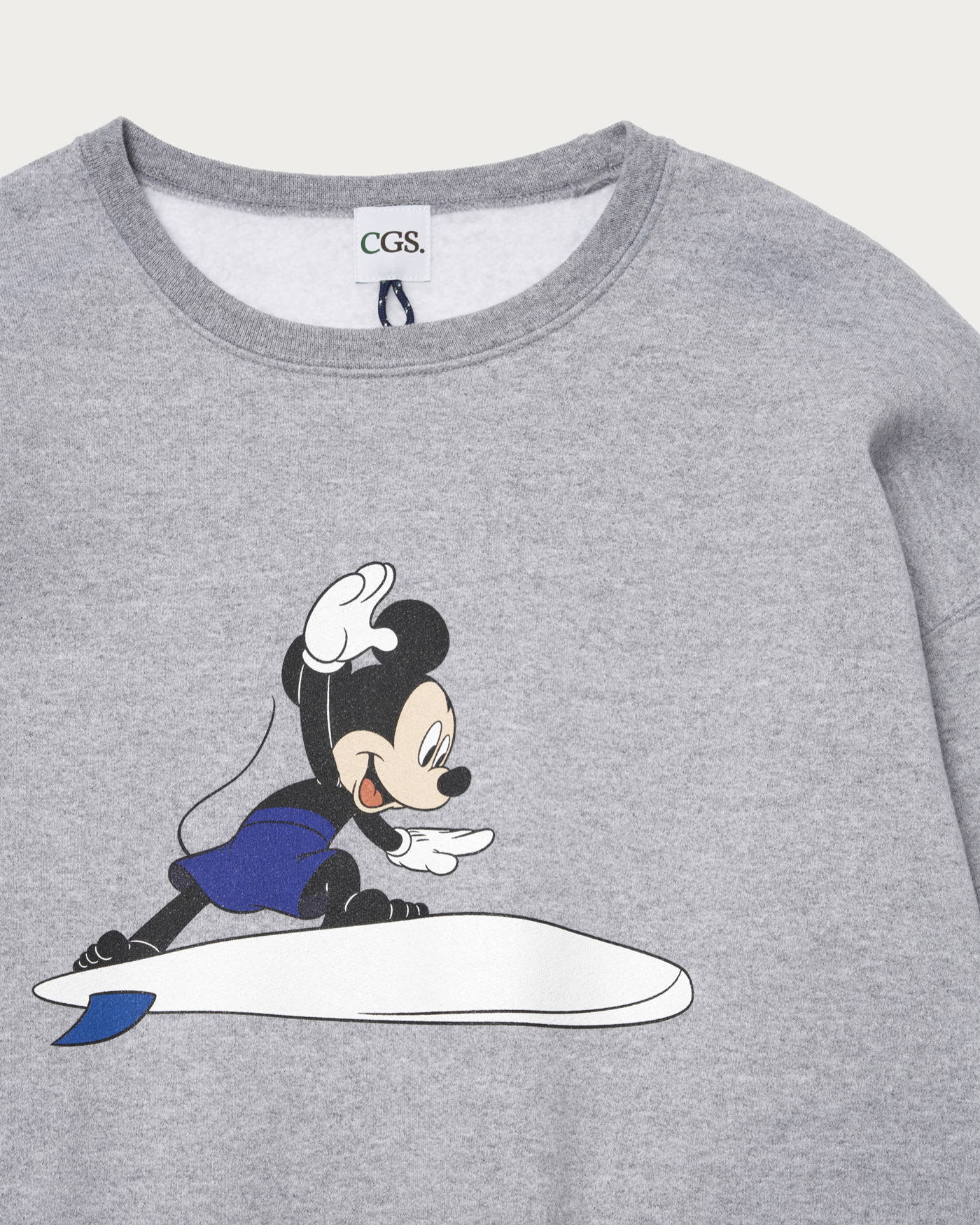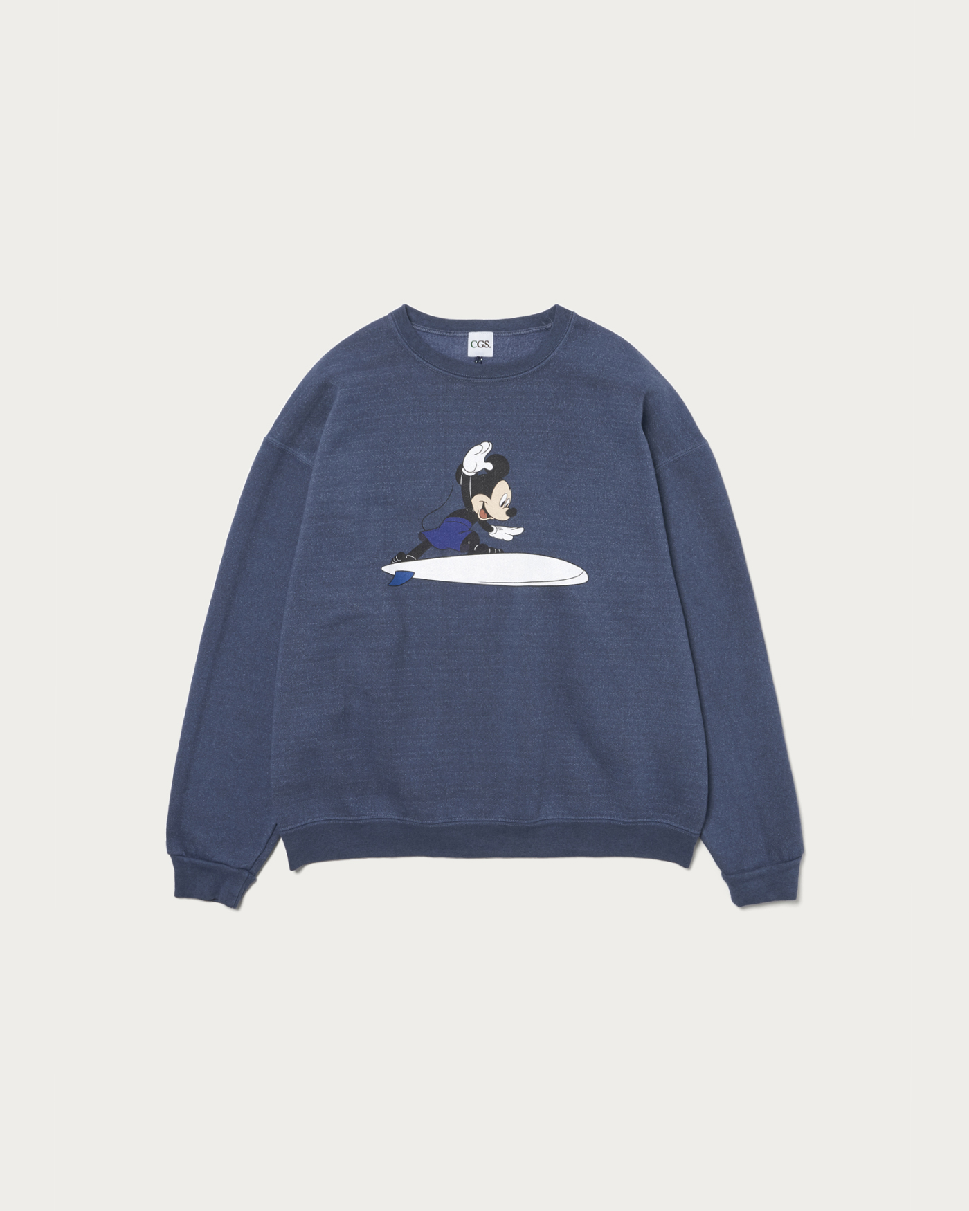 This is a CGS exclusive sweatshirt featuring a retro "comic style" Mickey Mouse surfing. The body uses a 12-ounce fleece-lined crew neck sweatshirt. The garment is pigment-dyed, maintaining a heathered look while being colored. *Please note that due to the garment dyeing process, there may be individual differences.