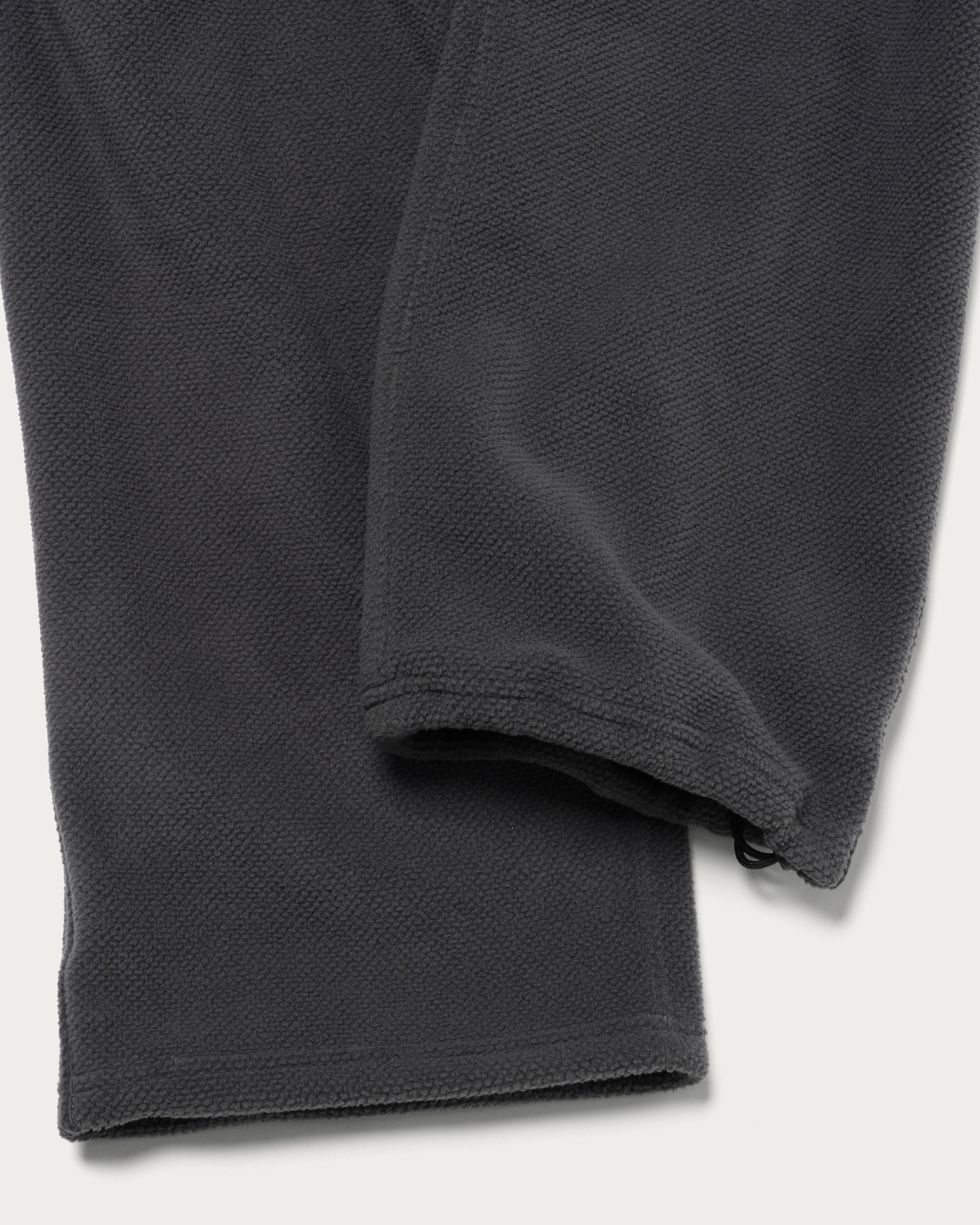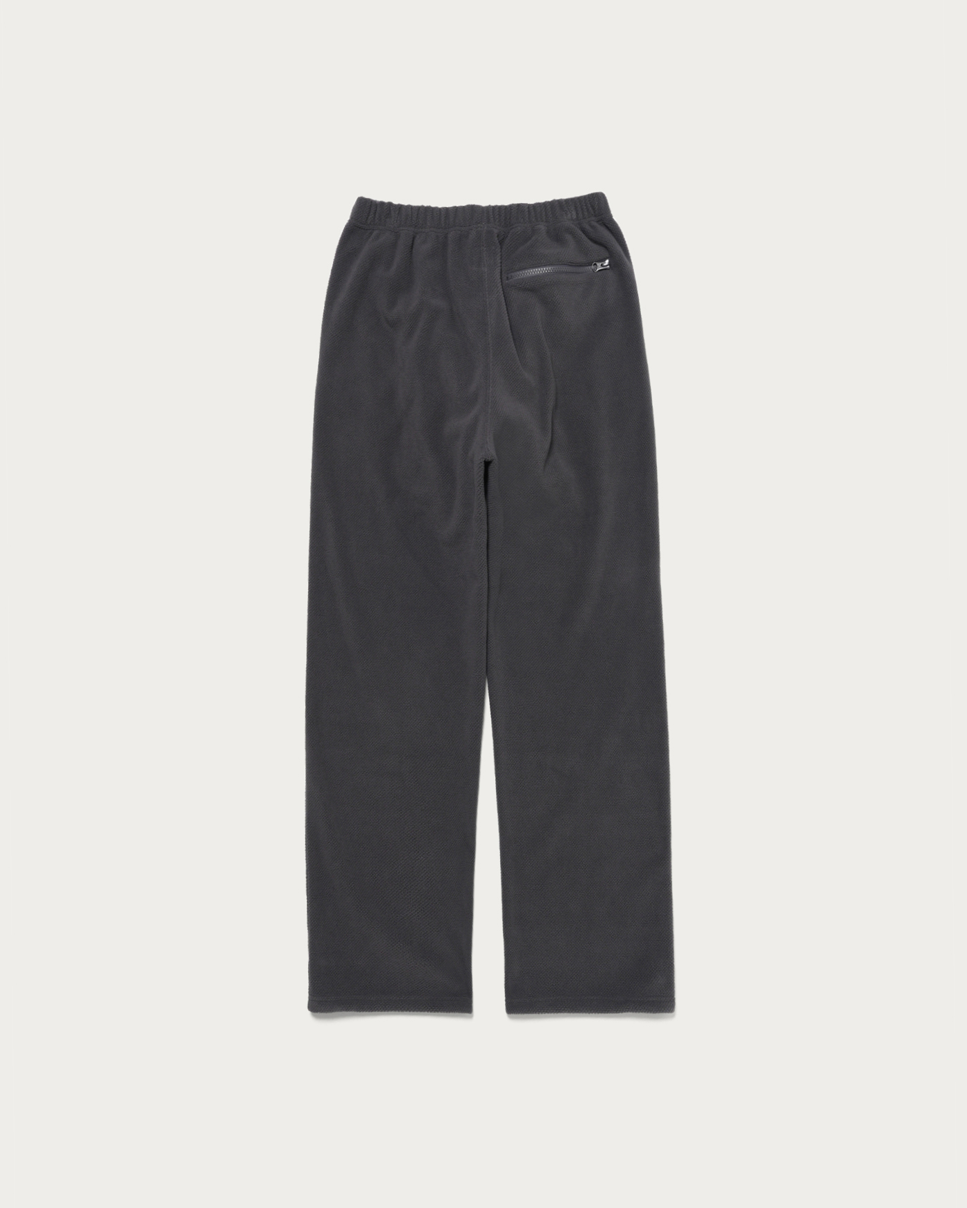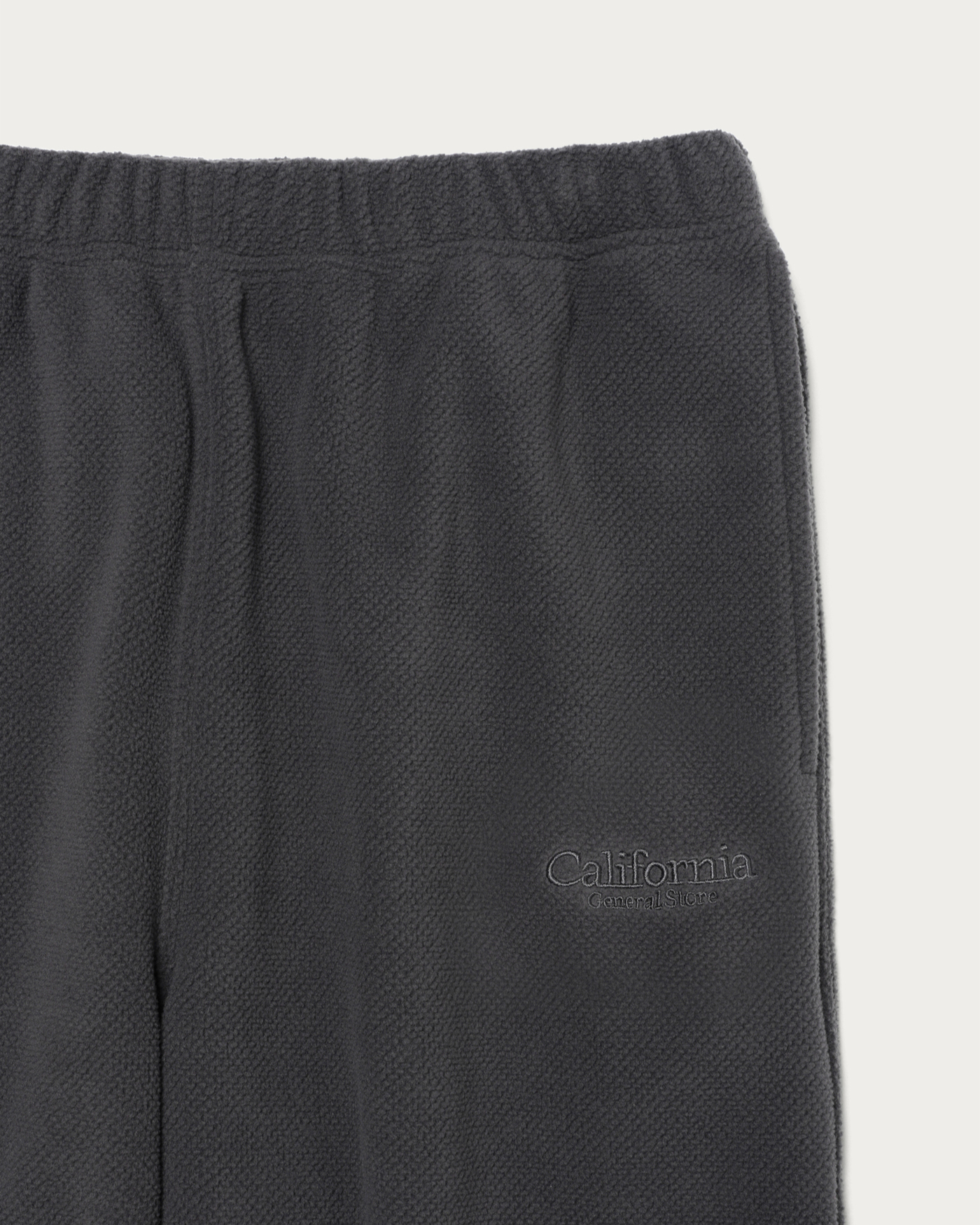 These easy pants are made from fleece material with a textured appearance using recycled polyester. They are designed with a wide silhouette that is subtly tapered, based on track pants. The hem features a drawstring, allowing you to adjust the silhouette. The embroidered shop logo on the left pocket adds a unique touch, making this a unisex item suitable for anyone.