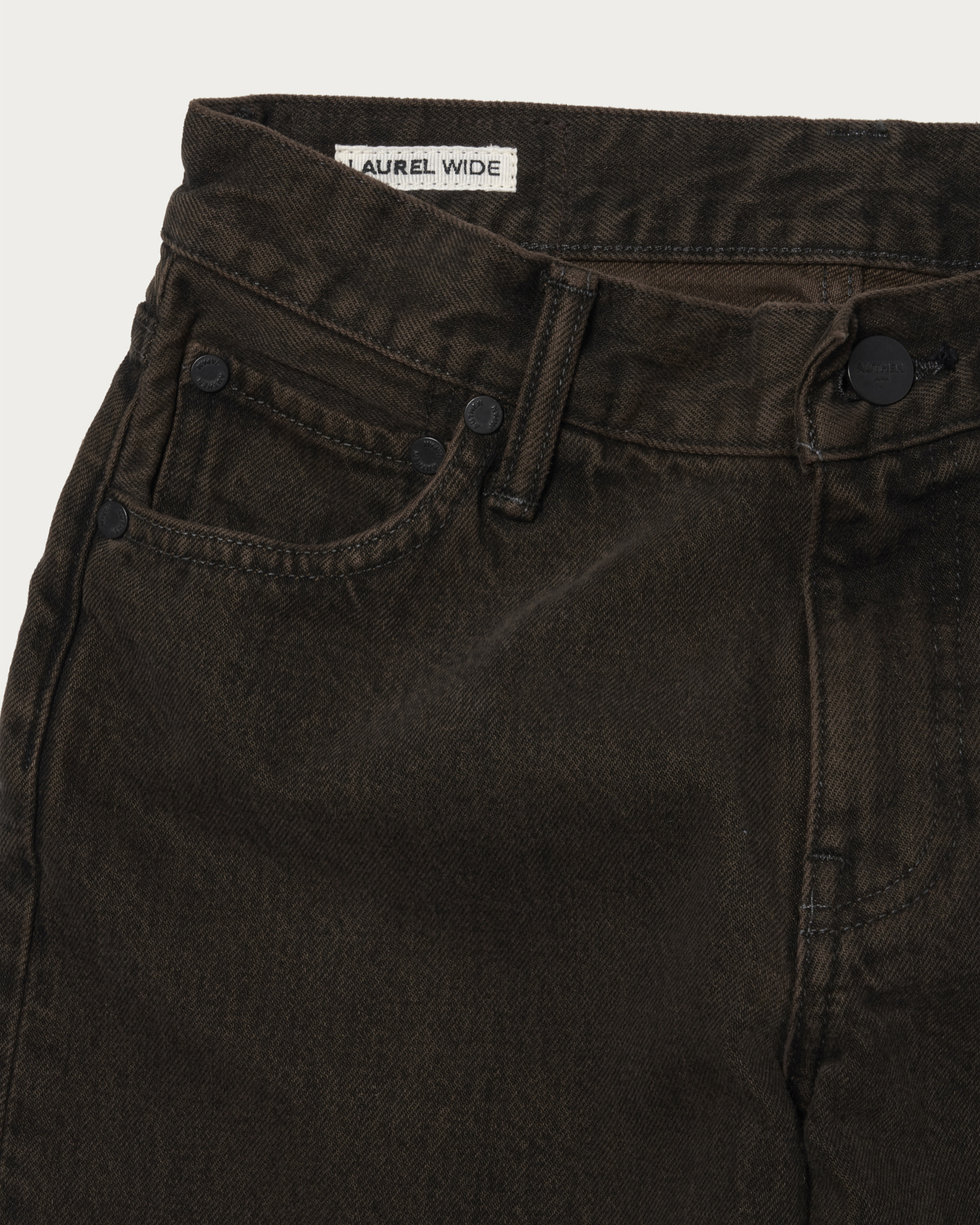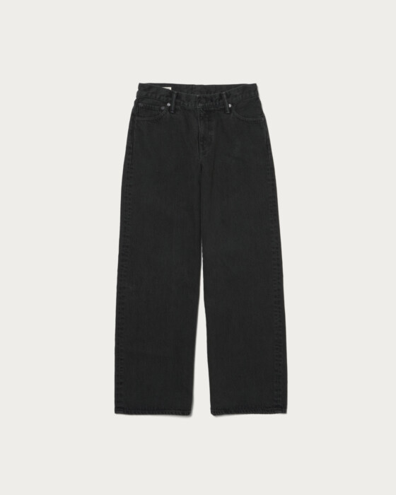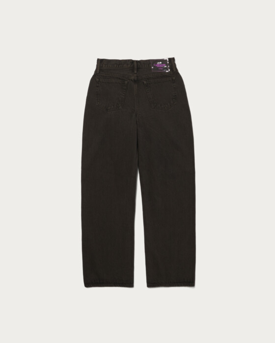 LAUREL is AUTHEN JAPAN's classic low-rise wide fit. Designed to be compact from the waist to the hips, it offers a refined silhouette without being too loose, despite its wide fit. The low-rise design also has the effect of making the hips appear smaller. The material used is 13oz recycled black denim from Kurabo, available in two colors with garment dyeing. By retaining the worn-in feel of used black denim and applying brown and black garment dyeing, the product achieves a deep color that is not typically found in standard garment dyeing. This special pair is entirely made in Japan, with meticulous attention to fabric, sewing, and processing. The signature patch is a unique CGS exclusive, featuring a transparent vinyl material with a pink print.