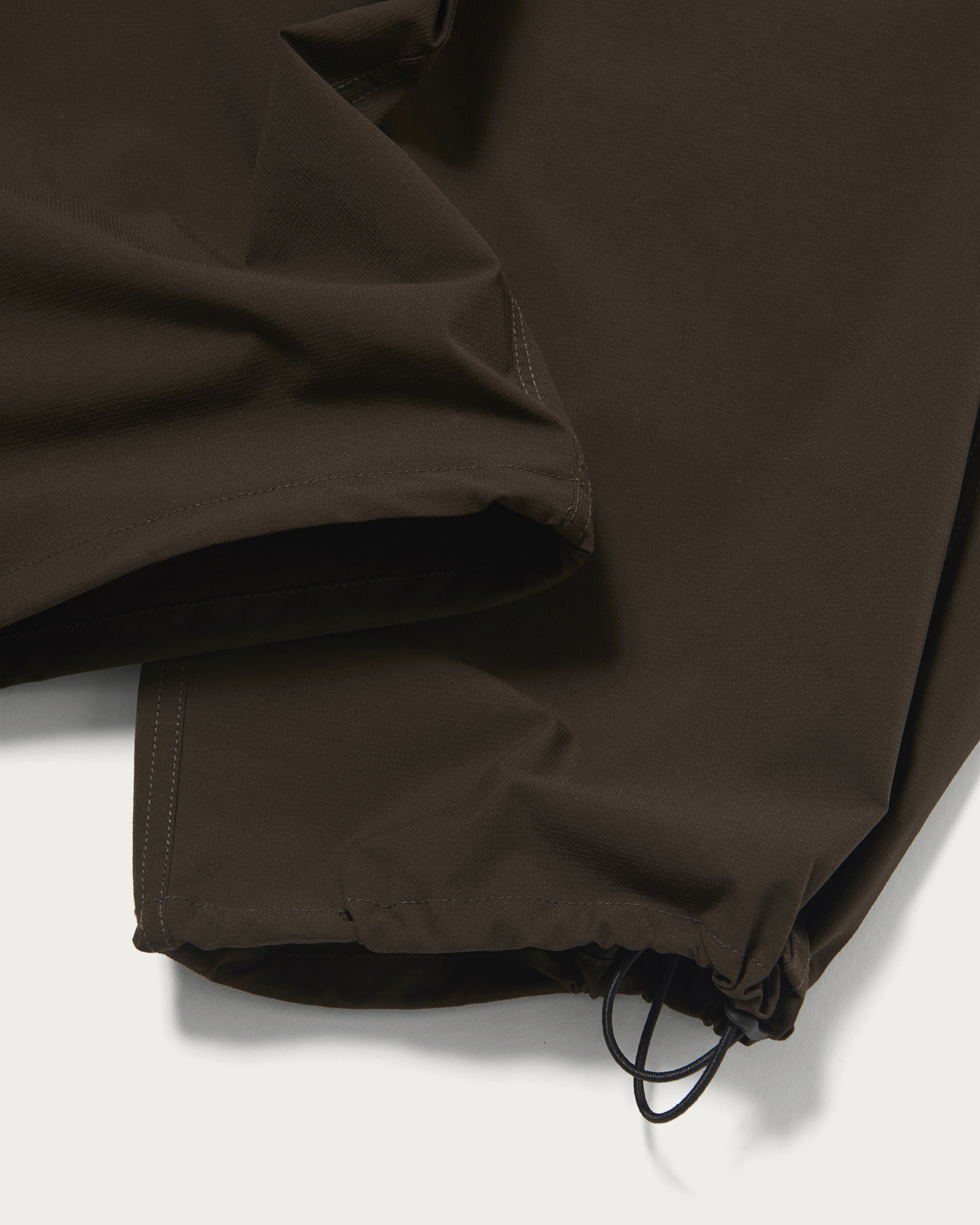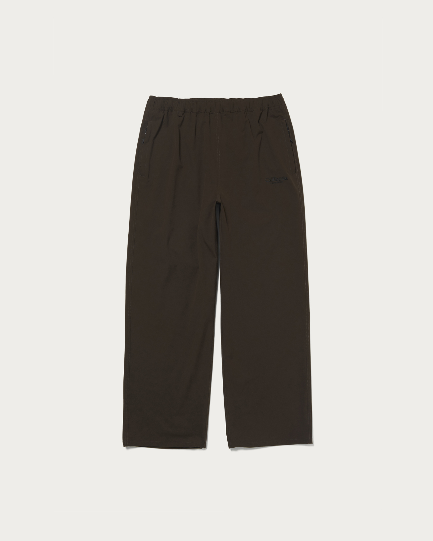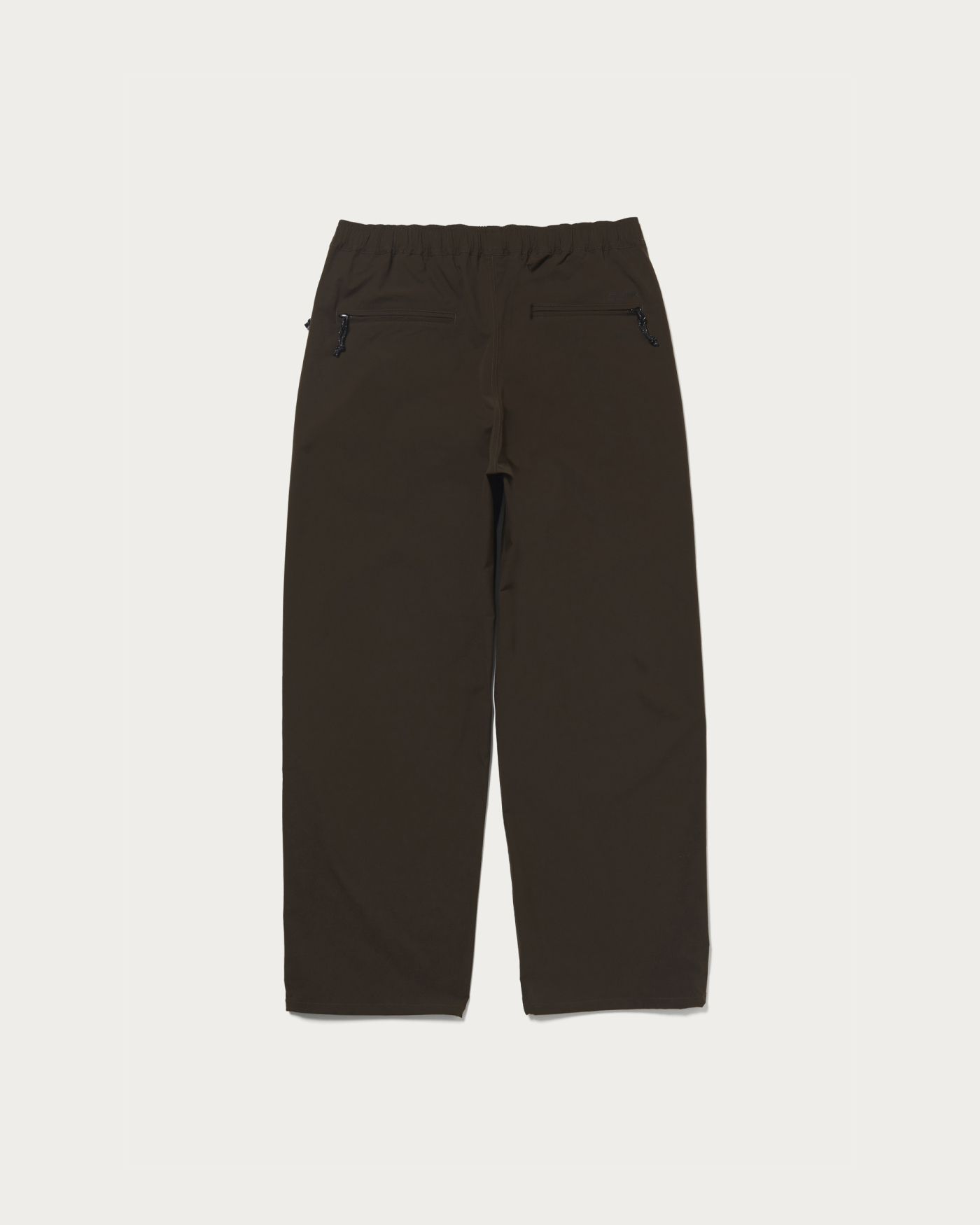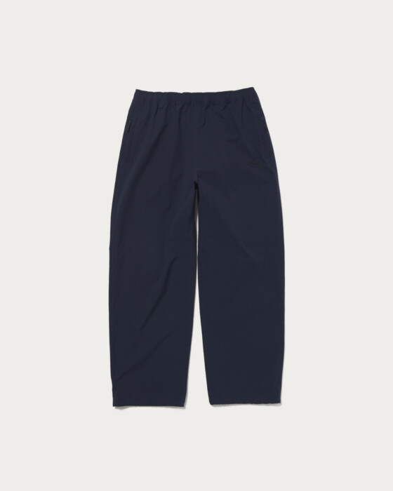 These are wide straight track pants made from "PERTEX UNLIMITED" ripstop material, which includes some recycled polyester. They are perfect for active scenes. The elastic string at the hem allows you to change the silhouette and enjoy different styles. The embroidered shop logo on the left pocket adds a unique touch. This item is unisex and can be worn by anyone.