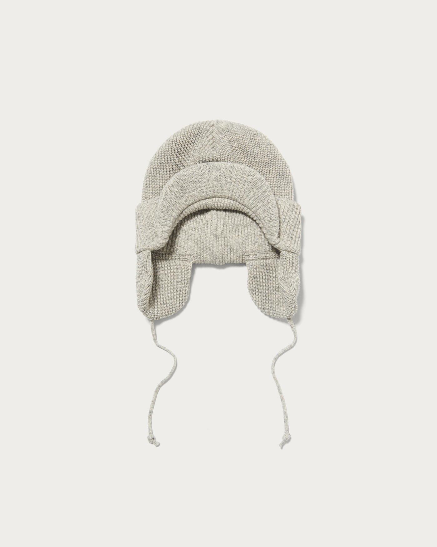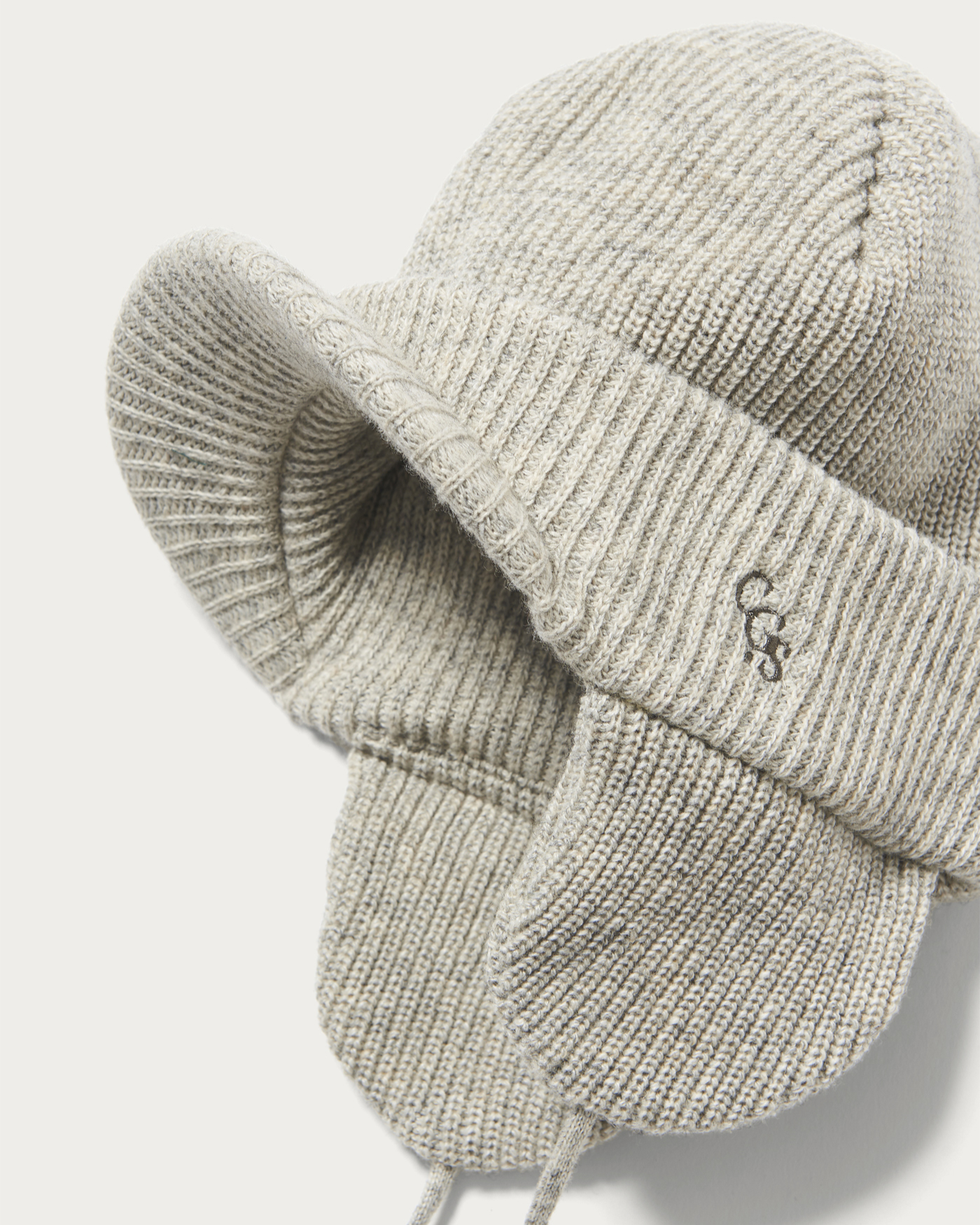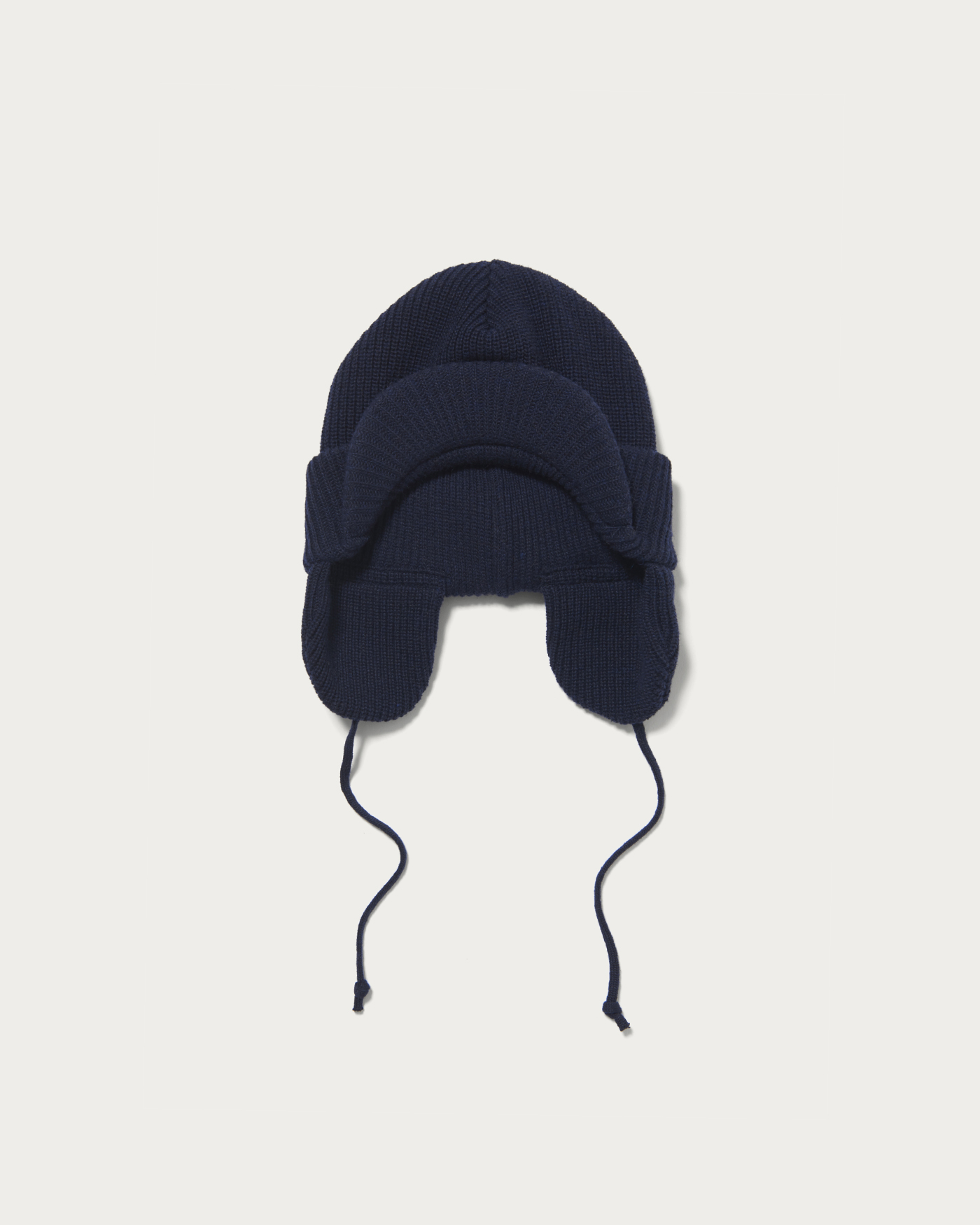 This is a beanie with a brim and ear flaps. It is made from warm wool-polyester yarn. The folded part on the left side features a logo embroidery as a key point. It's also recommended as an accent for your outfit coordination.