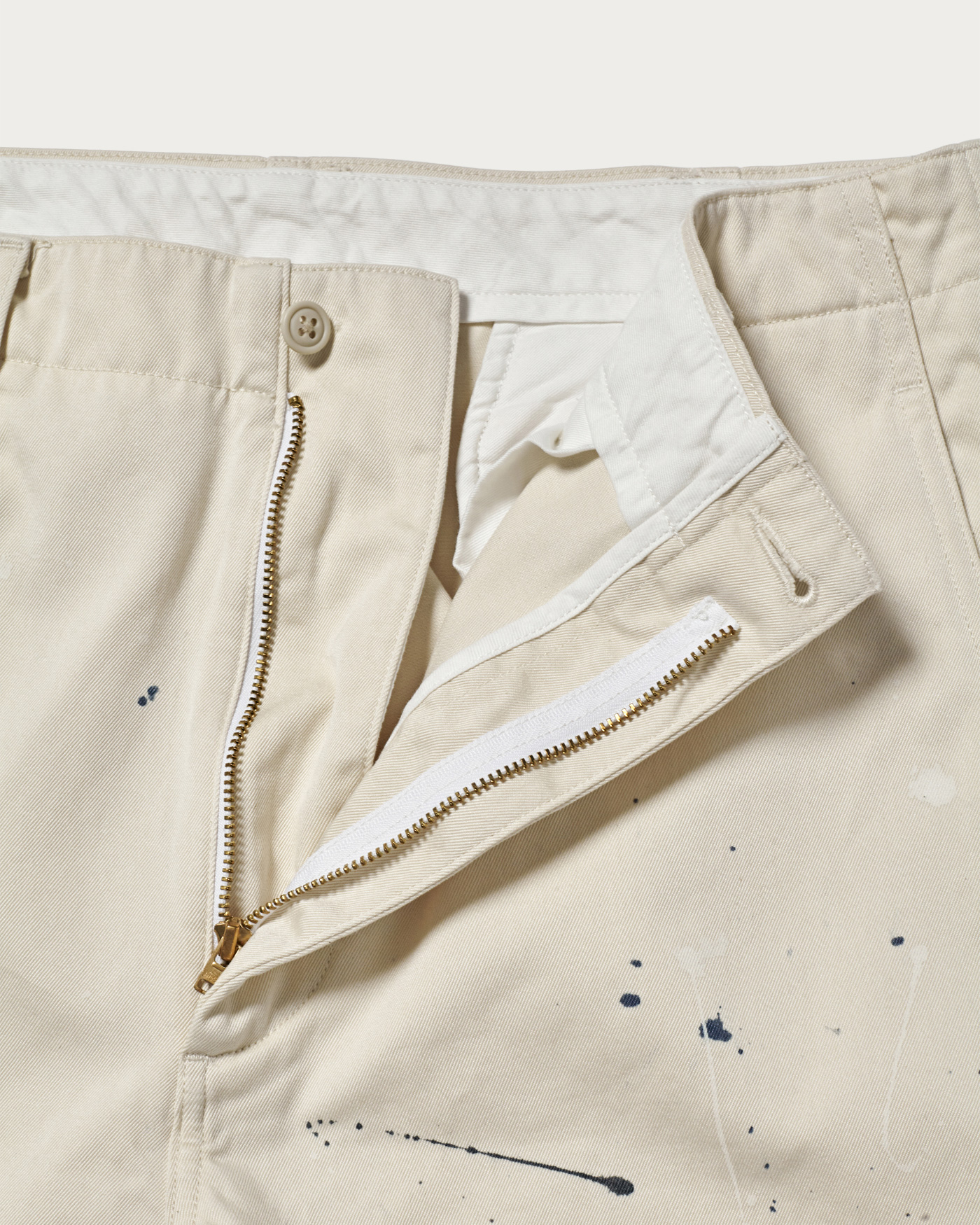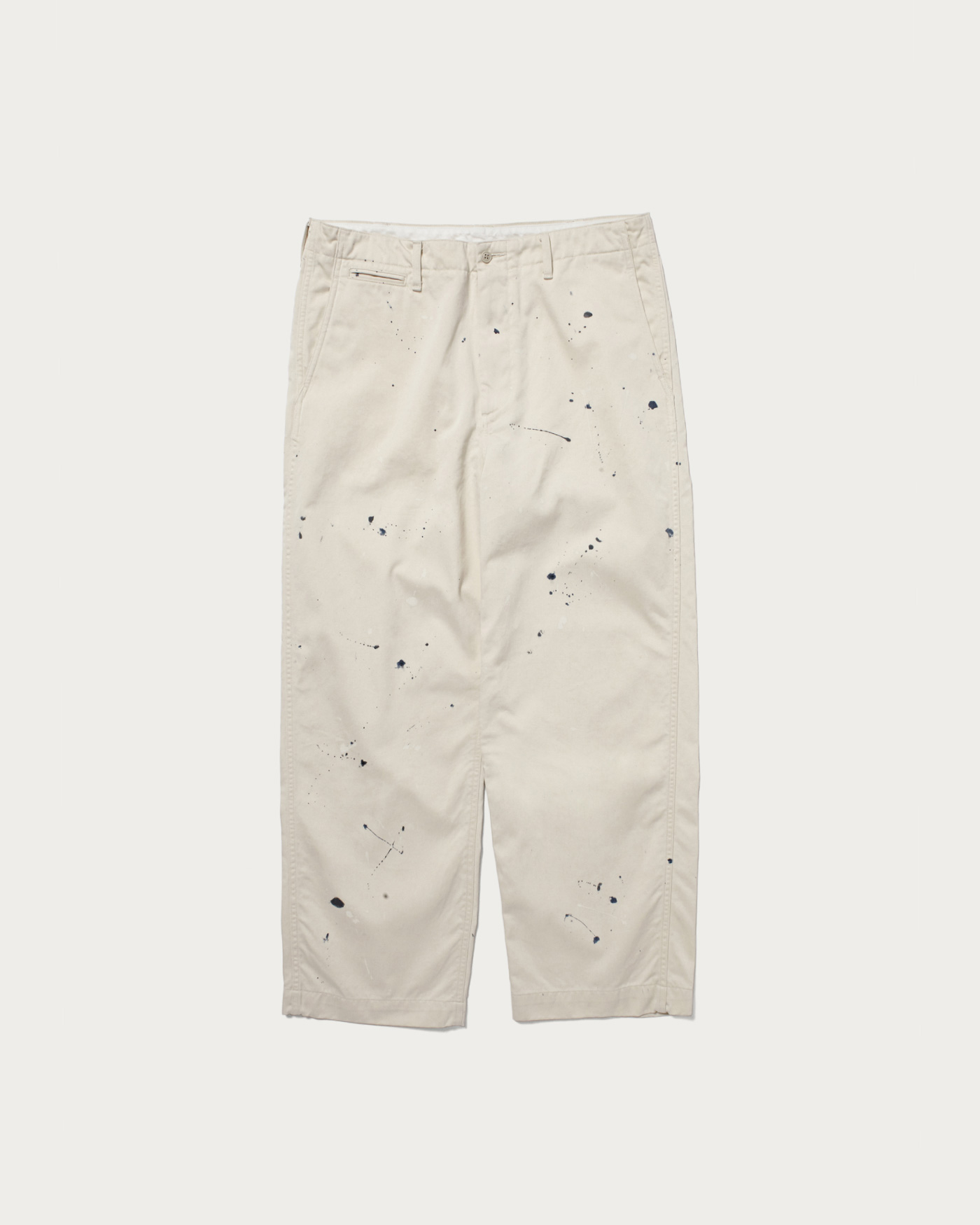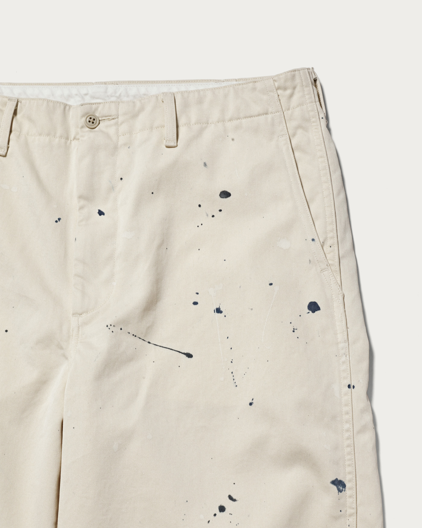 Chino pants made from organic cotton twill fabric. They feature a stone bio-wash finish for a relaxed texture. With ample room around the hips and thighs, they offer a relaxed fit silhouette with a gentle taper. Although they are simple chino pants, the paint splatter design adds a playful touch, making them a unique item. From the fabric to the sewing and processing, this piece is meticulously crafted and proudly "MADE IN JAPAN."