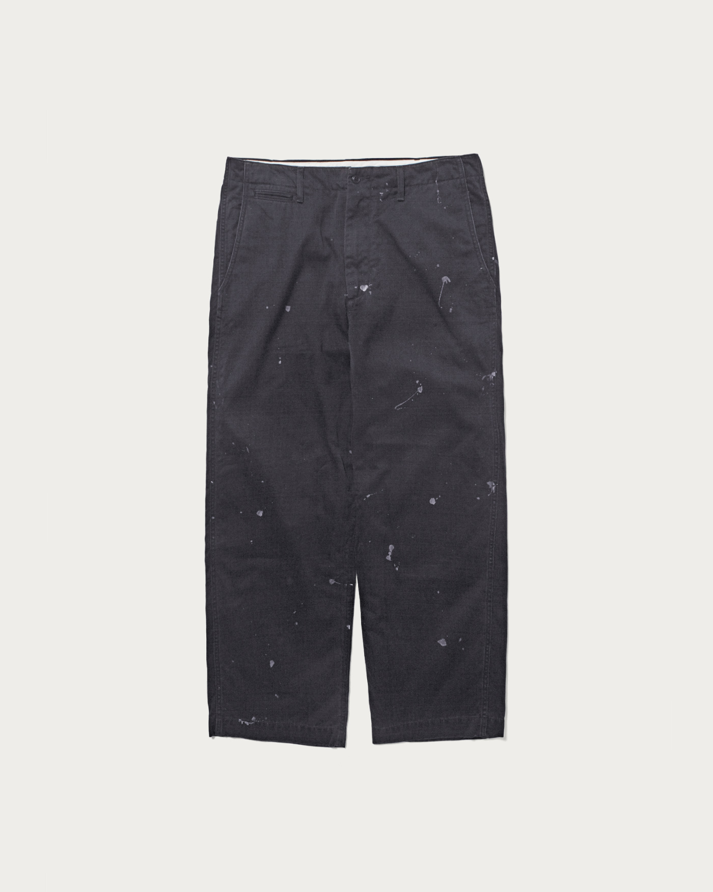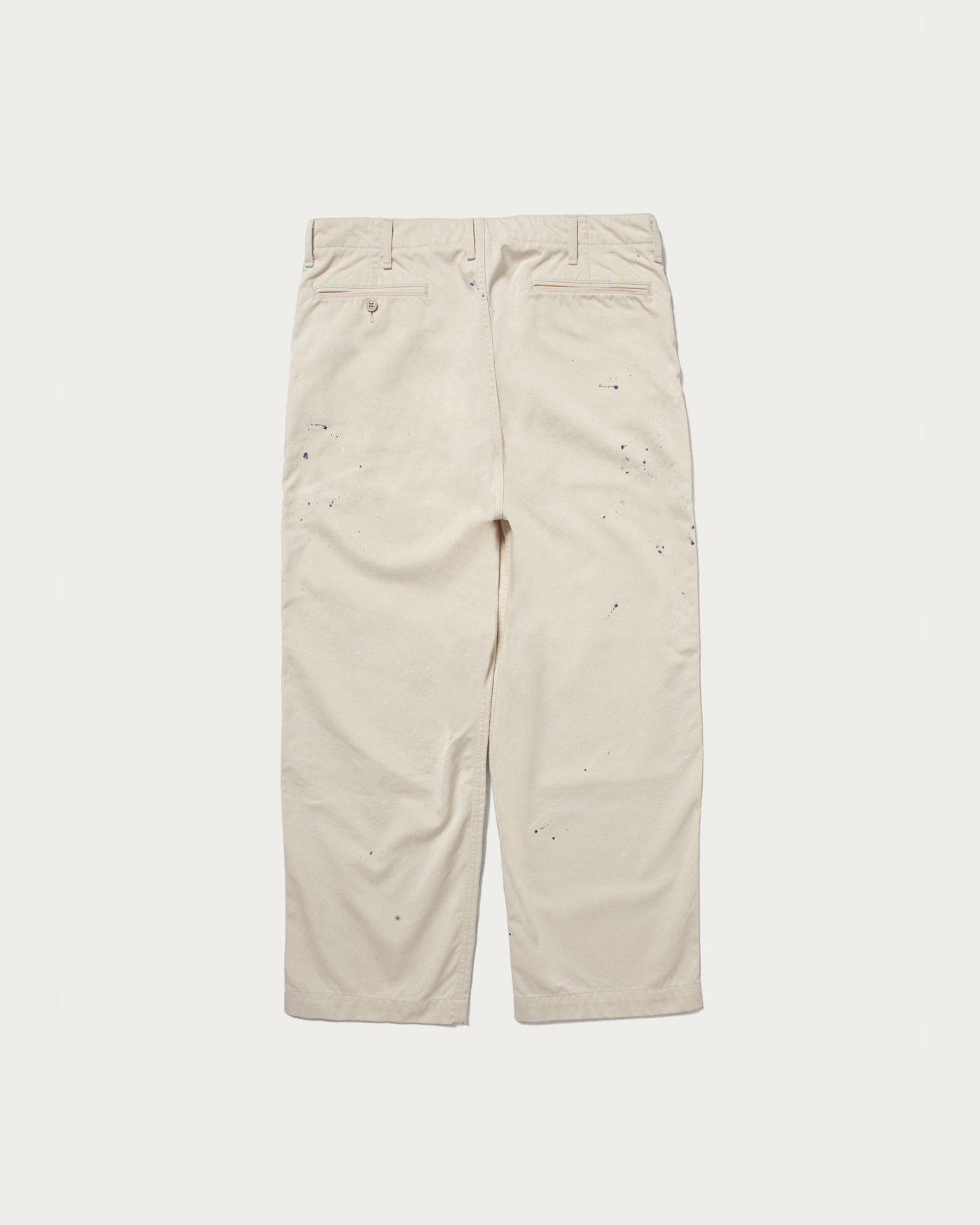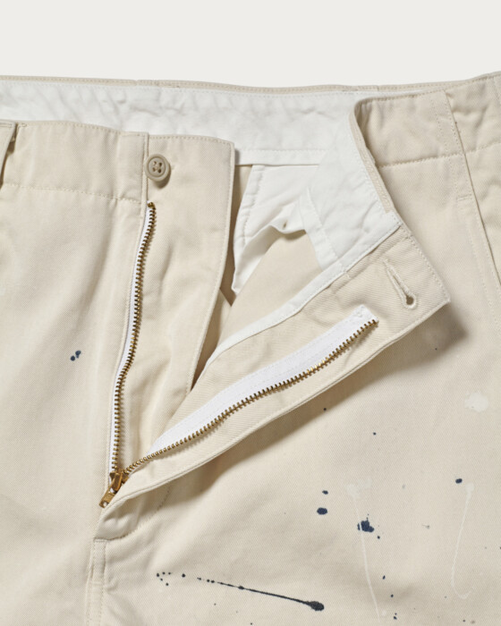 Chino pants made from organic cotton twill fabric. They feature a stone bio-wash finish for a relaxed texture. With ample room around the hips and thighs, they offer a relaxed fit silhouette with a gentle taper. Although they are simple chino pants, the paint splatter design adds a playful touch, making them a unique item. From the fabric to the sewing and processing, this piece is meticulously crafted and proudly "MADE IN JAPAN."
